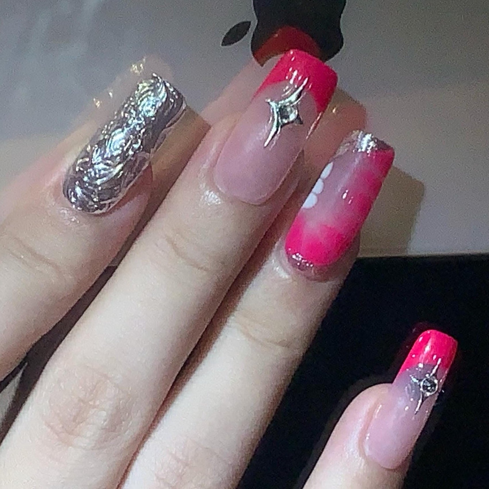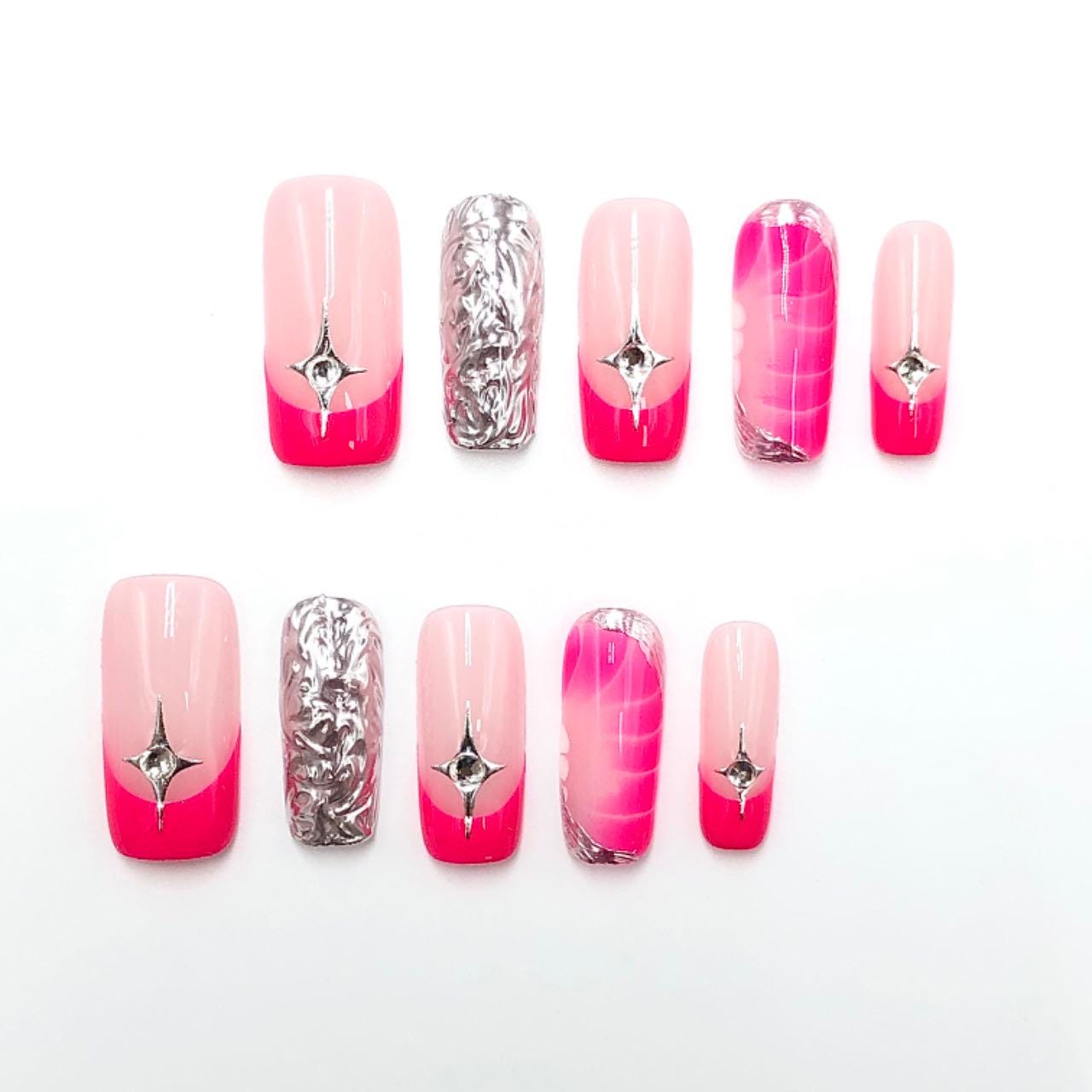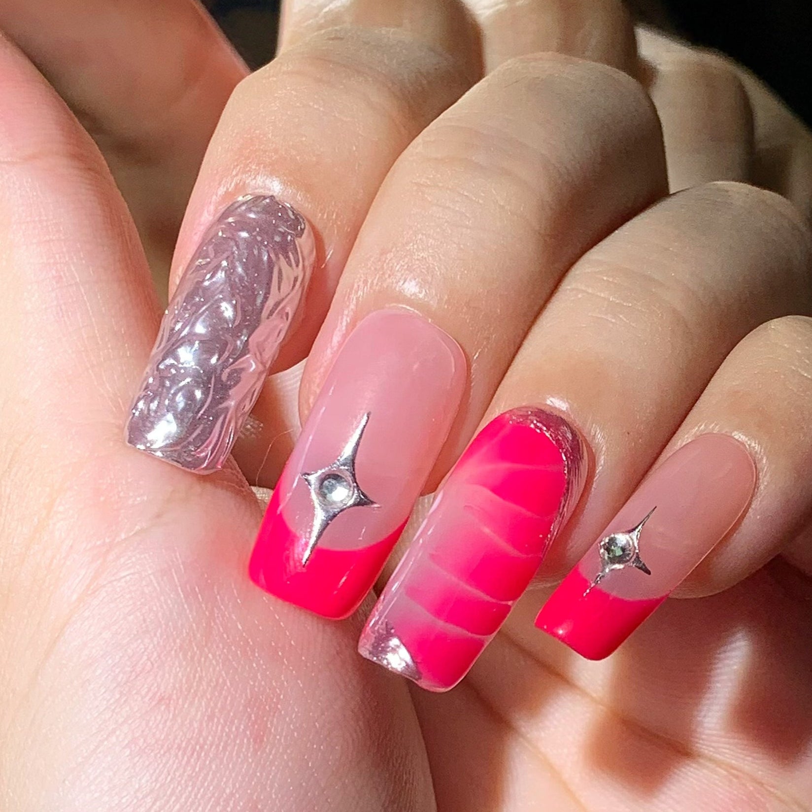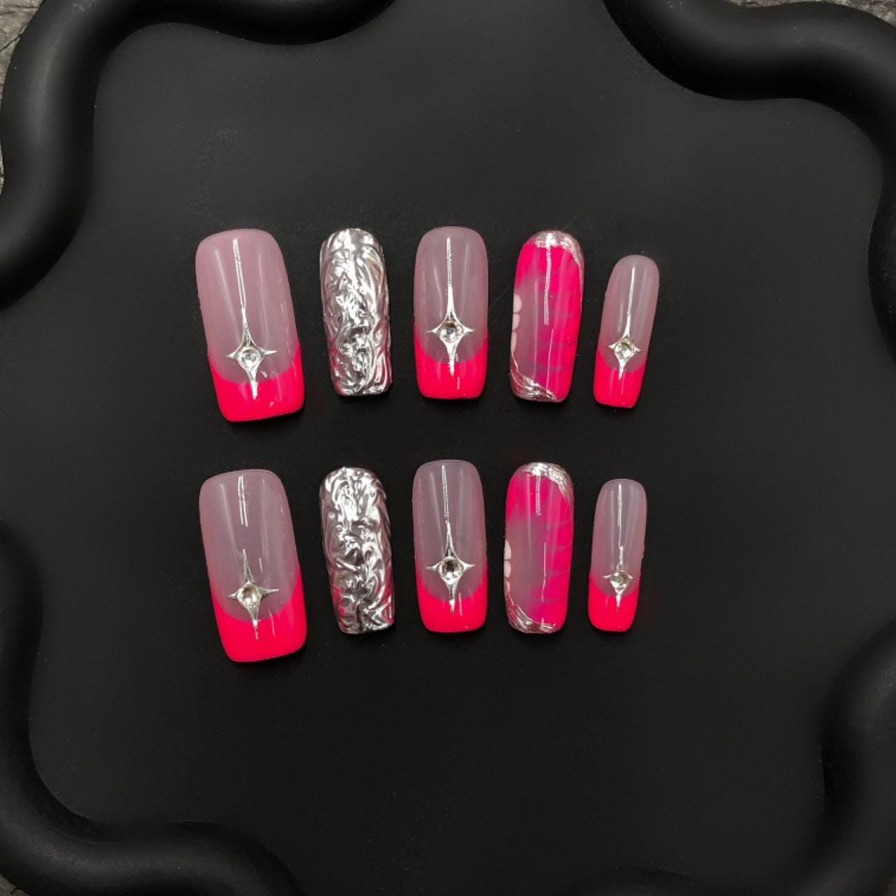 This striking set of press-on nails features a chic blend of soft grey and vibrant hot pink, creating a bold yet elegant ombré effect. Several nails are adorned with silver foil texture and raised metallic chrome designs, adding depth and a futuristic vibe. Star-shaped rhinestones provide a touch of sparkle and glam, making the nails perfect for a night out or a statement look. The glossy topcoat enhances the contrast and gives the set a sleek, polished finish. Set against a wavy-edged black background, the design pops with modern sophistication.