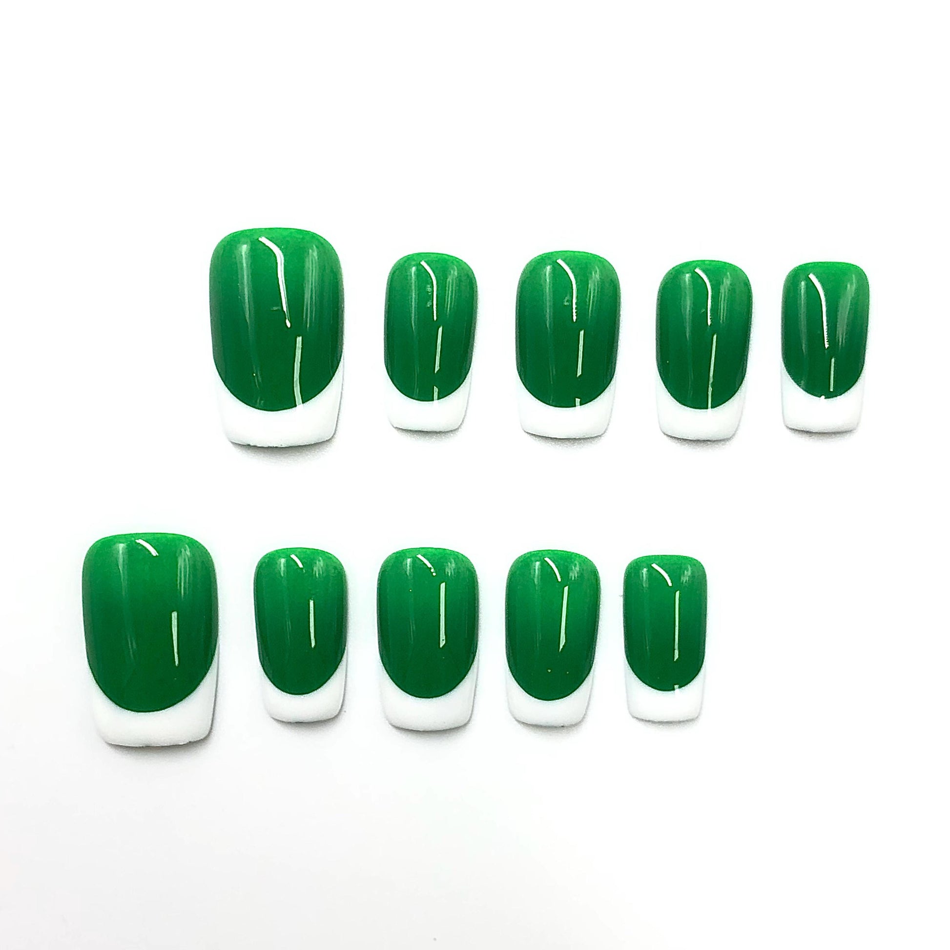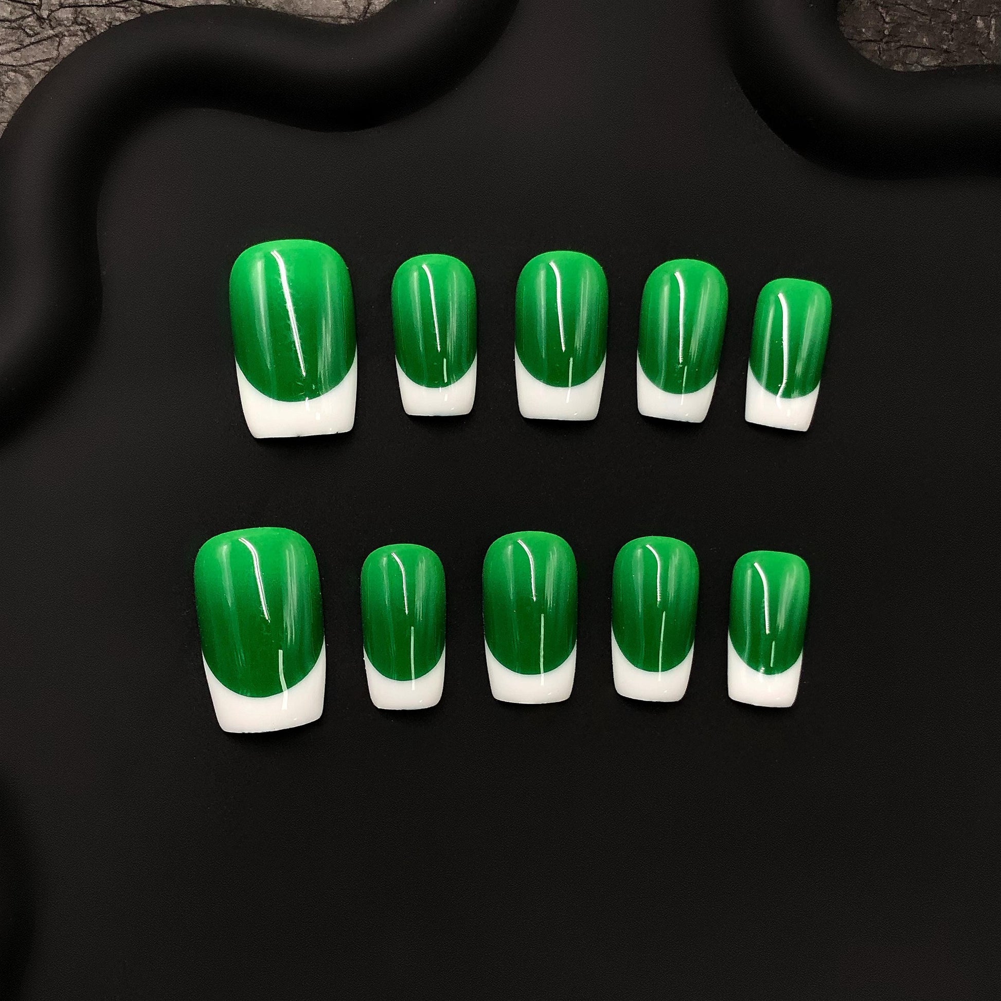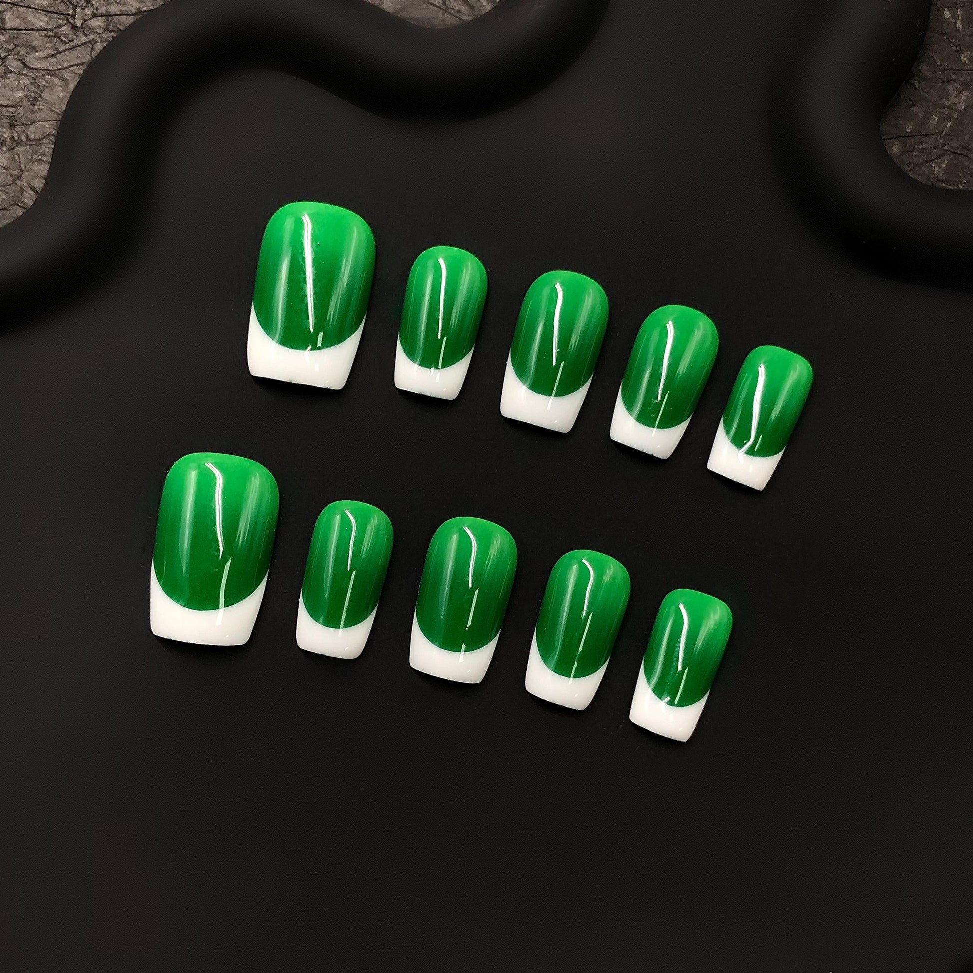 A set of press-on nails featuring a modern green French tip design on a glossy square-shaped base. The nails have a vibrant green color with a clean white tip, offering a stylish and sophisticated look suitable for various occasions.