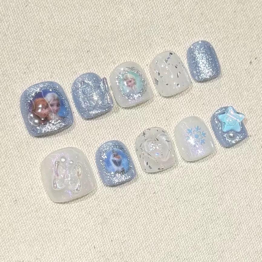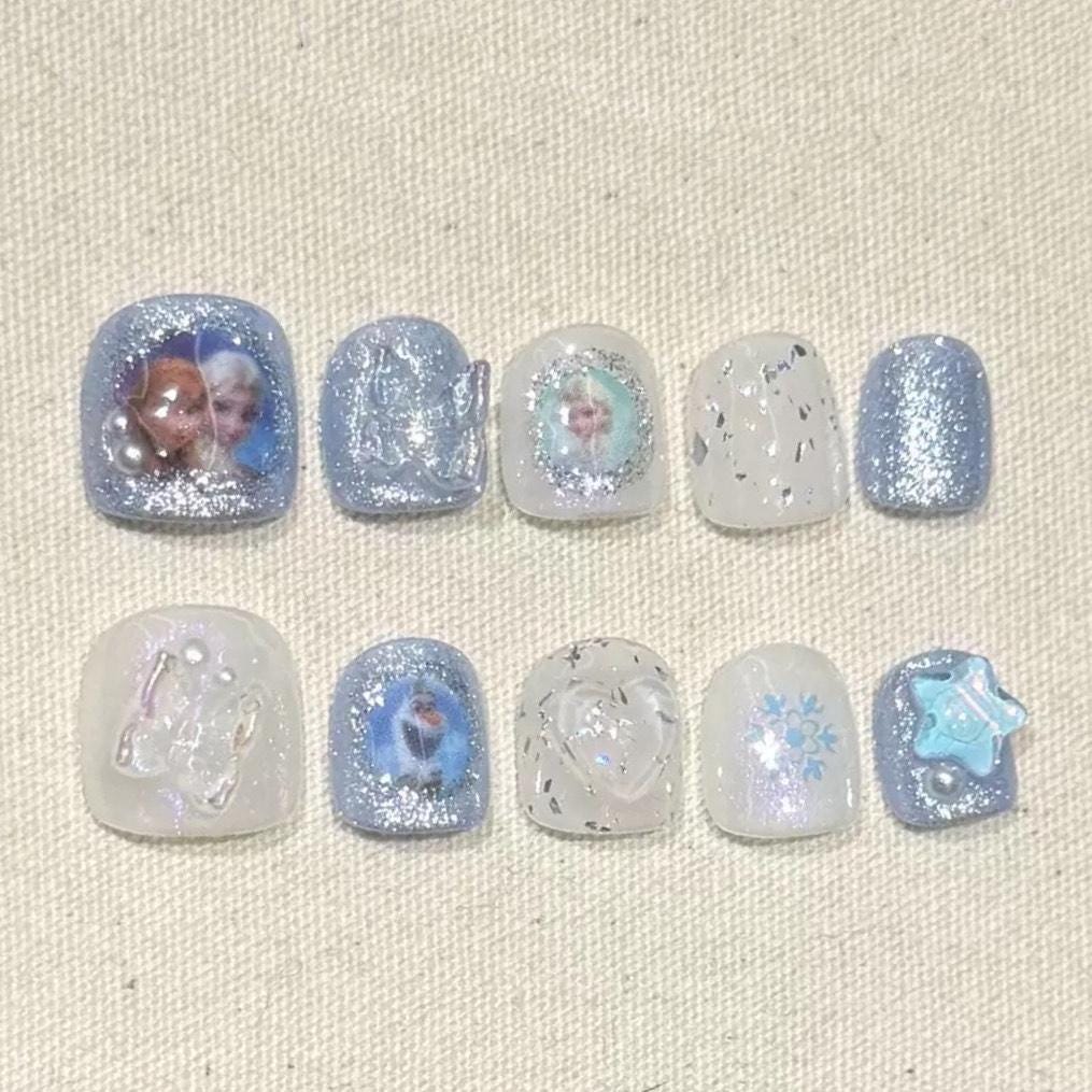 Princess Glitter Blue Press On nails for Kids Elsa Olaf Winter Snowflake Nail Set. Artificial reusable fake faux manicure nails trendy art.