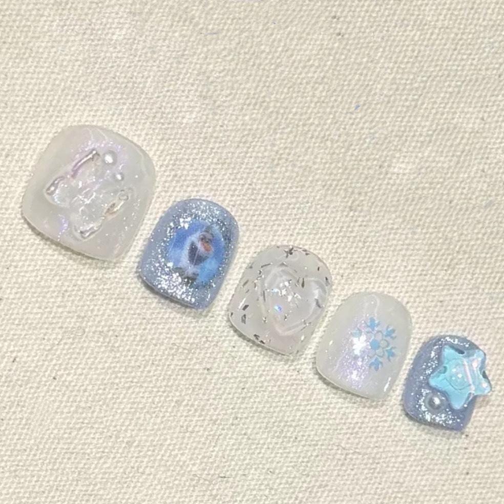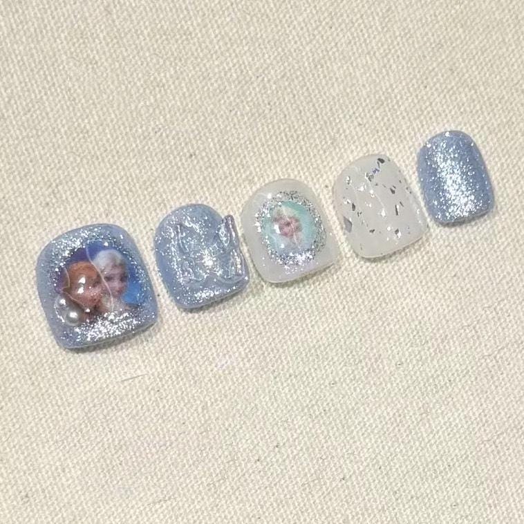 Let your little one sparkle like a snow queen with these Frozen-inspired glitter press-on toenails! This adorable kids nail set features blue and white shimmer bases, silver foil accents, snowflakes, and charming character art of Elsa, Anna, and Olaf. Each piece is designed for tiny toes with a magical winter wonderland vibe—perfect for parties, playtime, or dress-up days. These press-ons are easy to apply and remove, making them ideal for gentle, reusable wear.