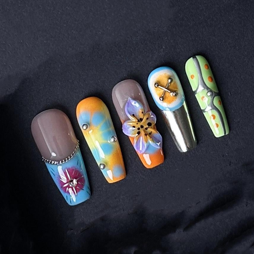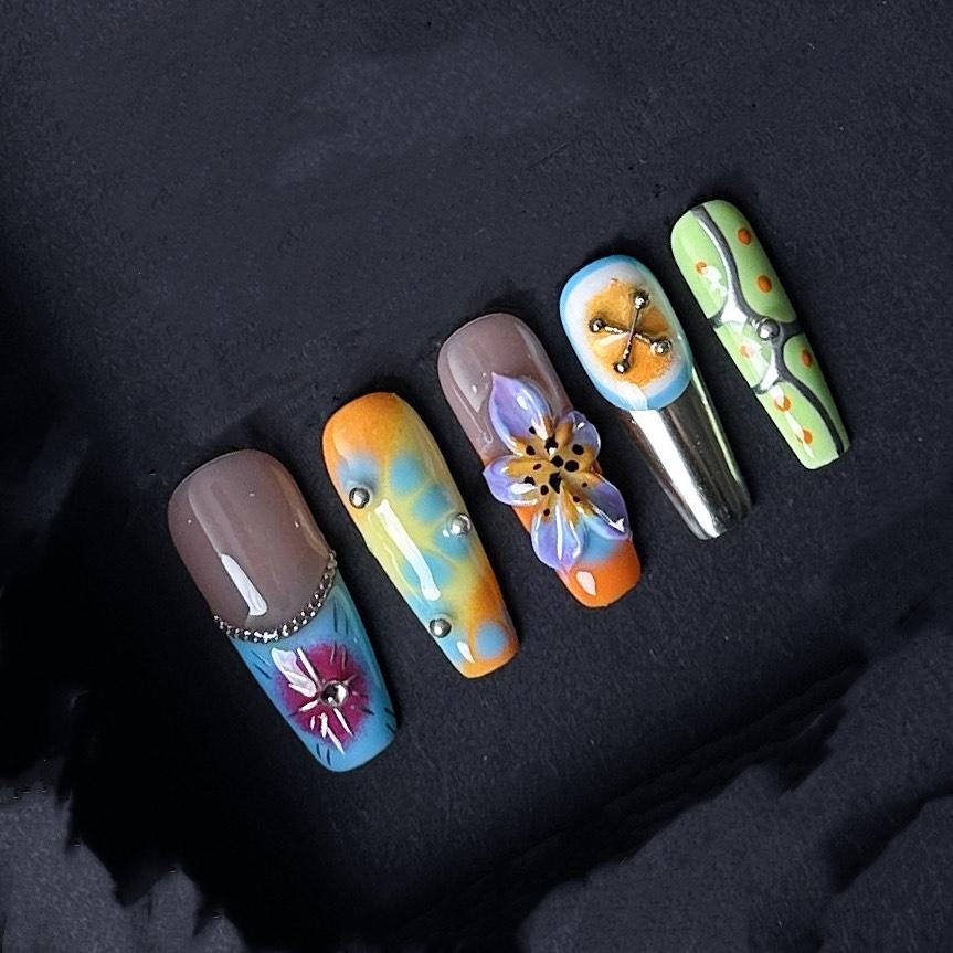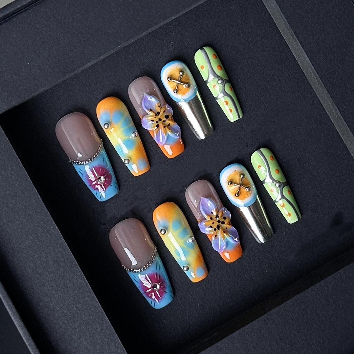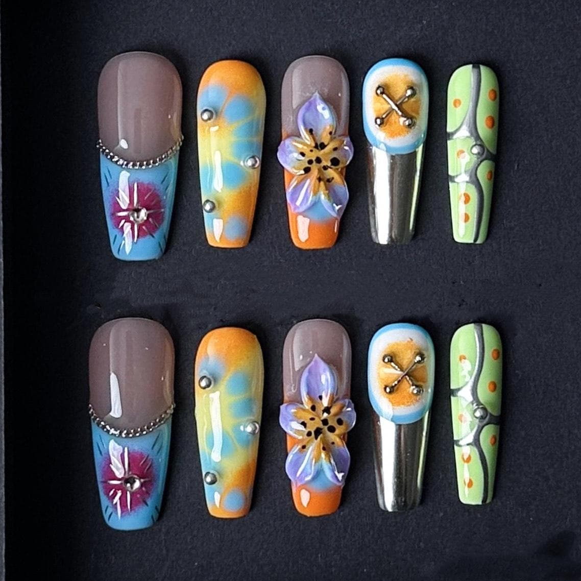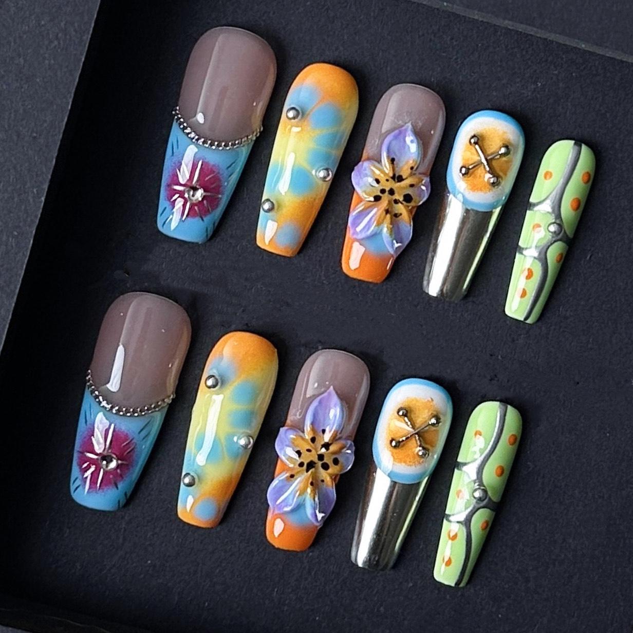 Step into a vibrant retro vibe with this psychedelic press on nail set featuring bold neon colors 3d floral accents and funky groovy designs. Each nail showcases a unique mix of hand painted detail rhinestones and sculpted flower art for a one of a kind set that channels 70s flower power energy. With a palette of orange blue green and metallic silver these nails are perfect for festivals photo shoots or anyone who loves artistic bold statement nails. Handmade with high quality gel and reusable.
