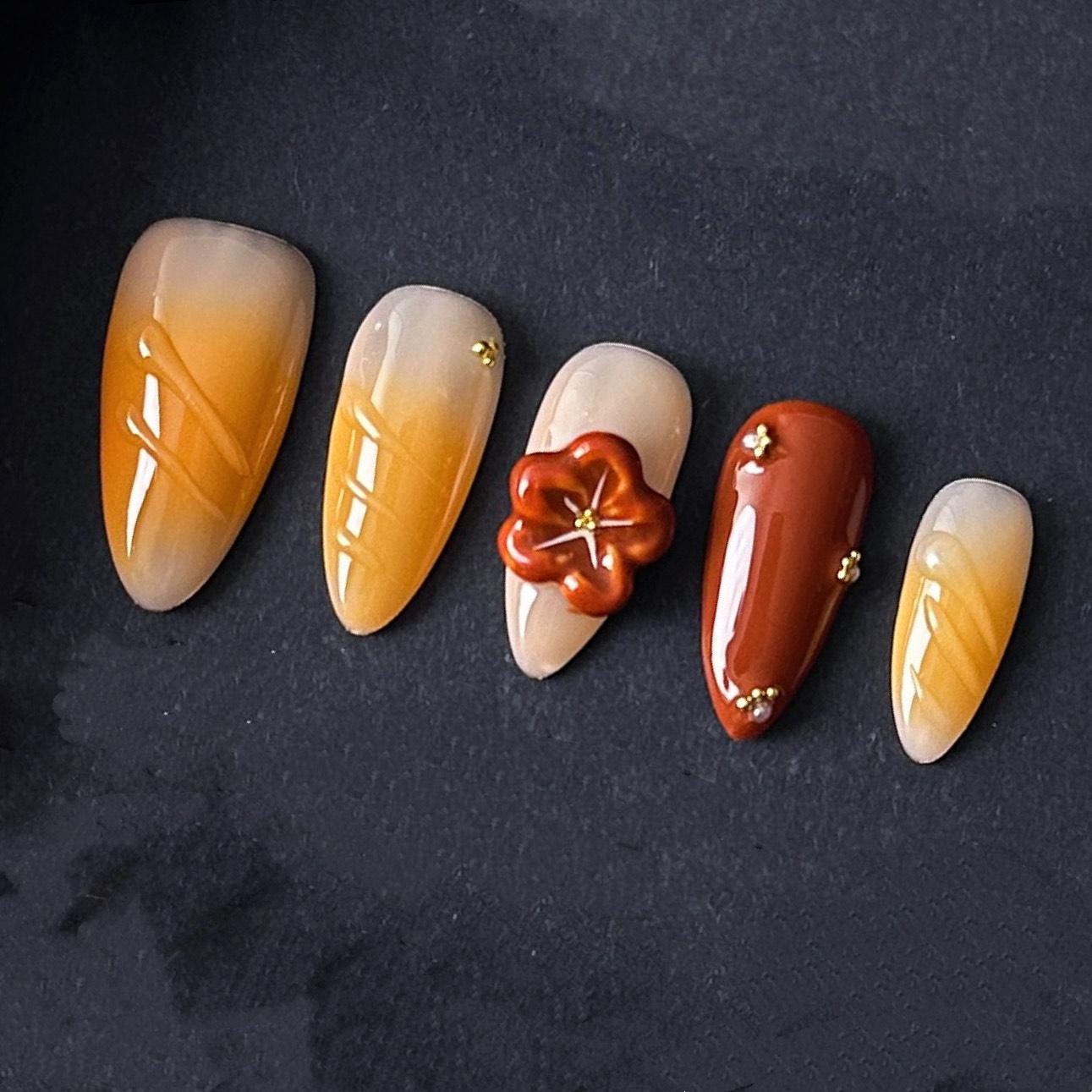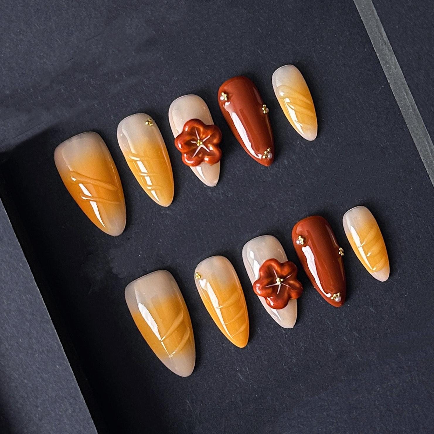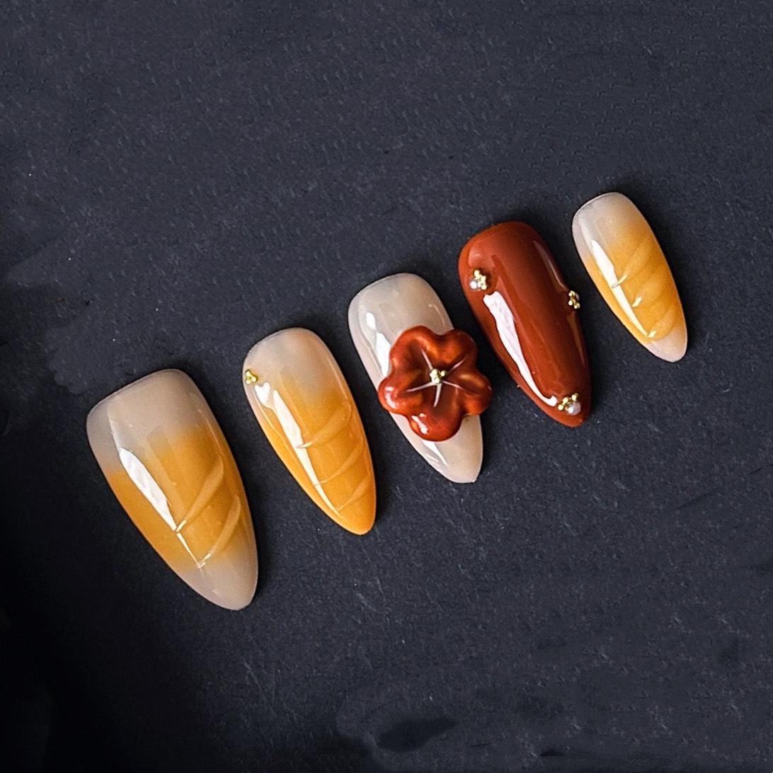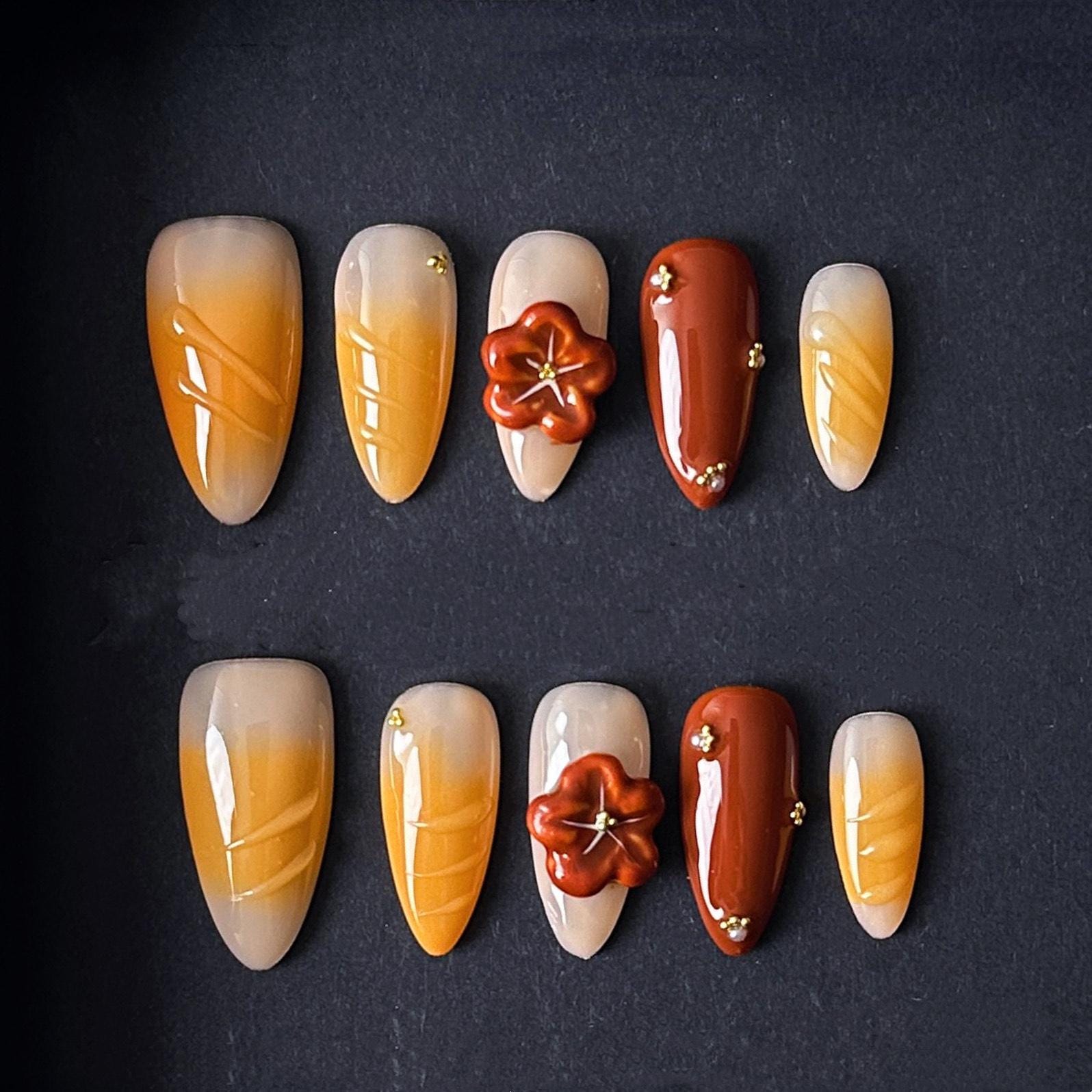 Capture the cozy charm of fall with this pumpkin spice-inspired press-on nail set. Featuring a rich palette of warm oranges, soft neutrals, and deep browns, these nails blend autumnal elegance with playful detail. A swirling design adds dynamic texture, while a bold 3D floral accent offers a charming focal point. Perfect for sweater weather, seasonal outings, or festive fall aesthetics, these nails bring warmth and style to every fingertip.