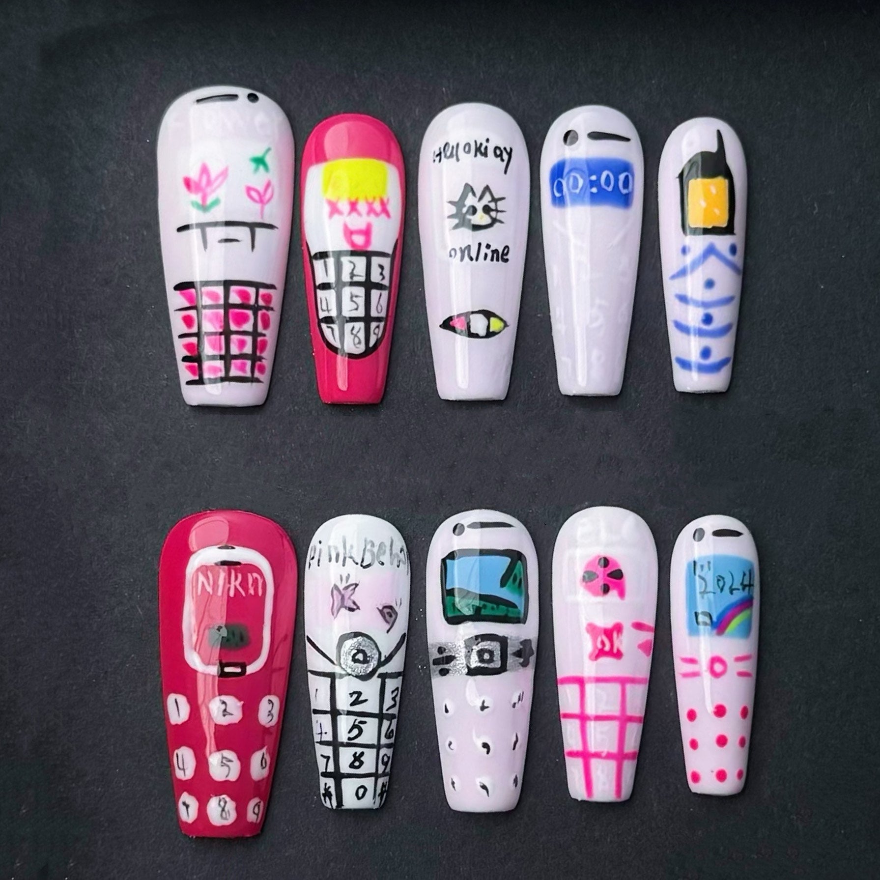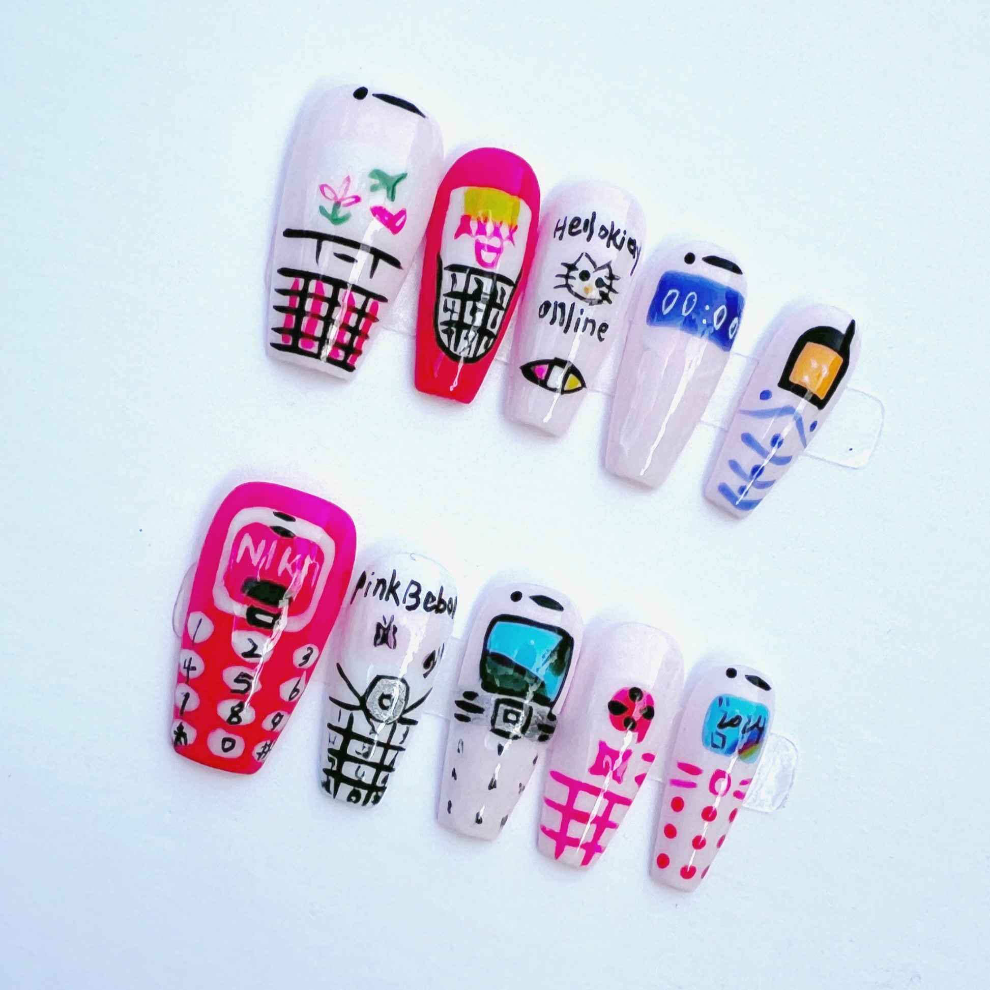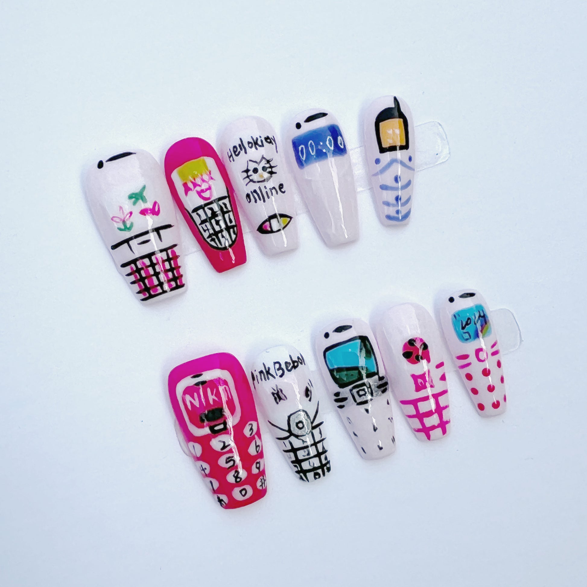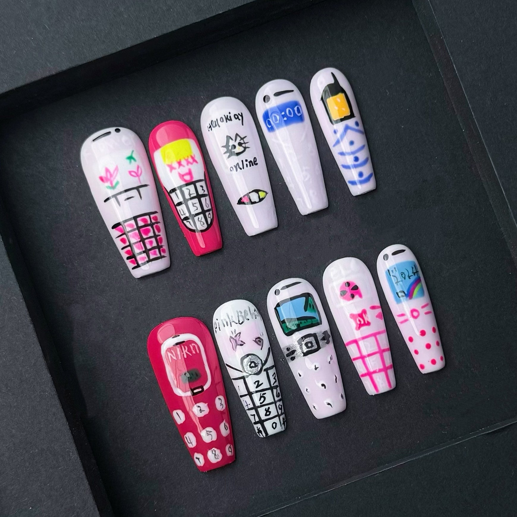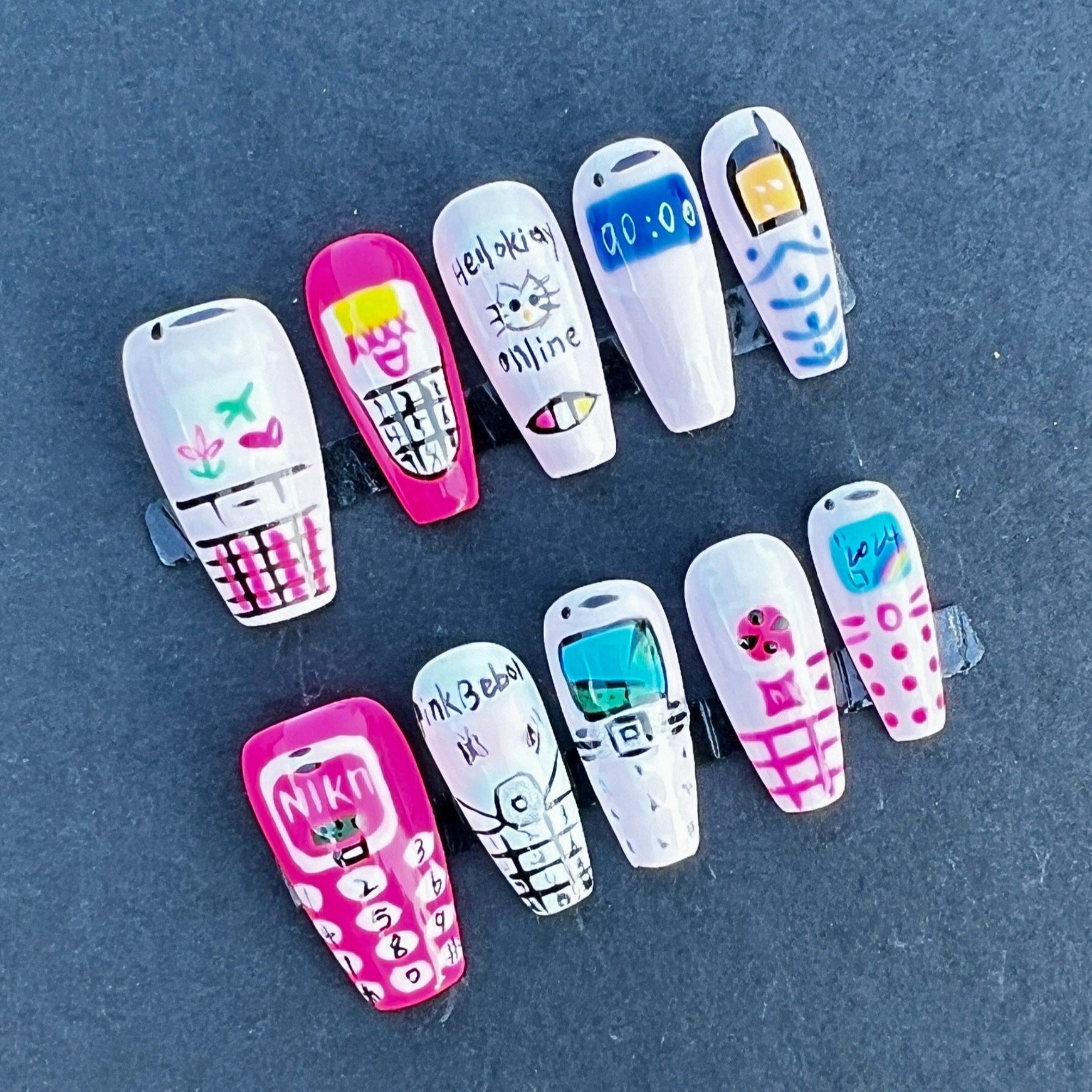 Step into a nostalgic time warp with this ultra-unique set of retro cellphone press-on nails! Inspired by the blocky charm of 90s and early 2000s flip phones, each nail features a hand-painted design mimicking old-school mobile phone keypads, screens, and whimsical details like pixel icons and mini text graphics.