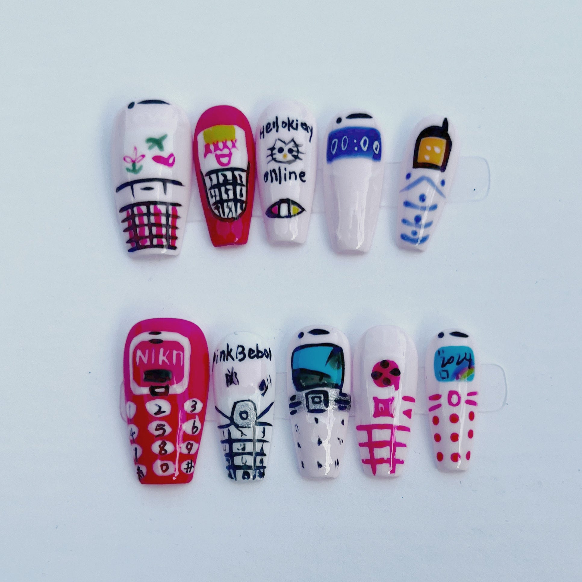 Retro Cellphone Press On Nails – Hand Painted 90s Y2K Flip Phone Design Nails Cute Quirky Kawaii Nail Art Set