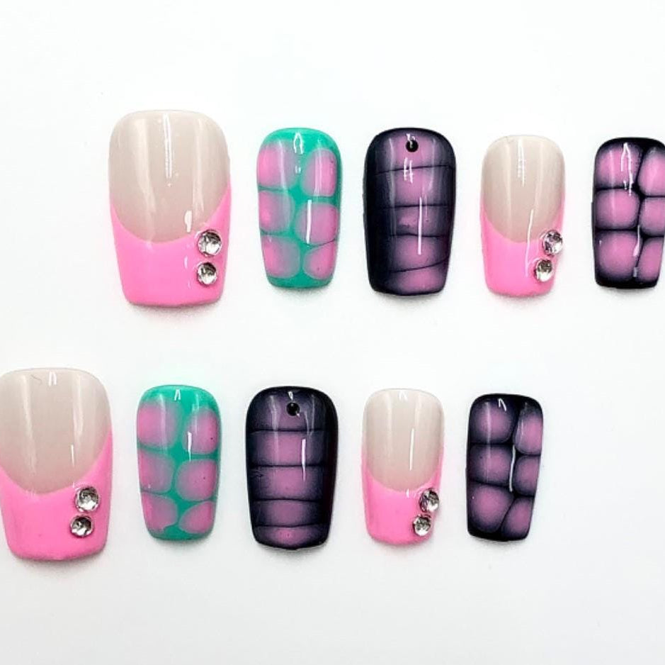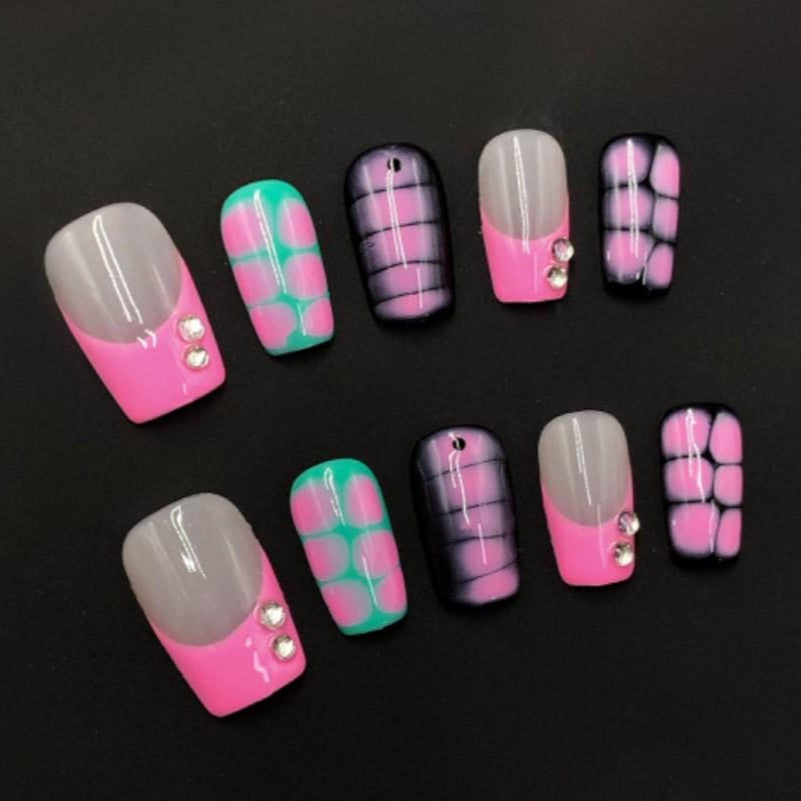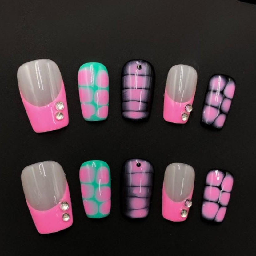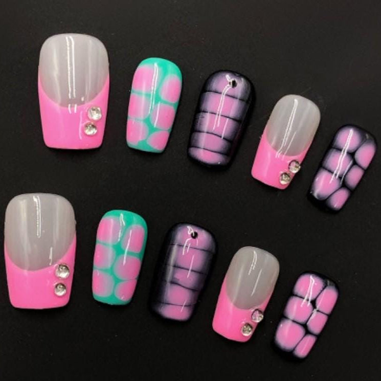 Bring playful retro vibes to your fingertips with this fun and funky press-on nail set! Featuring a bold mix of pink grid lines, teal polka dots, and sleek gray-pink color blocking with rhinestone accents, these short square nails are perfect for adding a splash of color and charm to any outfit. Ideal for everyday wear or a creative style statement.