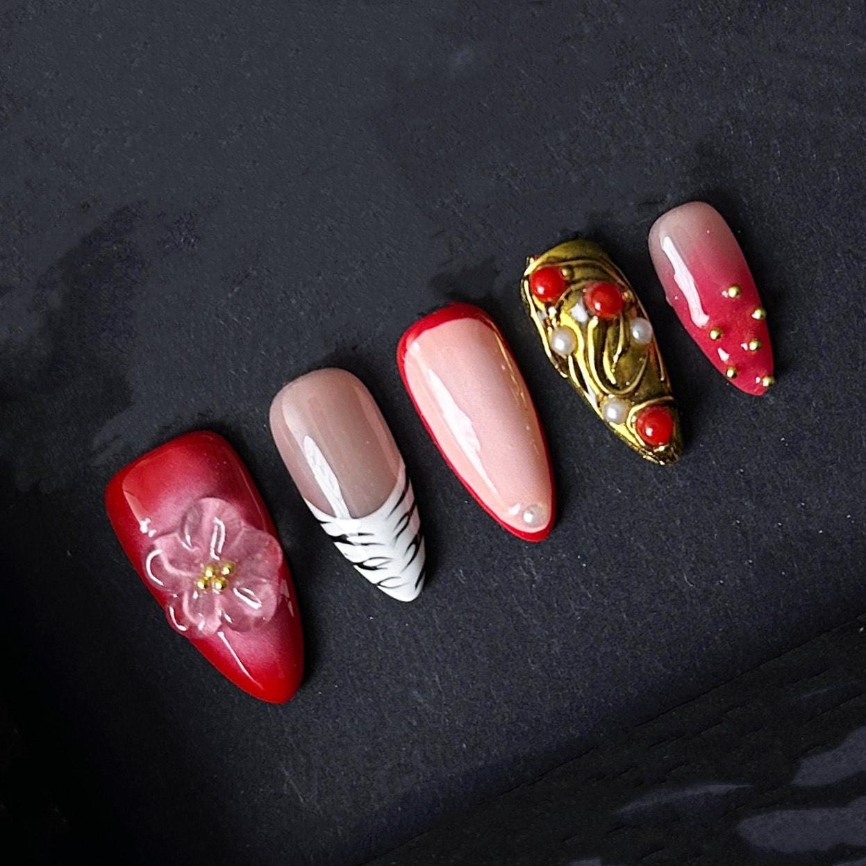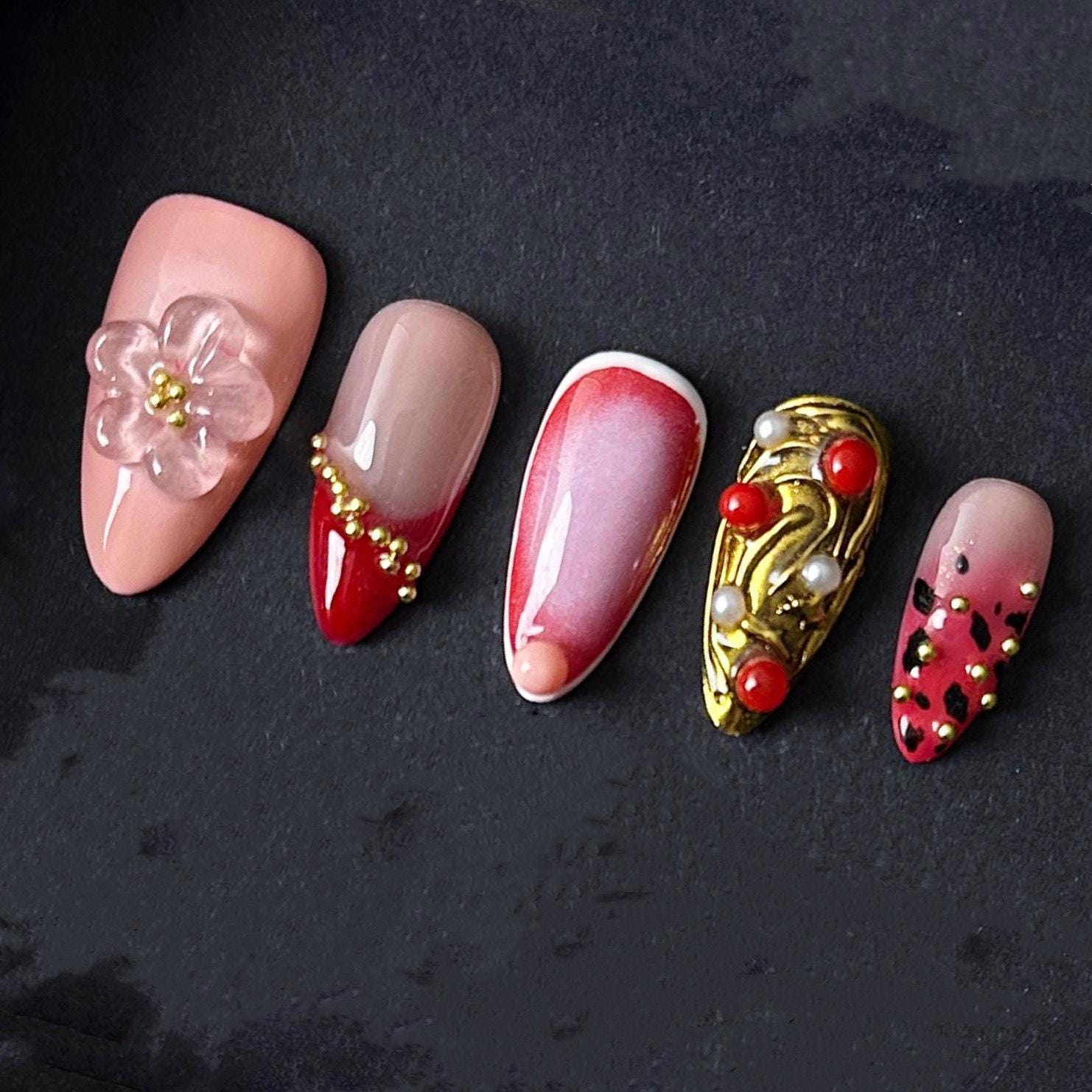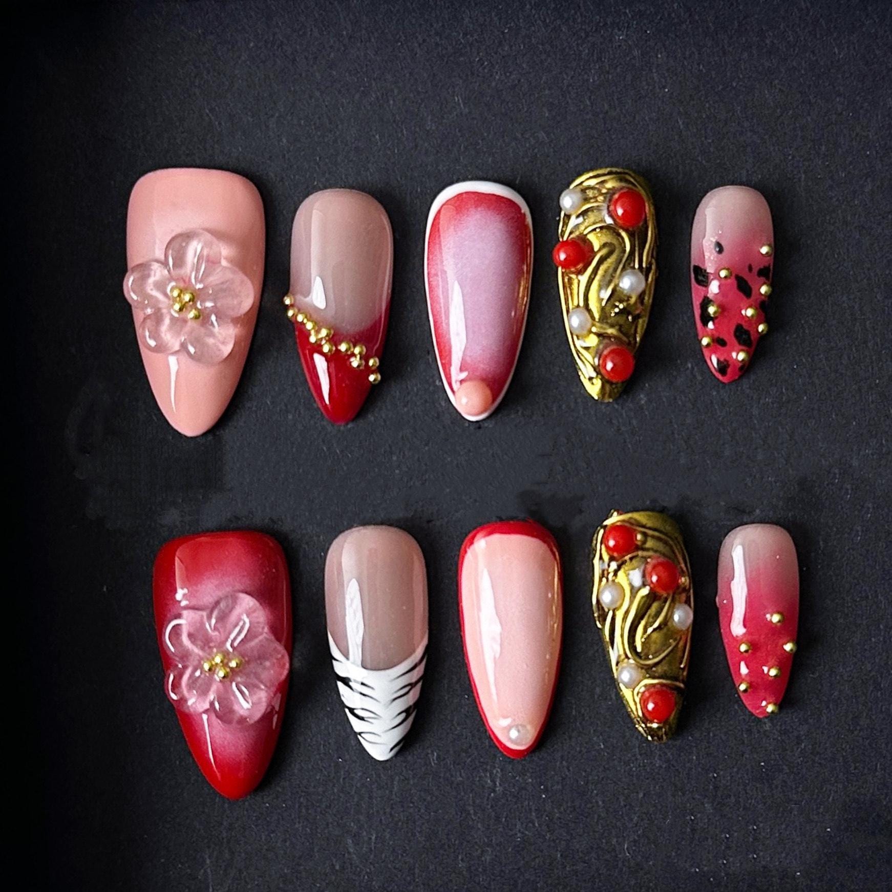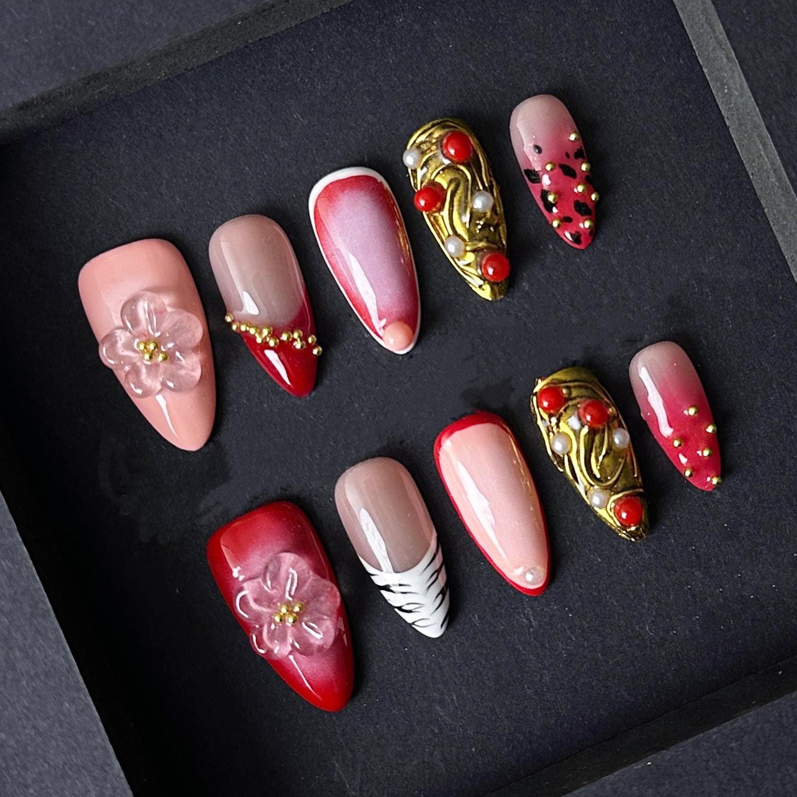 This bold and elegant set of press on nails is a stunning fusion of romance and glamour. Featuring a rich red and nude ombré base, each nail is uniquely adorned with luxurious details: 3D sculpted flowers, shimmering pearls, metallic gold swirls, and tiny gold beads. Some nails incorporate soft animal print and gradient fades, while others showcase a high-shine ombré glow. Finished with glossy topcoats and various almond and stiletto shapes, this handmade set is perfect for special occasions, Valentine’s Day, or adding a decadent statement to your style.