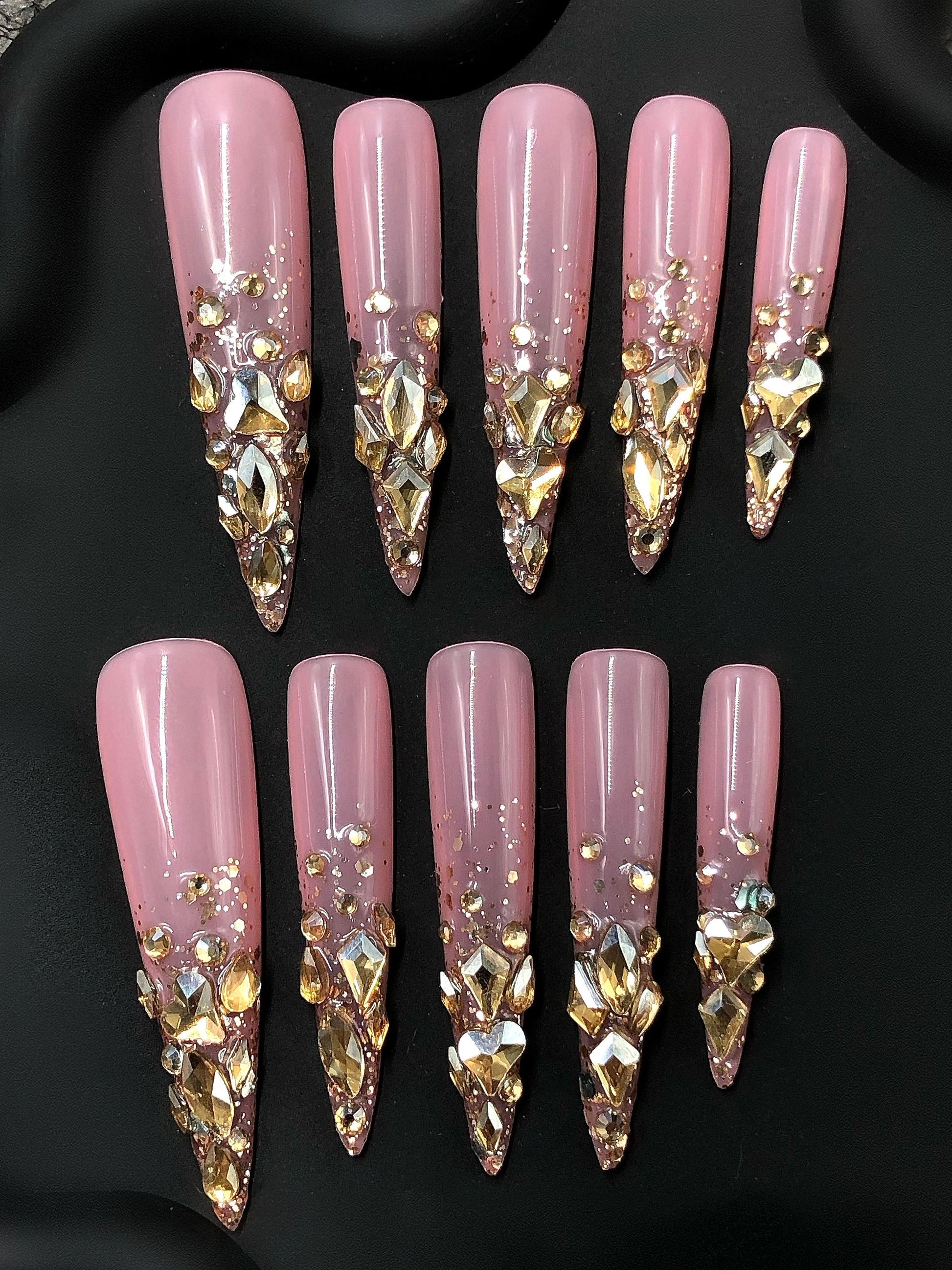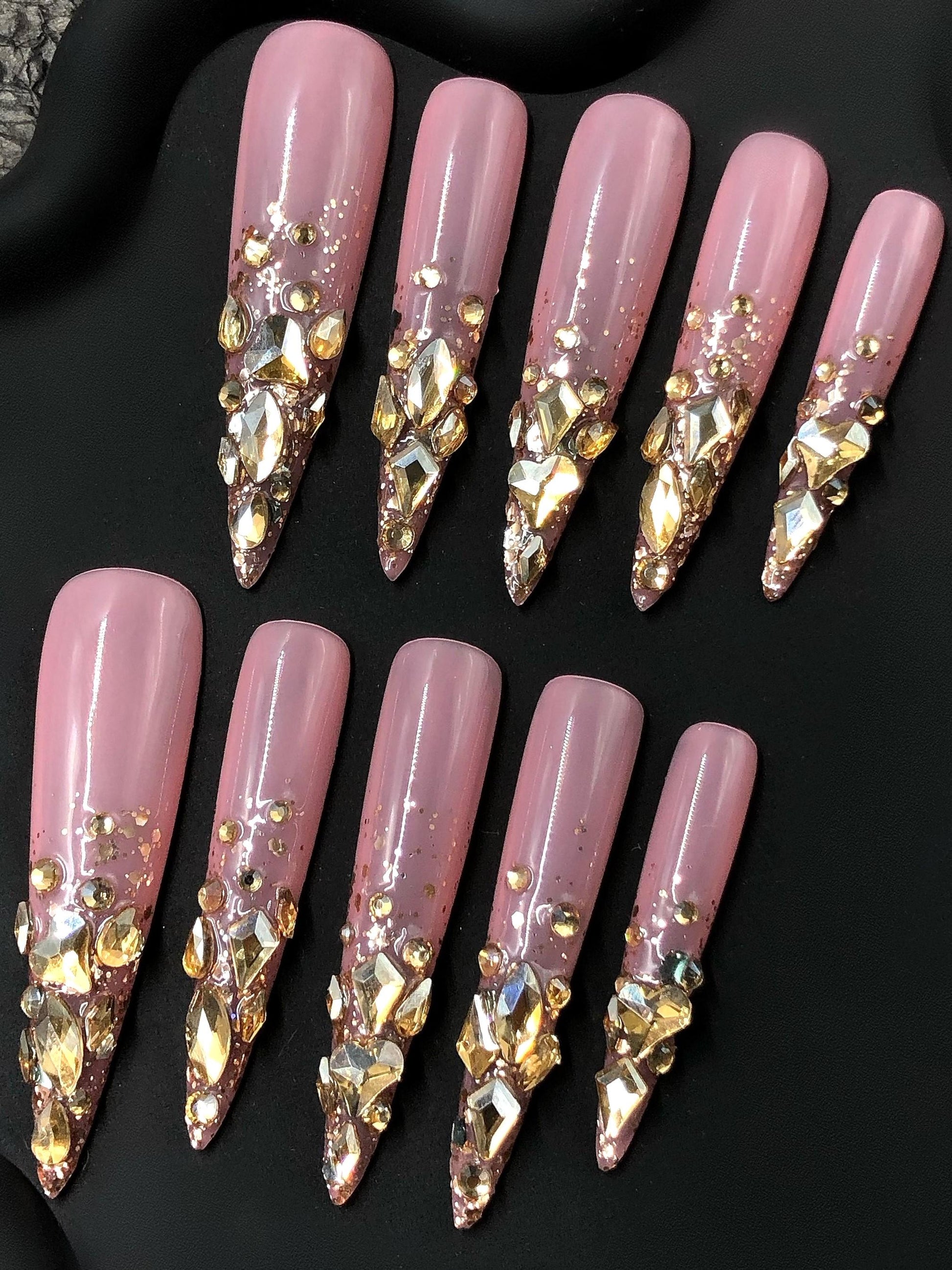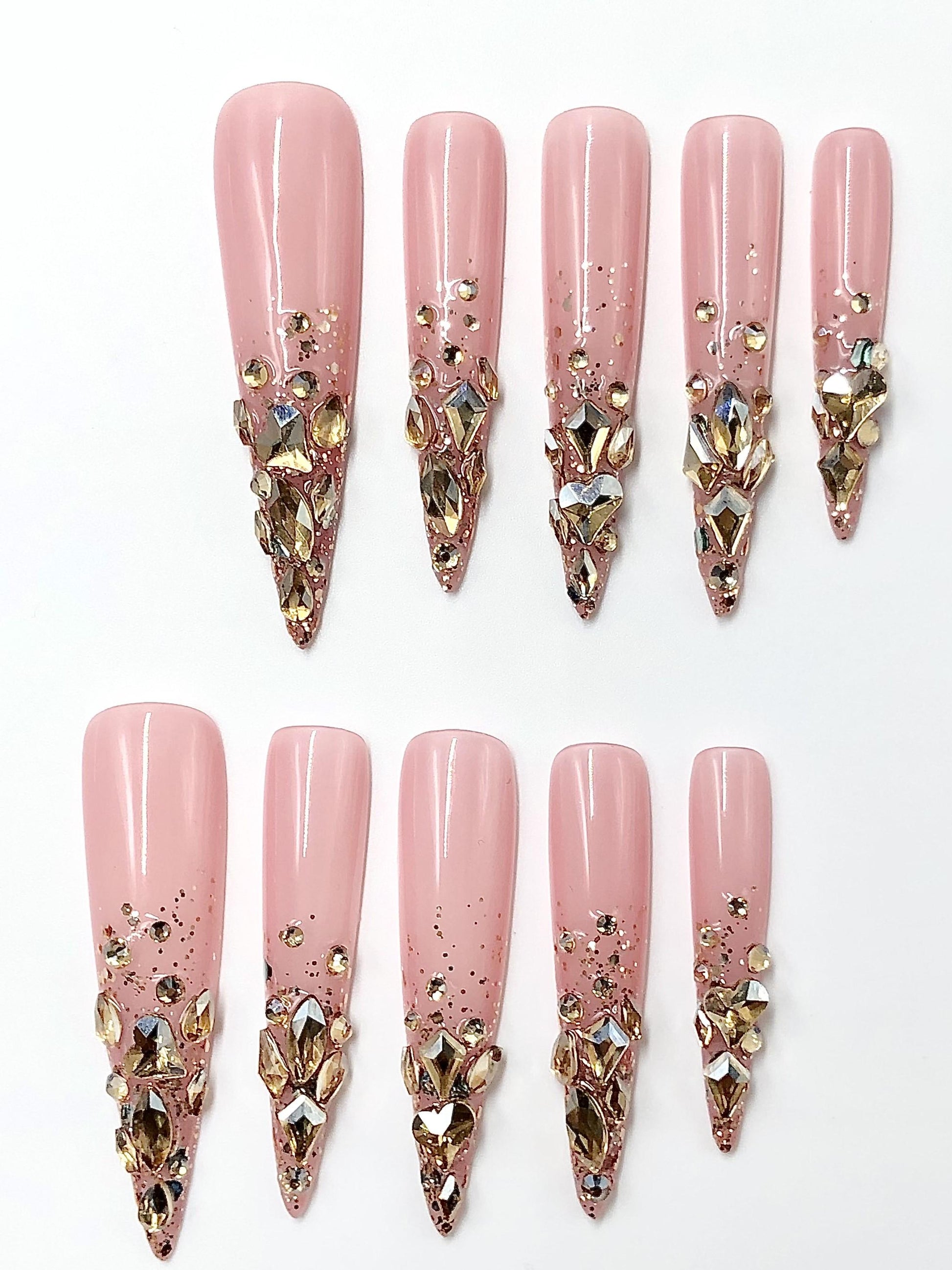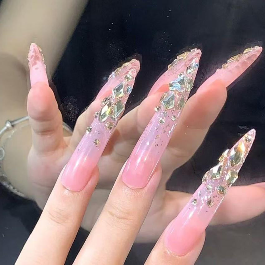 Turn every gesture into a statement with these glamorous rose quartz-inspired press-on nails. Featuring a soft pink base fading into a dazzling explosion of gold and crystal rhinestones, these long nails exude elegance and extravagance. Ideal for weddings, parties, or when you want to add sparkle to your day, they offer salon-quality glam in minutes.