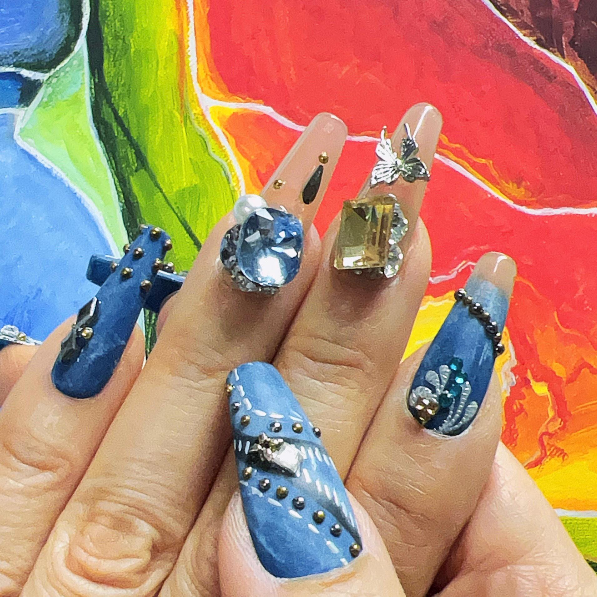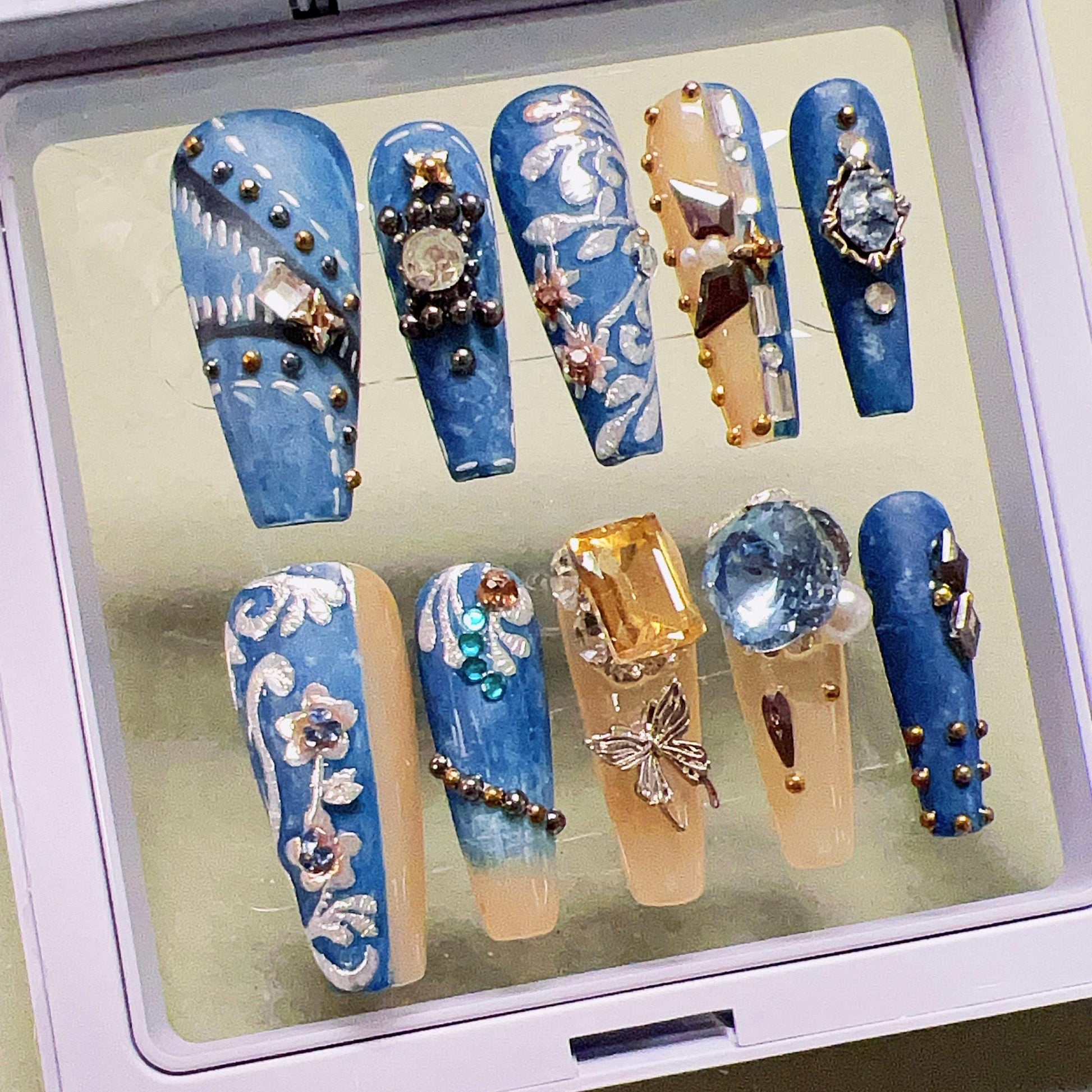 This luxurious press-on nail set features a regal combination of matte royal blue and soft nude tones, adorned with intricate white baroque floral patterns and dazzling 3D embellishments. Each nail showcases unique artistry—from glittering gold and silver rhinestones to sculptural butterflies, pearls, and oversized gem accents. The blend of textures and tones creates an opulent, couture-inspired look perfect for formal occasions, photo shoots, or fashion-forward everyday wear. These long, squared tips offer both elegance and a bold statement in a reusable, high-end design.