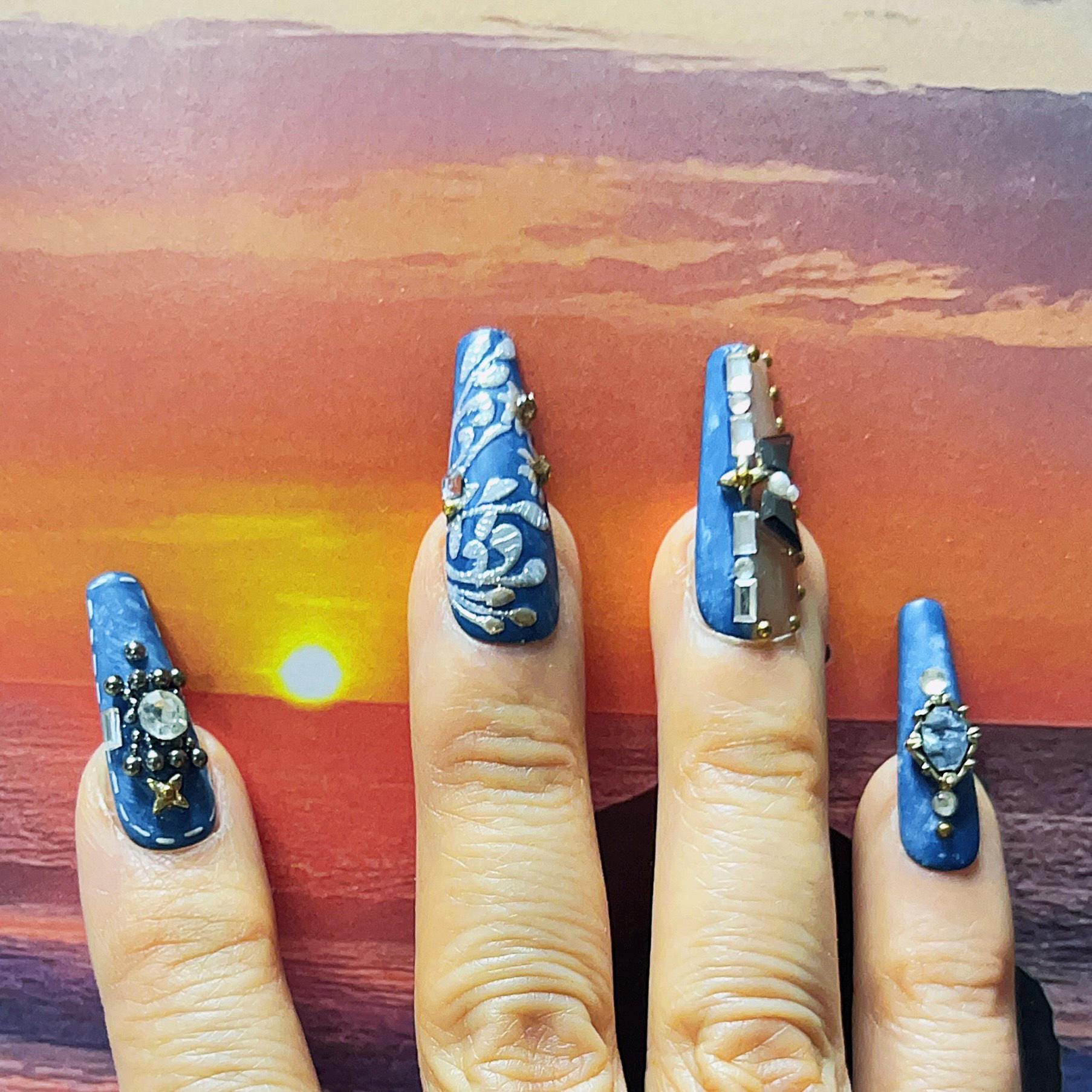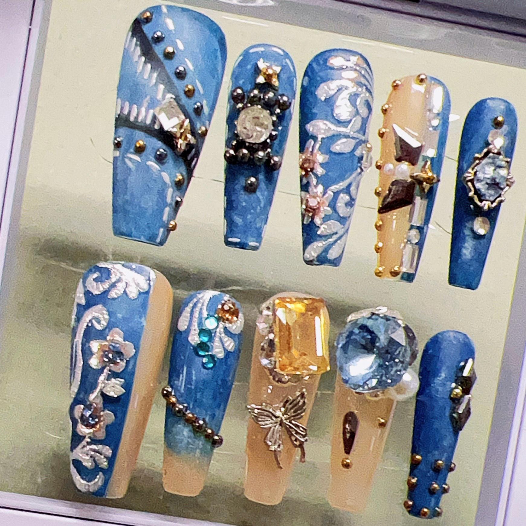Royal Blue and Nude Baroque Gem Press-On Nails with 3D Embellishments. Artificial reusable fake glue on faux manicure nails trendy art.