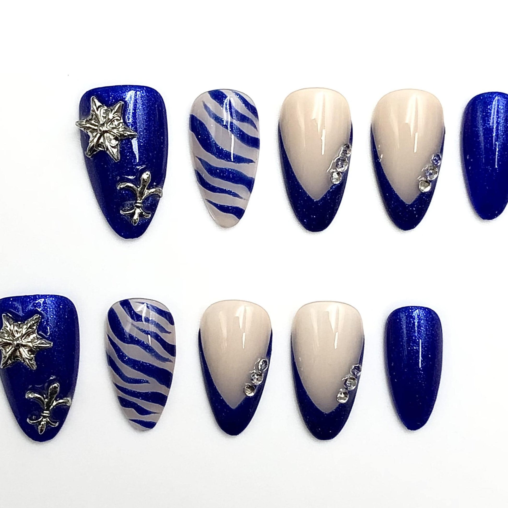 Unleash your inner queen with this stunning press-on nail set featuring deep royal blue glitter, nude v-tips, and bold zebra stripe accents. Adorned with silver starburst and fleur-de-lis charms, plus delicate rhinestones for added sparkle, this design delivers fierce elegance with a glam edge. Perfect for fashion-forward nights, parties, or making a luxe statement.