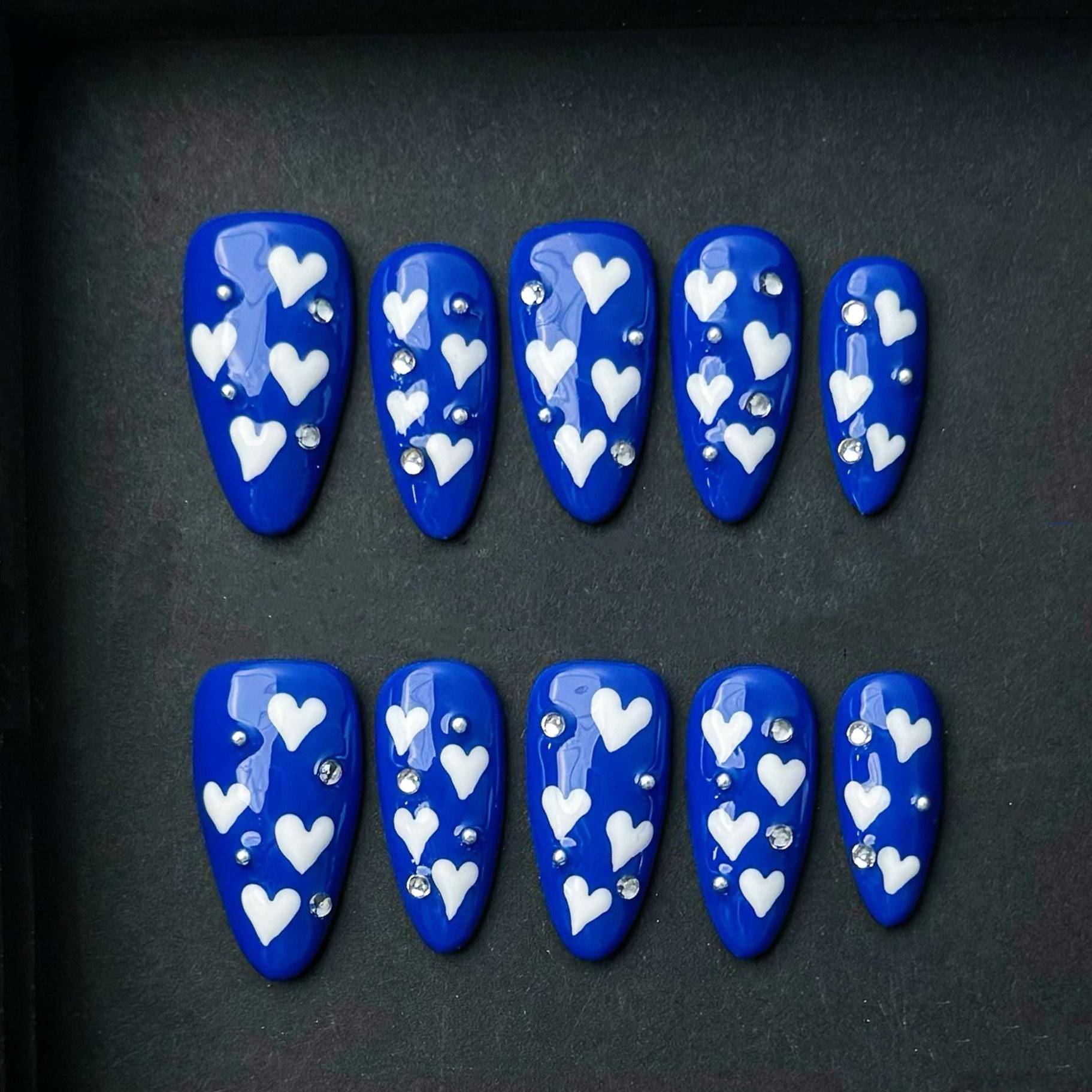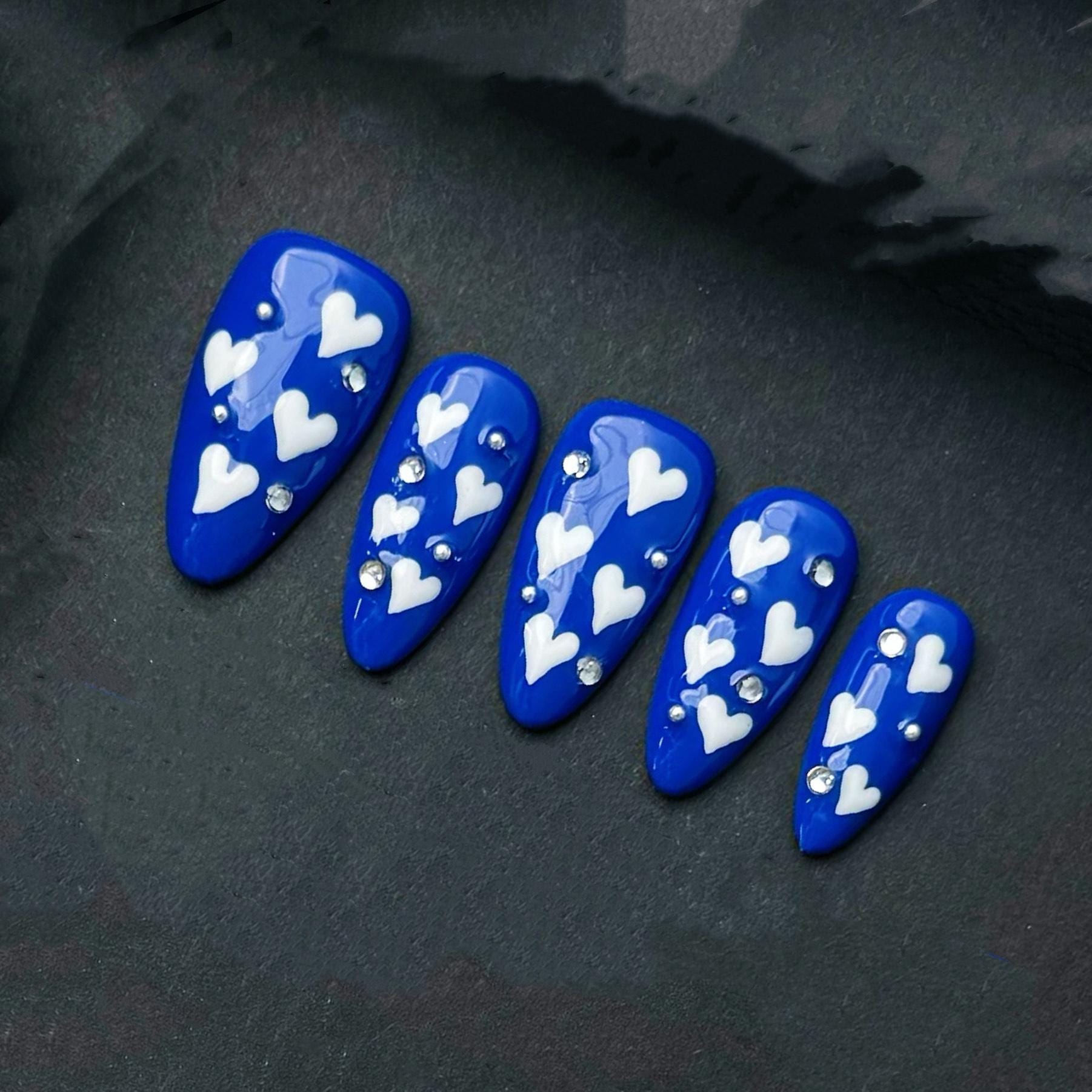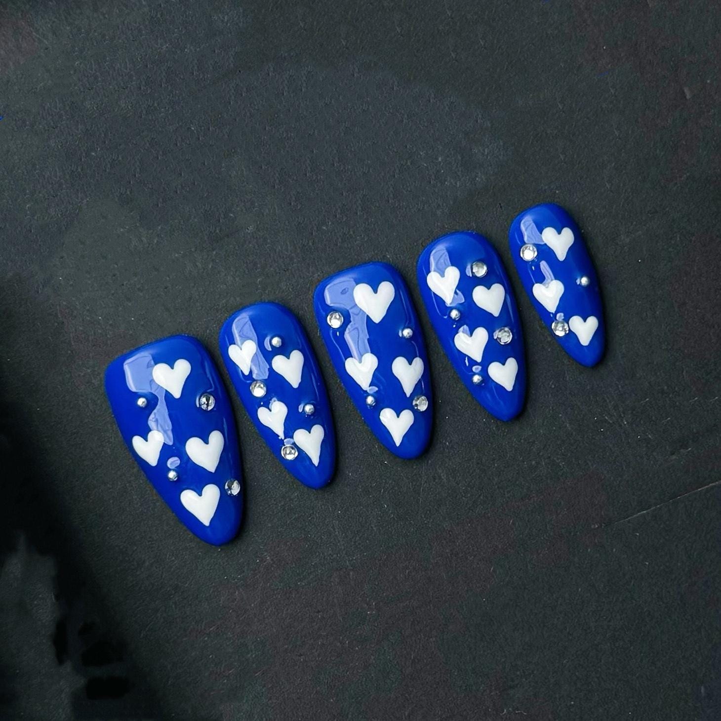 These royal blue press-on nails are the perfect mix of playful and glamorous. Featuring crisp white 3D hearts scattered across each nail, the design pops against the high-gloss blue base, evoking feelings of love and energy. Clear rhinestones are strategically placed among the hearts for a sparkling finish, adding a touch of luxury and charm. These medium almond-shaped nails are ideal for date nights, festivals, or any occasion where you want your nails to speak volumes. Easy to apply, reusable, and irresistibly cute, they’re a standout in any press-on collection.