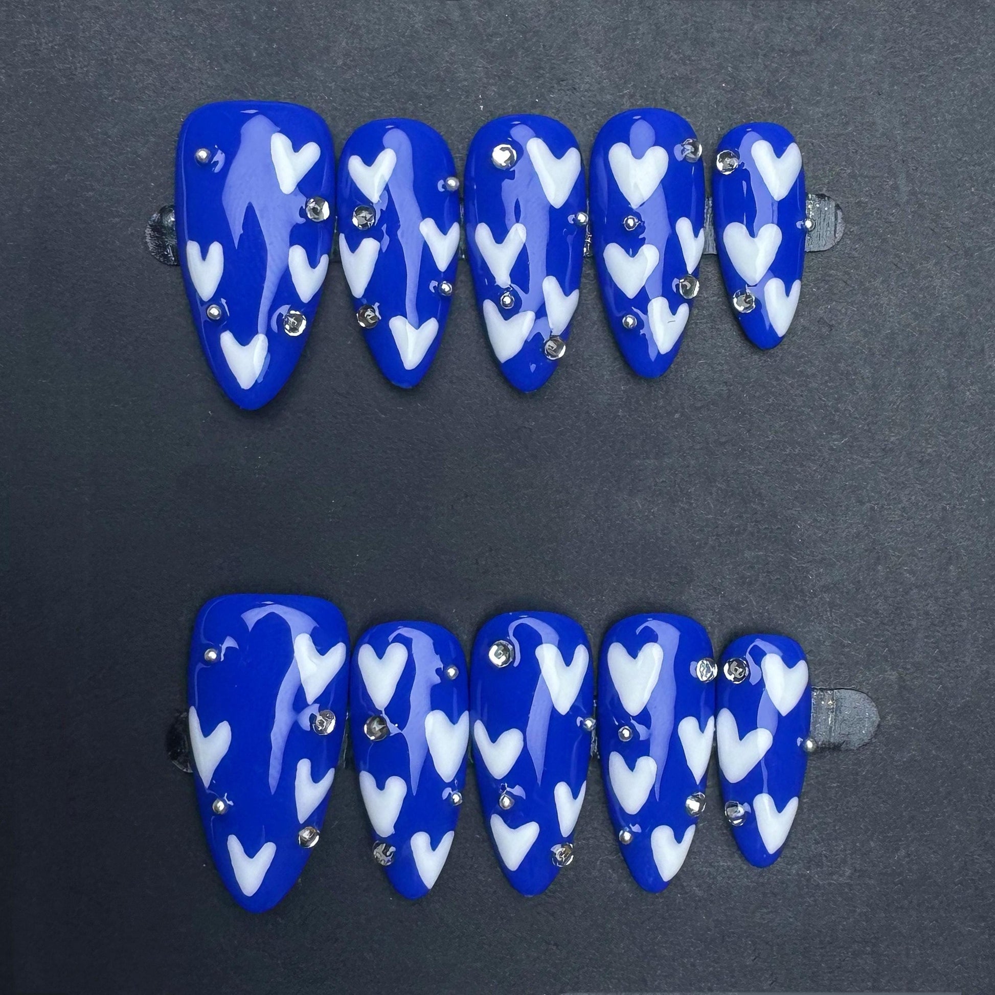 Royal Blue Press-On Nails with White Heart and Rhinestones Bold & Romantic. Artificial reusable fake glue on faux manicure nails trendy art.