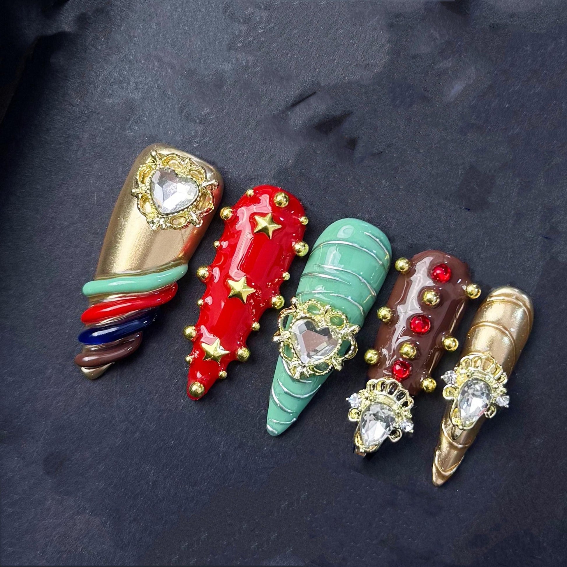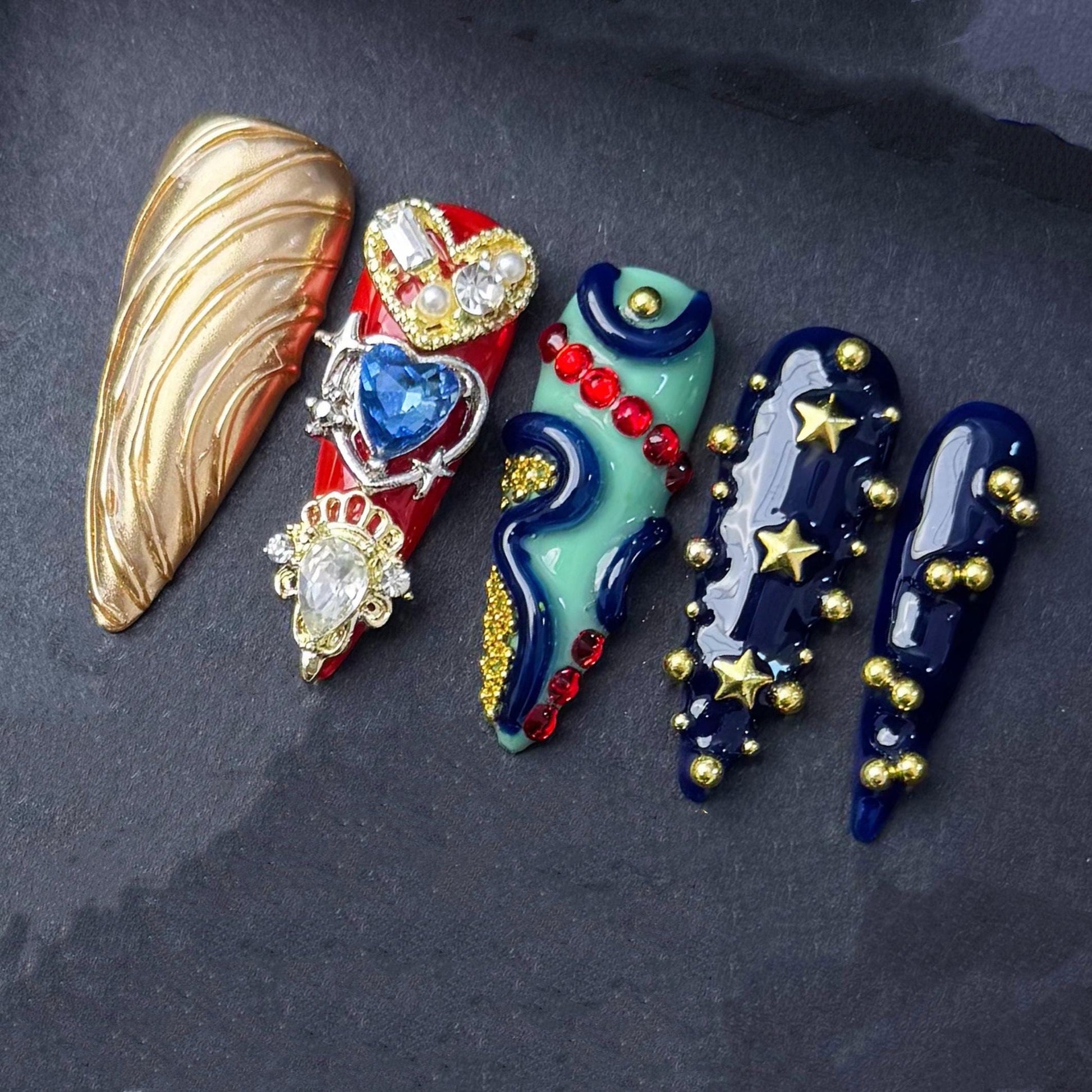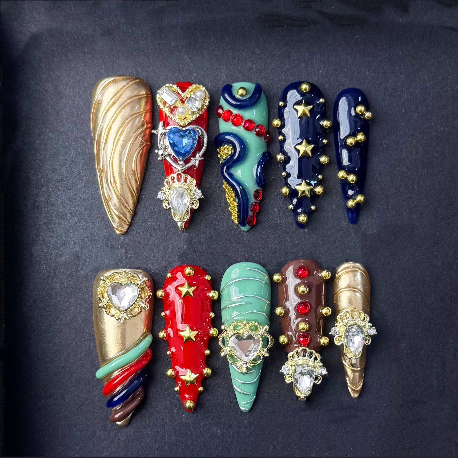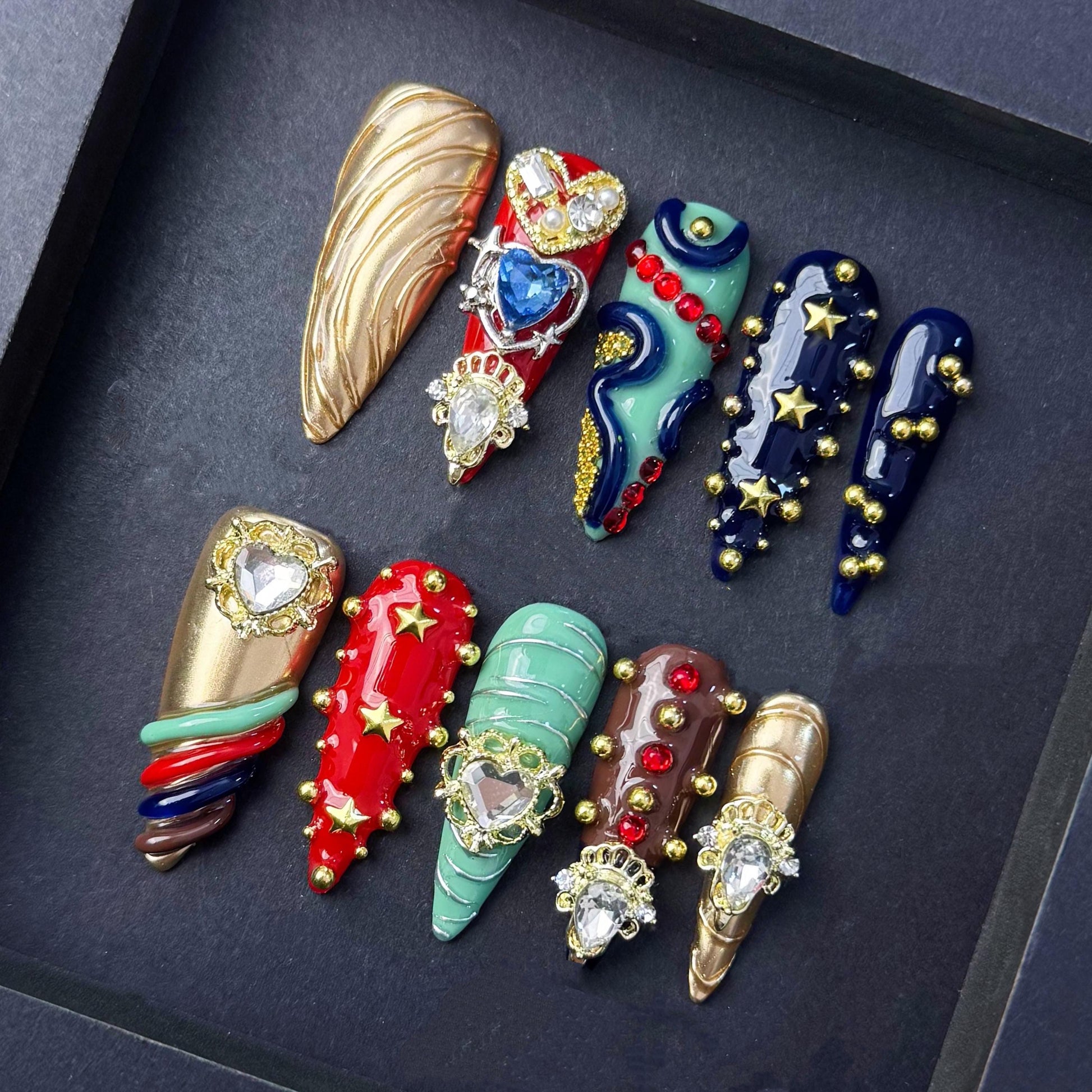 Step into a world of regal fantasy with this luxurious baroque-inspired press-on nail set. Each nail is a masterpiece—embellished with heart-shaped jewels, golden accents, raised stars, and swirling sculptural designs in vivid red, navy, gold, emerald, and bronze tones. The intricate detailing includes 3D textures, pearl drops, and multi-gem centerpiece charms that evoke royalty and high fashion drama. Perfect for cosplay, special events, photo shoots, or anyone who dares to go bold and glamorous. Long stiletto shape and reusable quality make these both statement-making and practical. Fit for a queen.