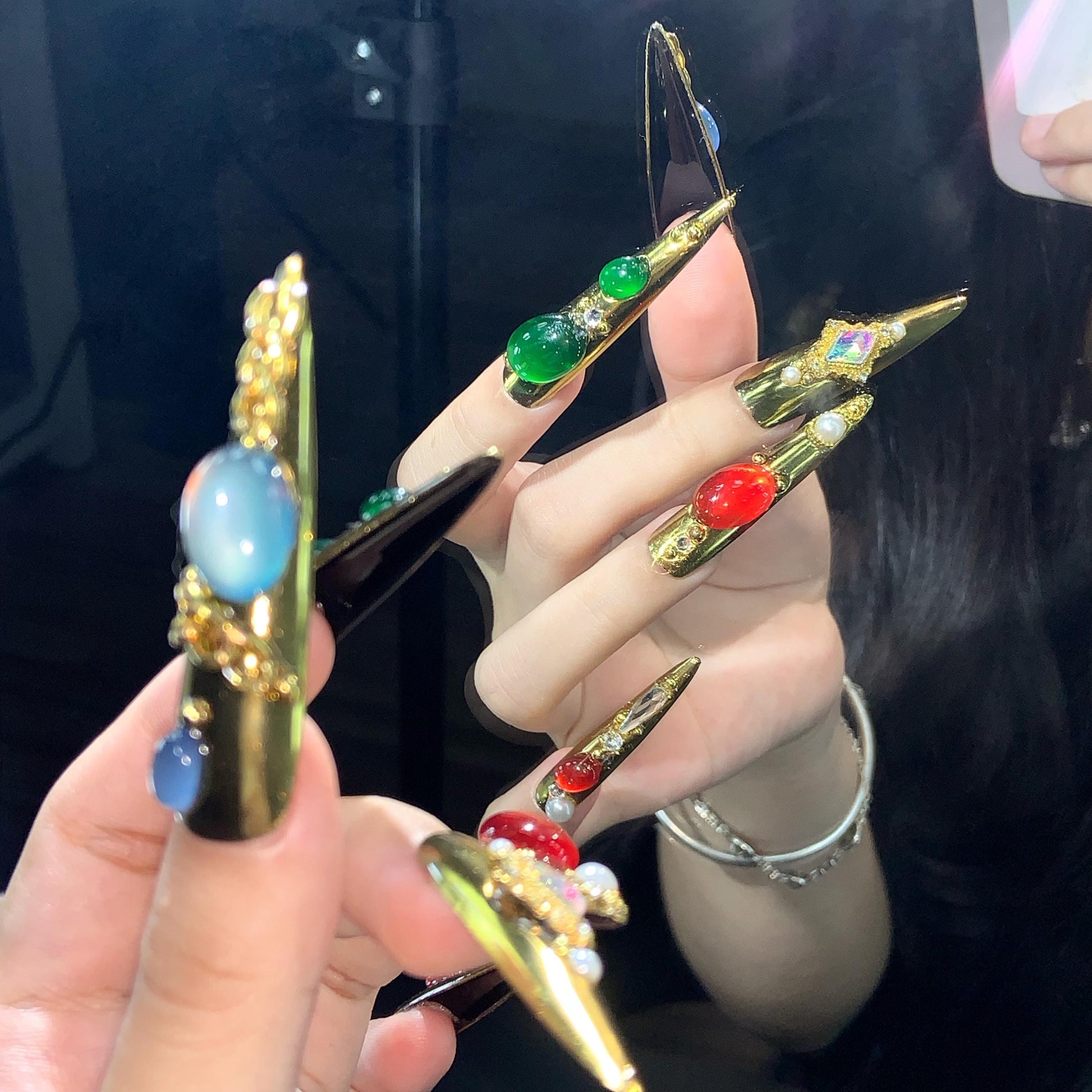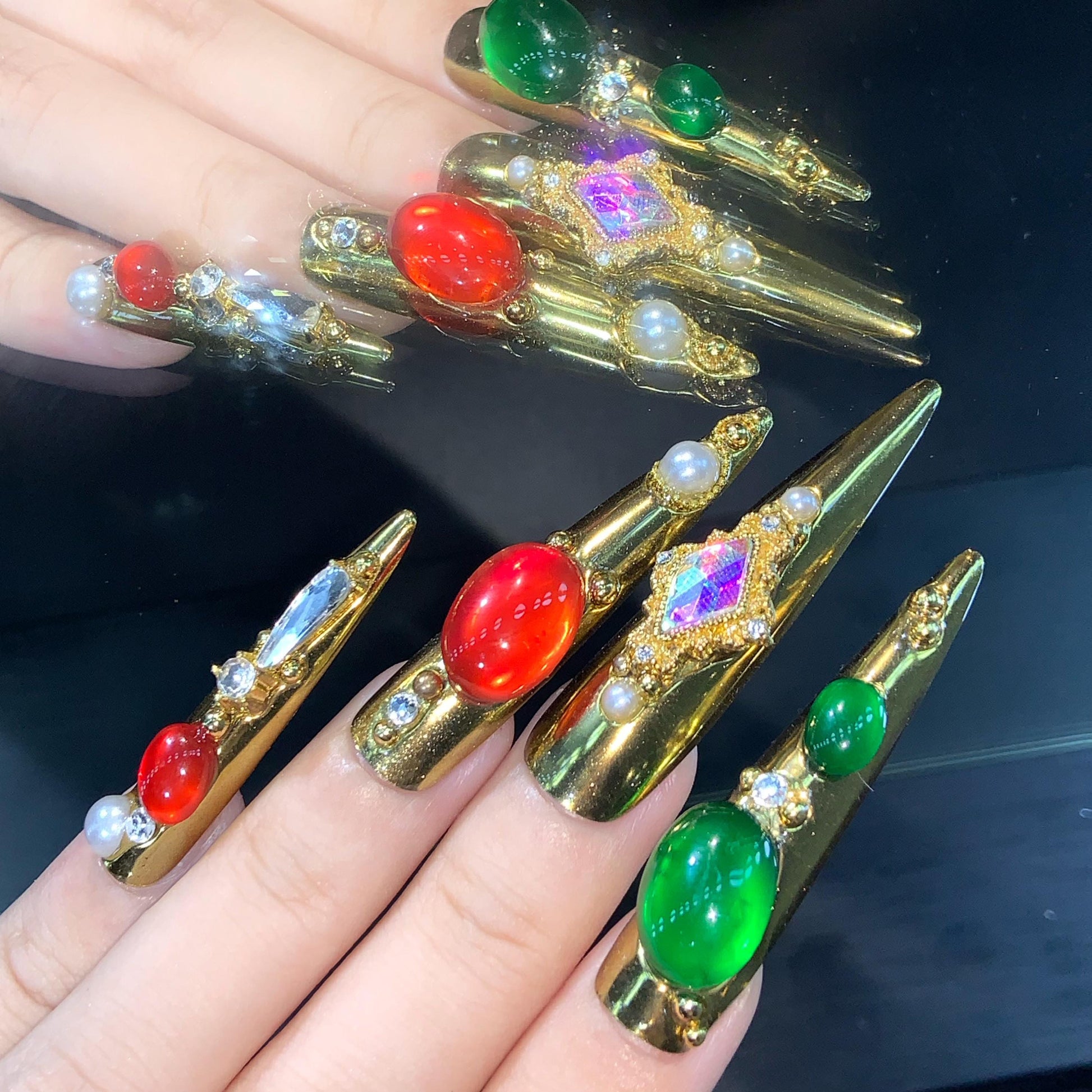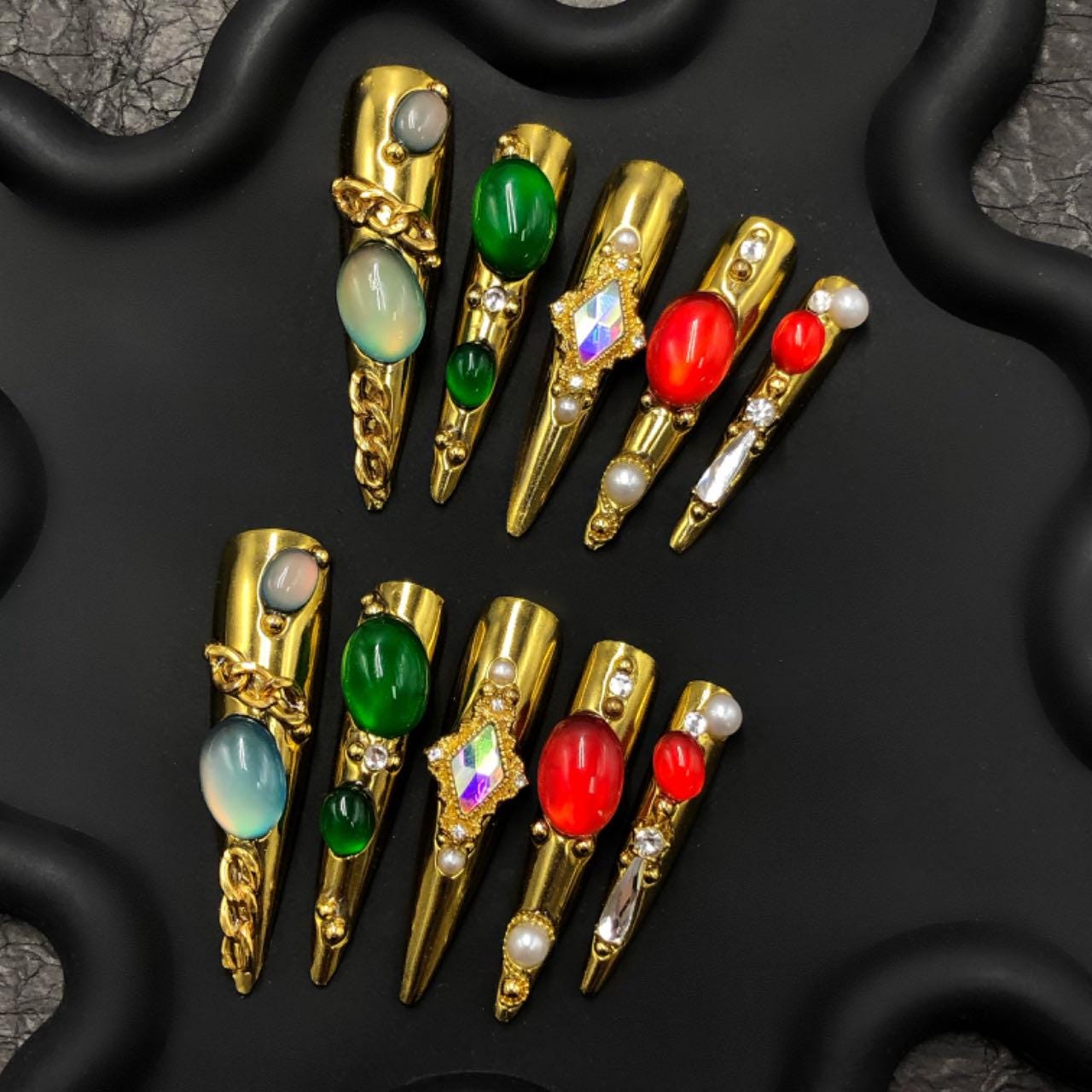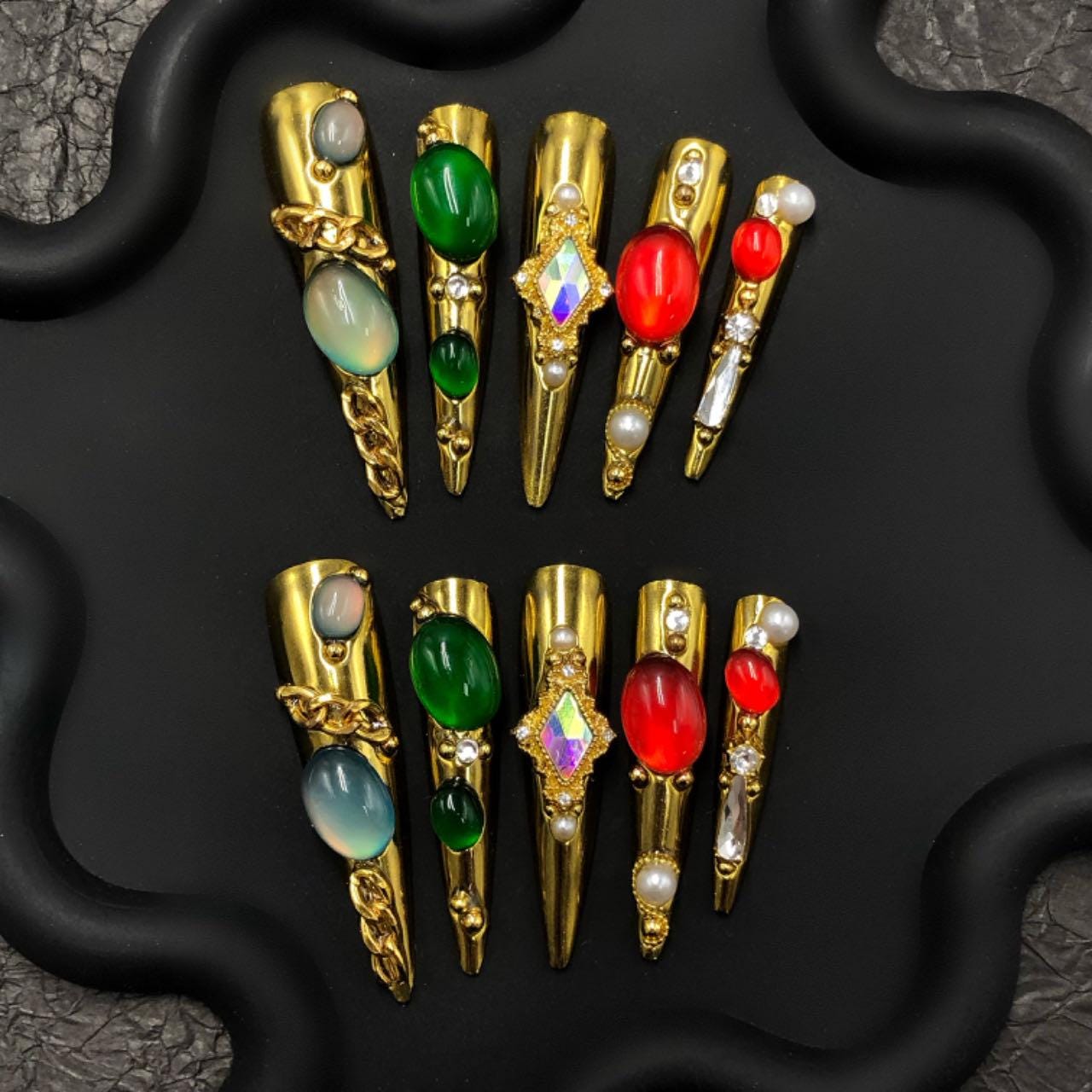 Make a bold, regal statement with this luxurious gold press-on nail set, adorned with vibrant gem-like stones in emerald green, ruby red, and opalescent hues. Accented with pearls, rhinestones, and gold chains, these long stiletto nails exude royalty and high-fashion drama. Perfect for parties, photoshoots, or anyone who loves extravagant glam.