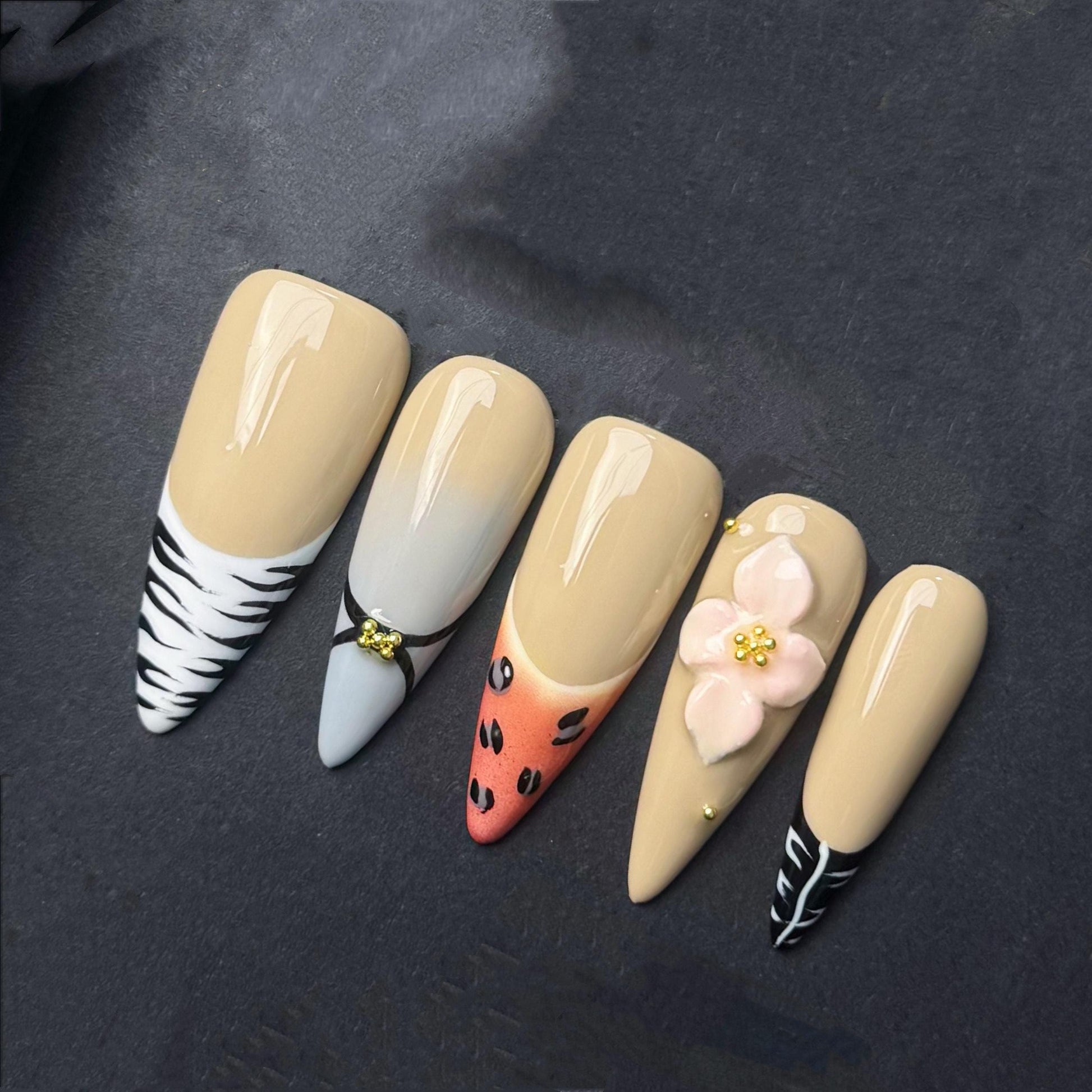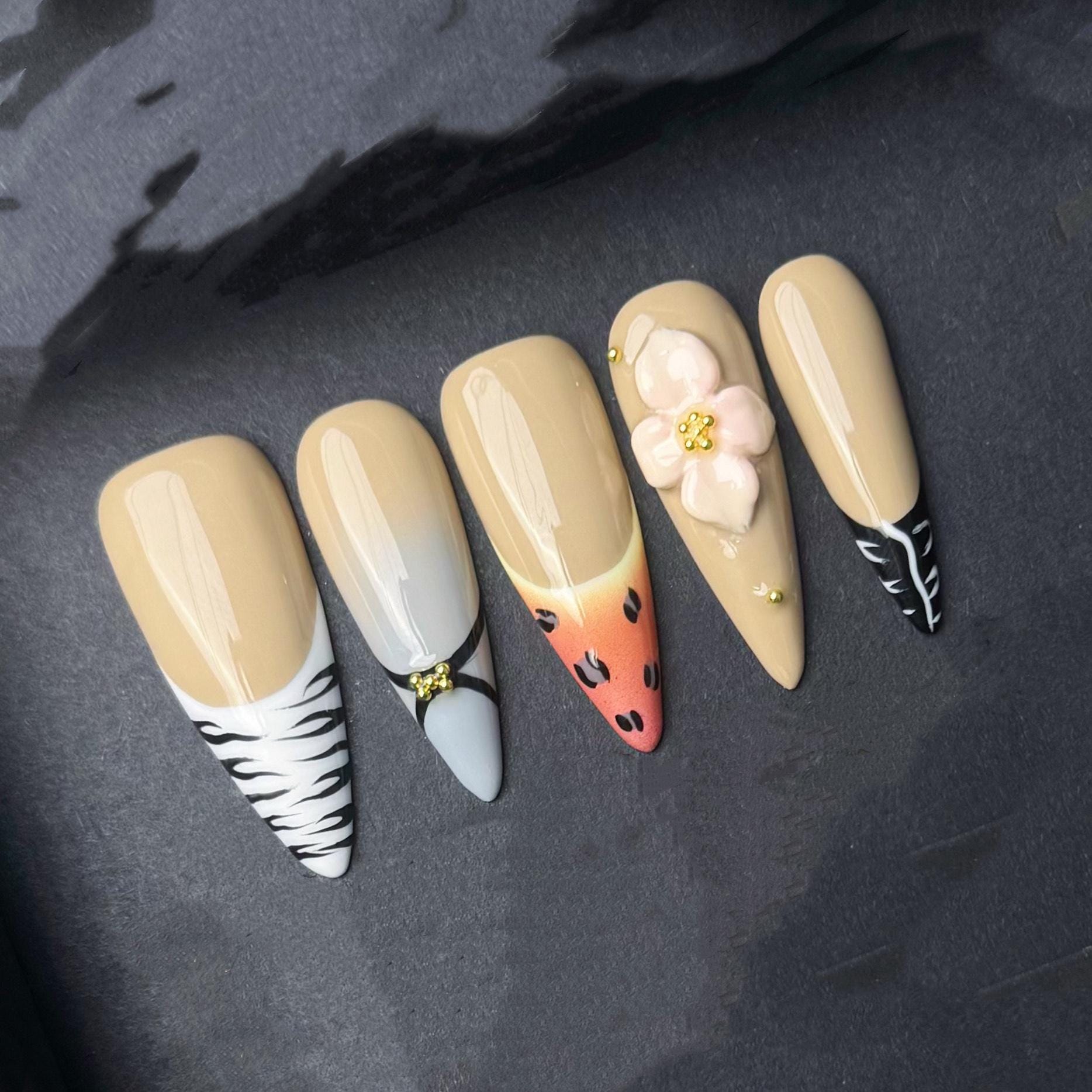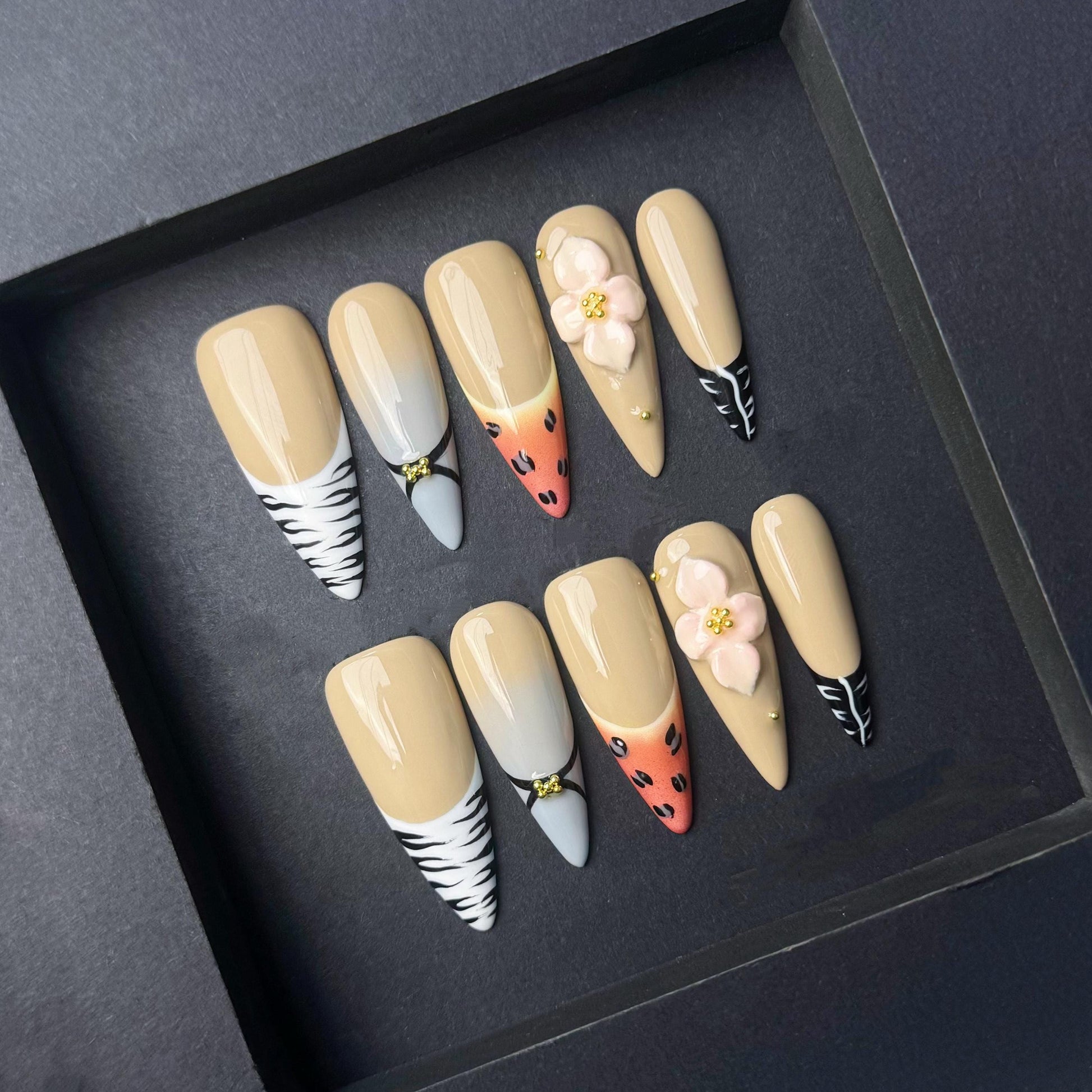 These stylish press on nails feature a beige base with zebra and leopard print accents soft color gradients and delicate 3d flowers Inspired by a safari aesthetic this set adds a wild yet feminine flair perfect for nature lovers and trendsetters