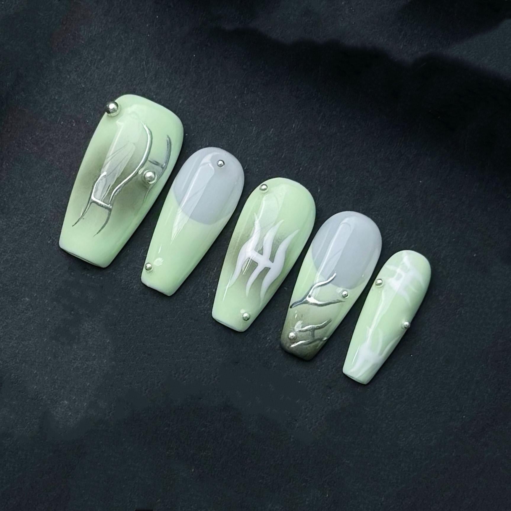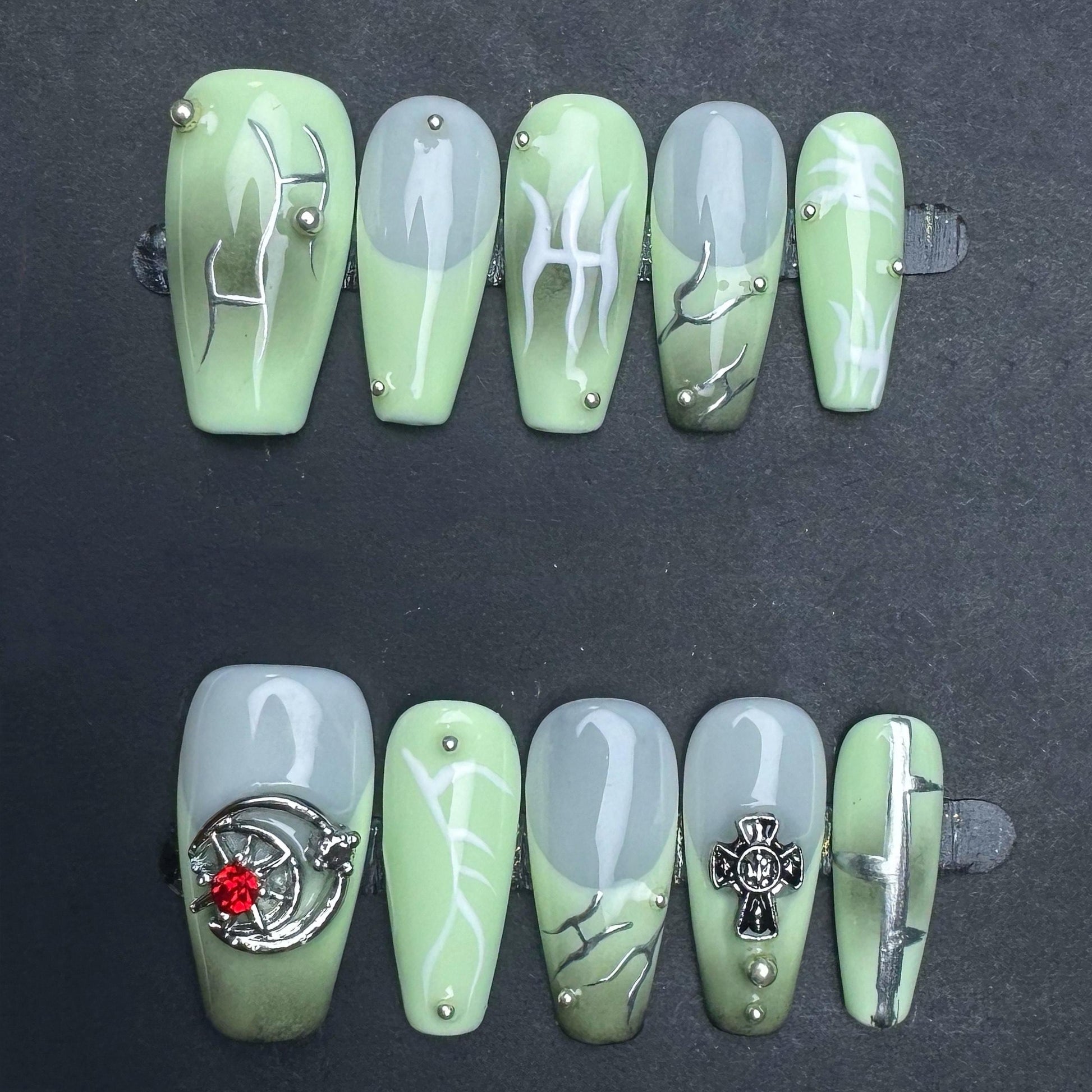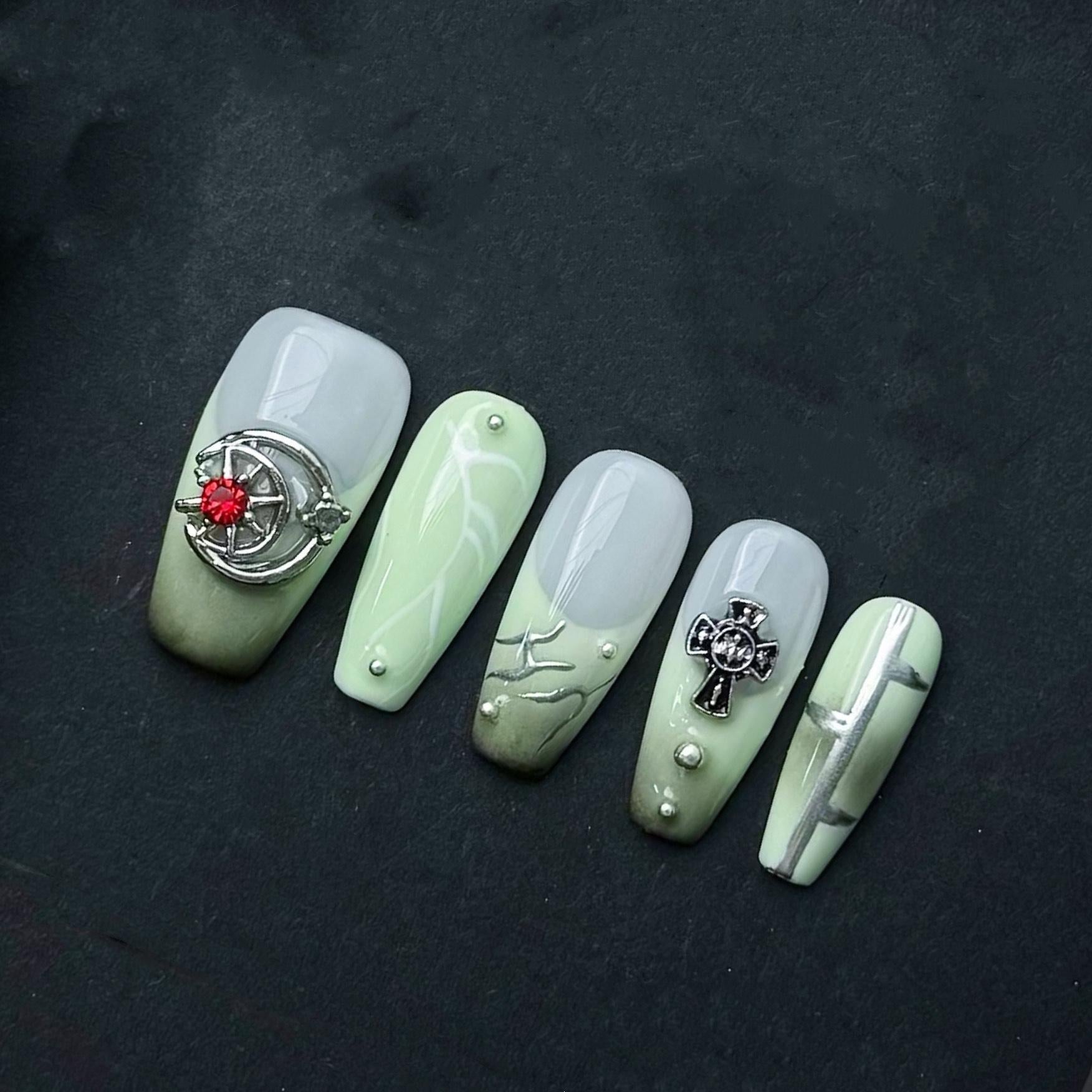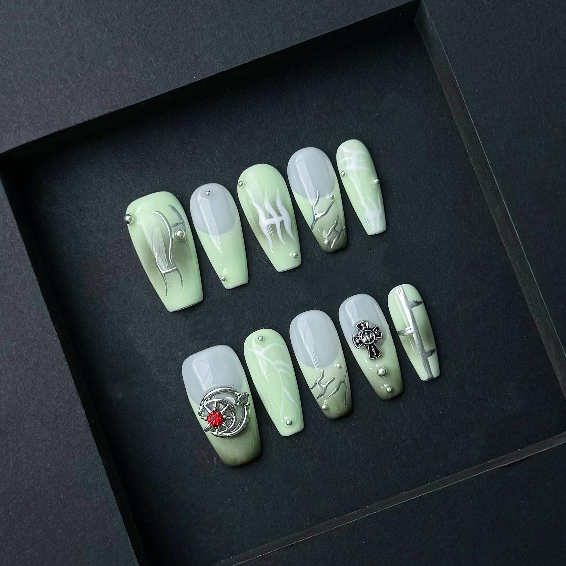 This unique set of press on nails blends calming sage green with moody gray and edgy tribal-inspired details. Each nail features a mix of hand-painted white and chrome tribal motifs, abstract silver linework, and bold 3D accents like a cross emblem and a red gem-studded gothic charm. The two-tone ombré base creates dimension, while small metallic studs add depth and structure. Designed in a long square shape, this set is perfect for fans of cyber-goth, futuristic alt aesthetics, or anyone who wants to stand out with a creative and handcrafted nail design.