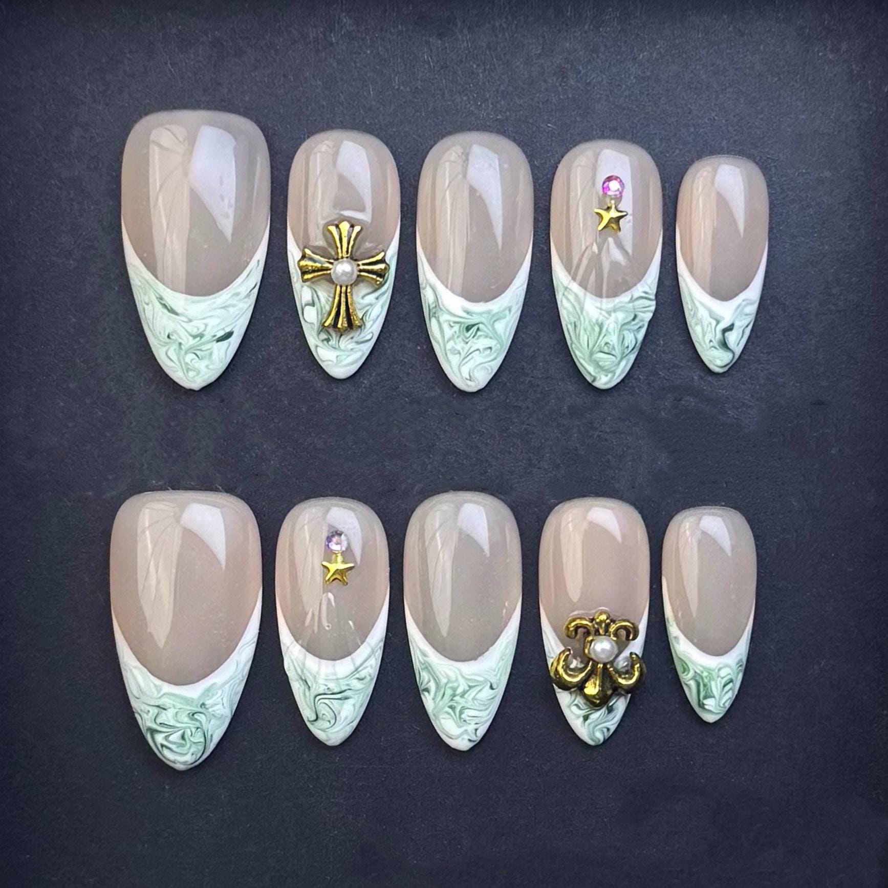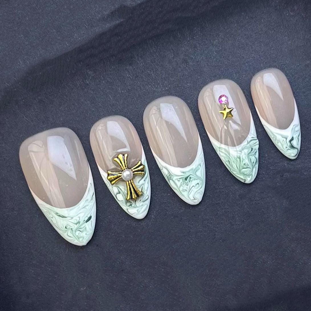 This elegant press on nail set features a nude base with soft sage green marbled French tips, accented by gold cross, star, and floral charms. The perfect blend of minimal luxury and artistic detail—great for everyday sophistication, bridal looks, or upscale events.