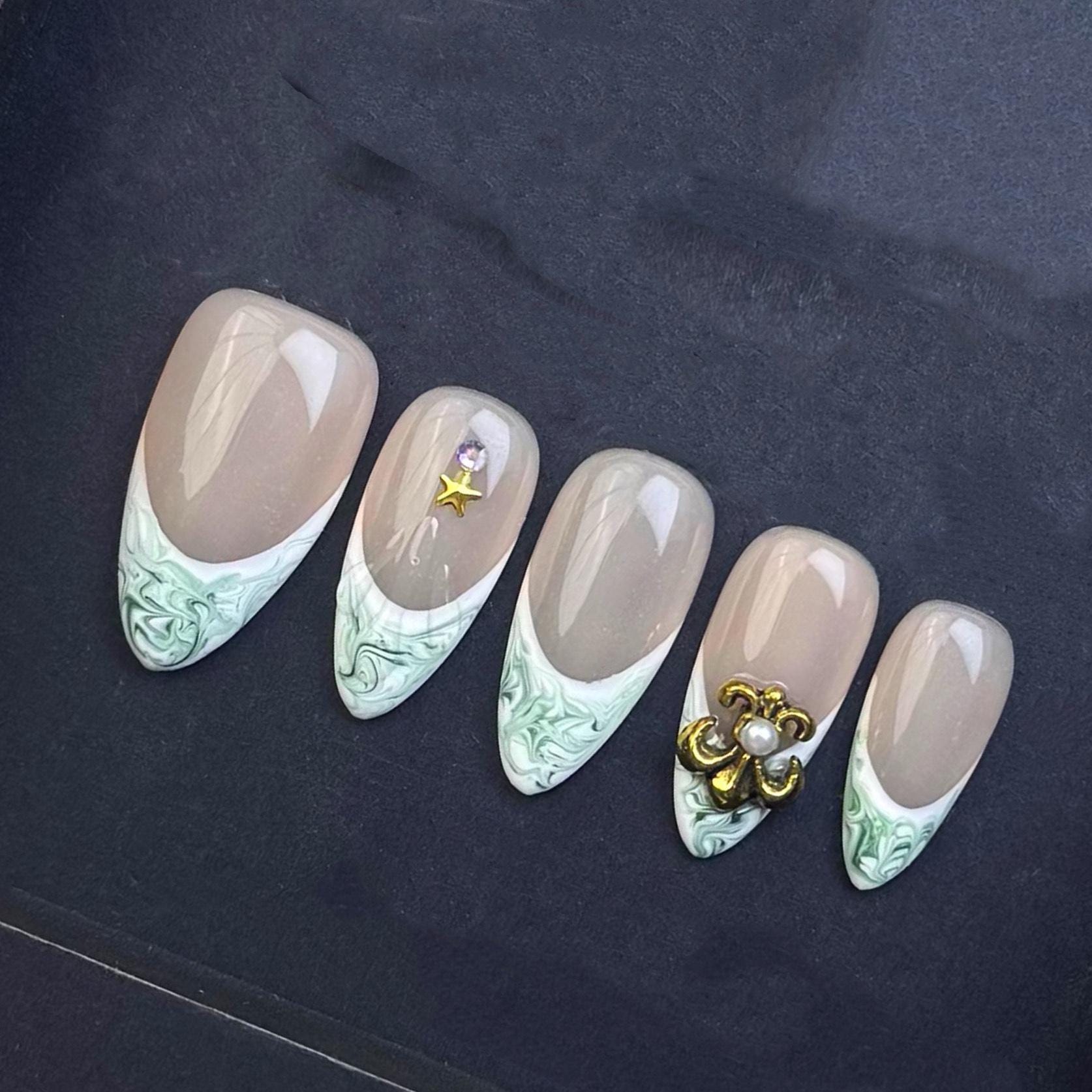 Sage Marble French Tip Press On Nails with Gold Charms and Nude Base
