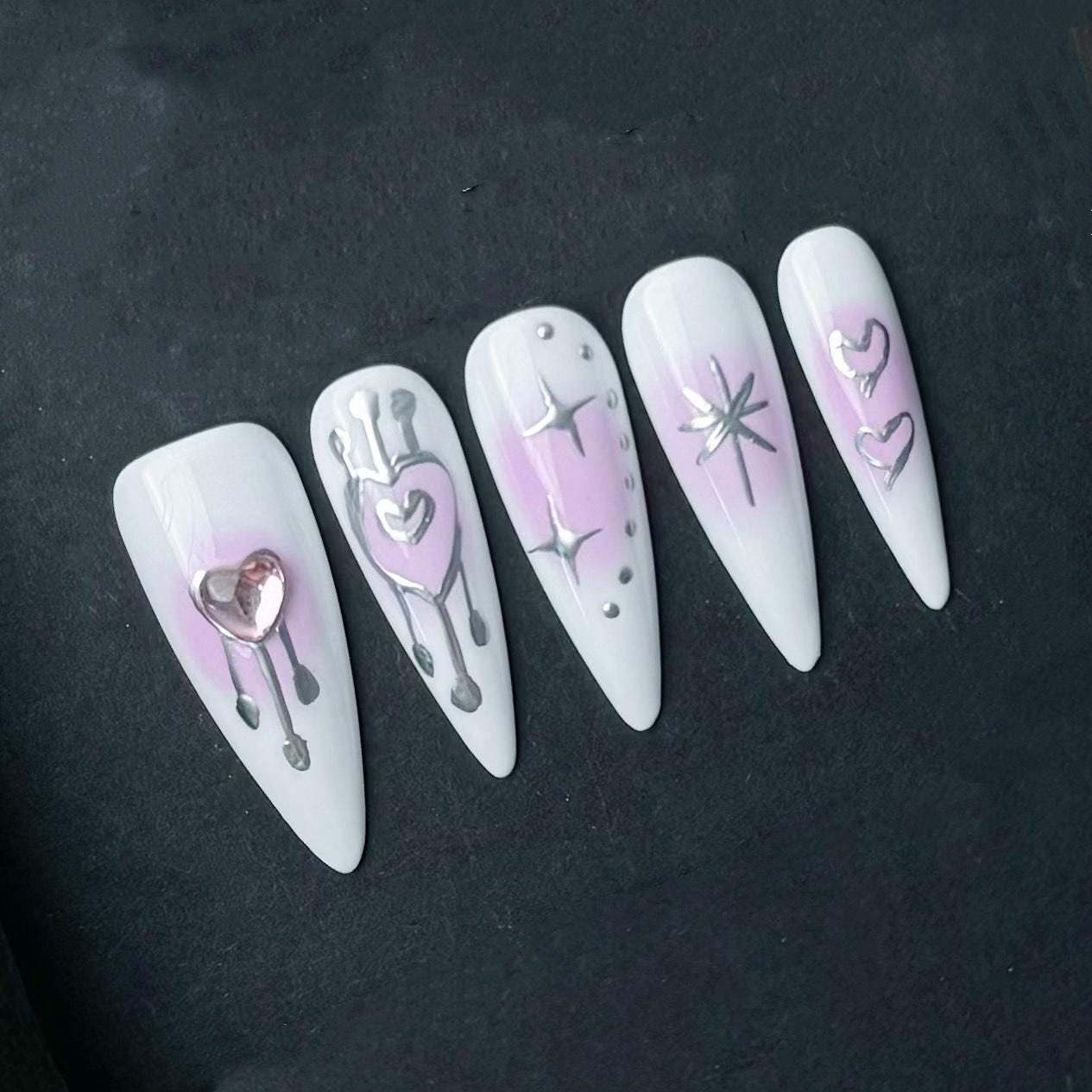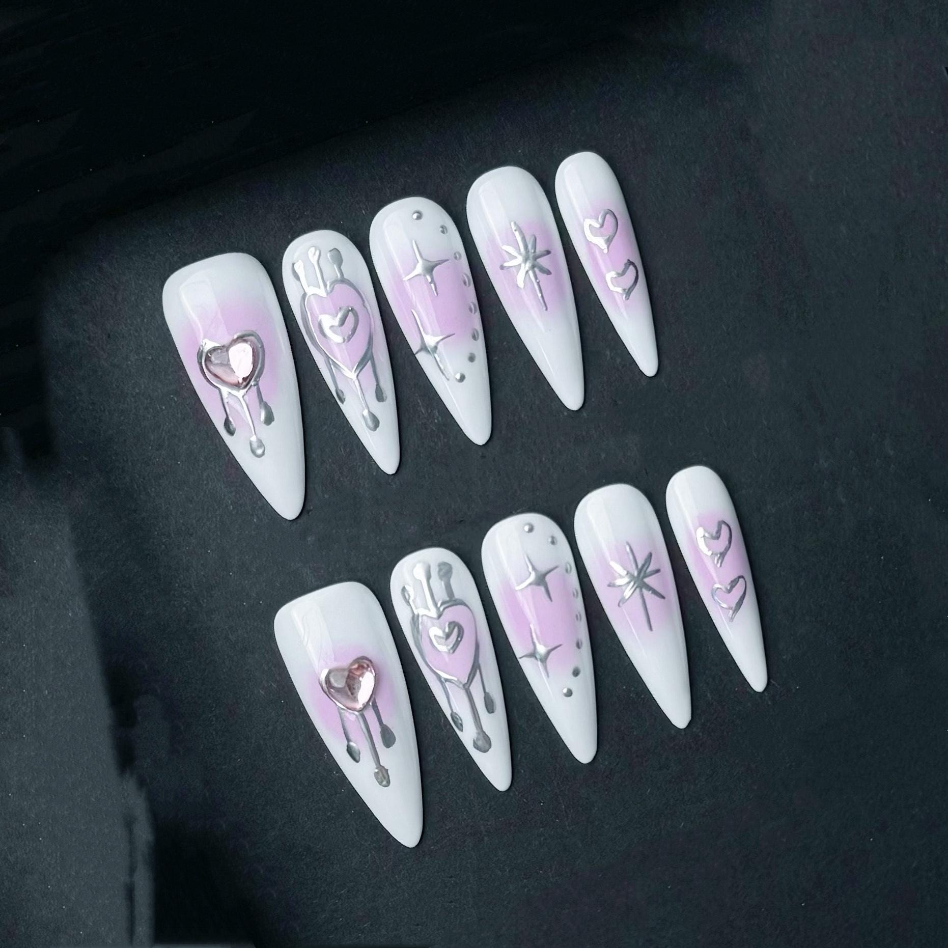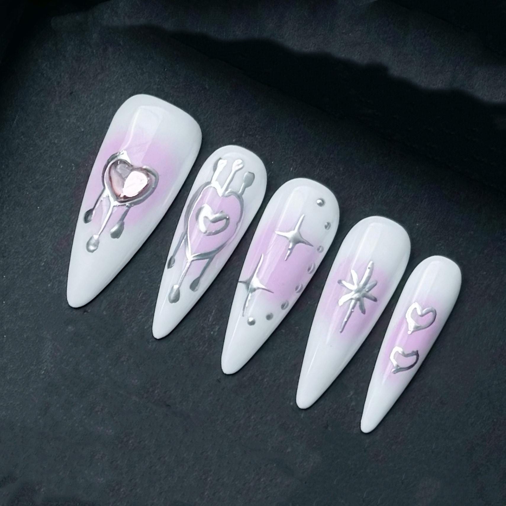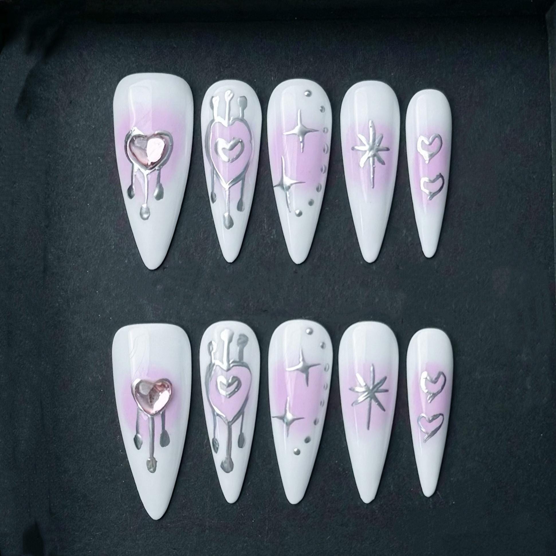 This dreamy press-on nail set features long stiletto tips with a white and lavender base, silver drip hearts, metallic stars, and cosmic accents. The perfect blend of cute and edgy, these nails are ideal for anyone who loves futuristic Y2K vibes with a soft girly twist.