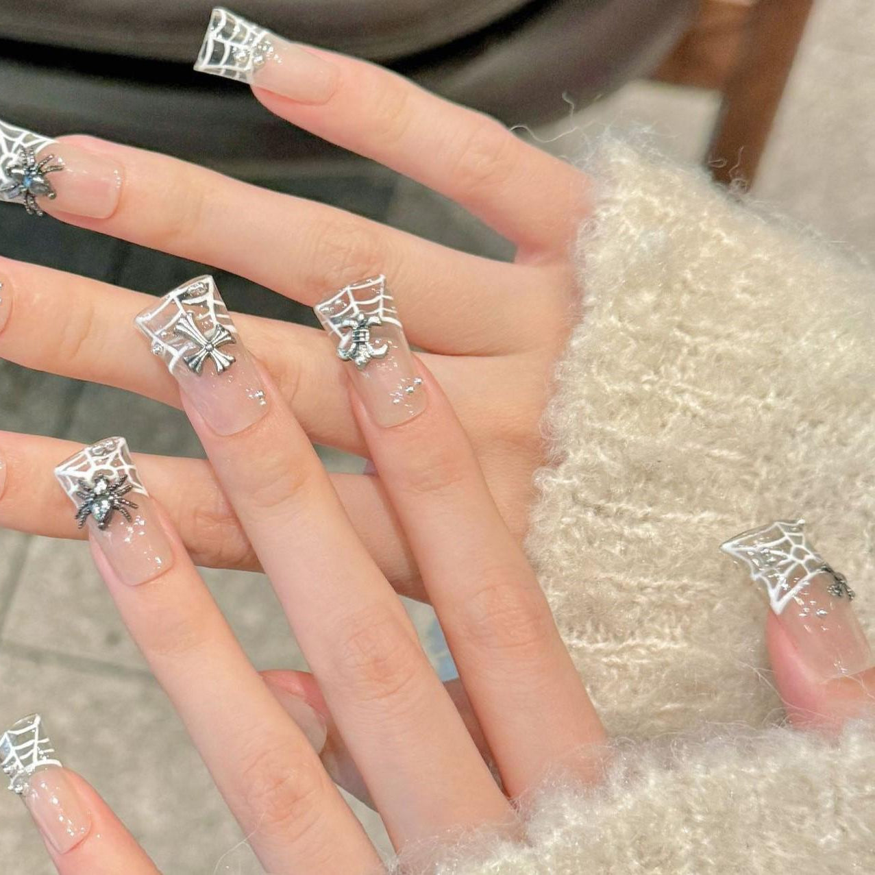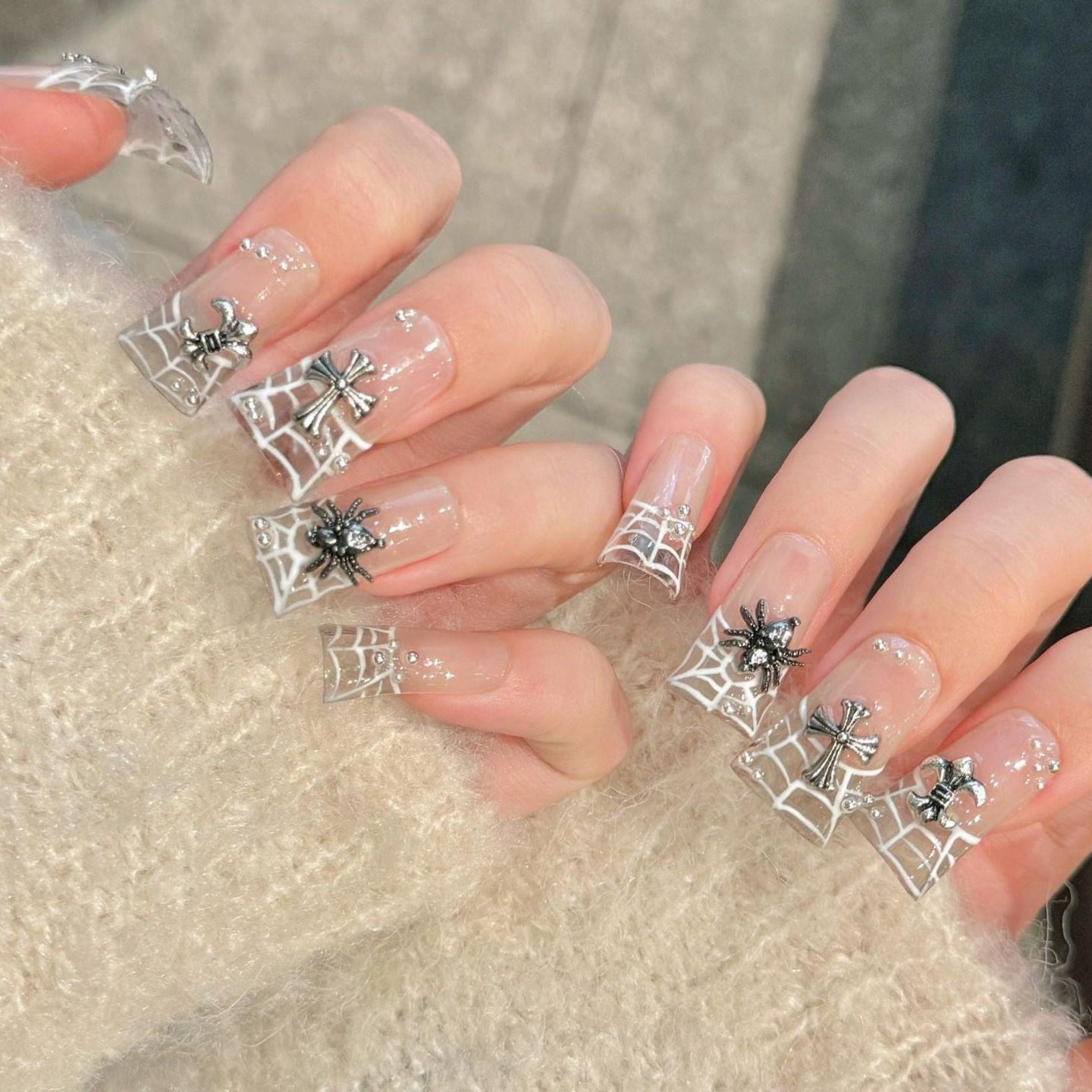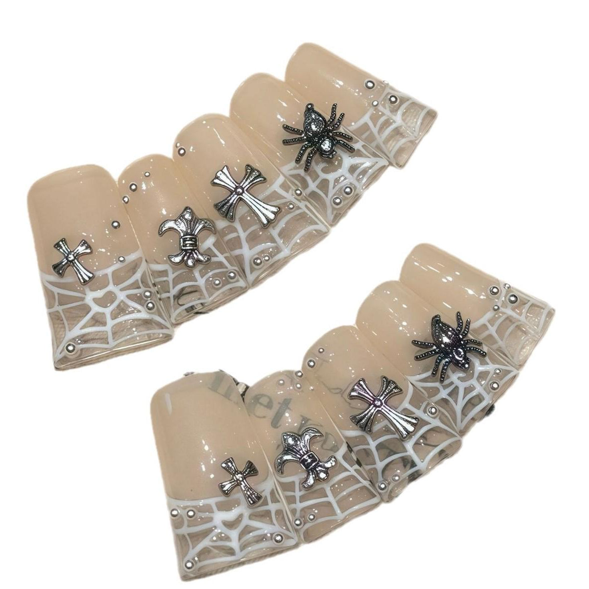 Silver Spiderweb Halloween Press-On Nails 3D Gothic Glam glue on creepy coffin web tips 3d rhinestone clear nude silver white witchy horror
