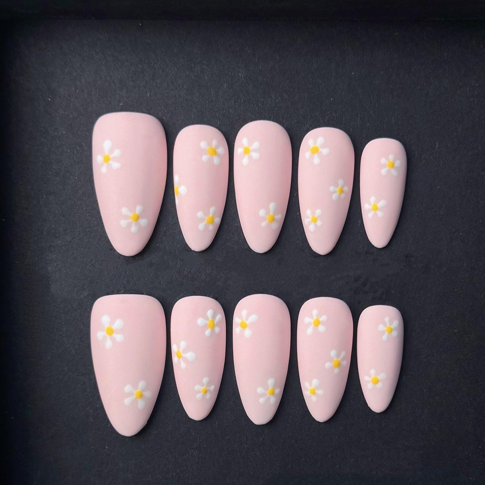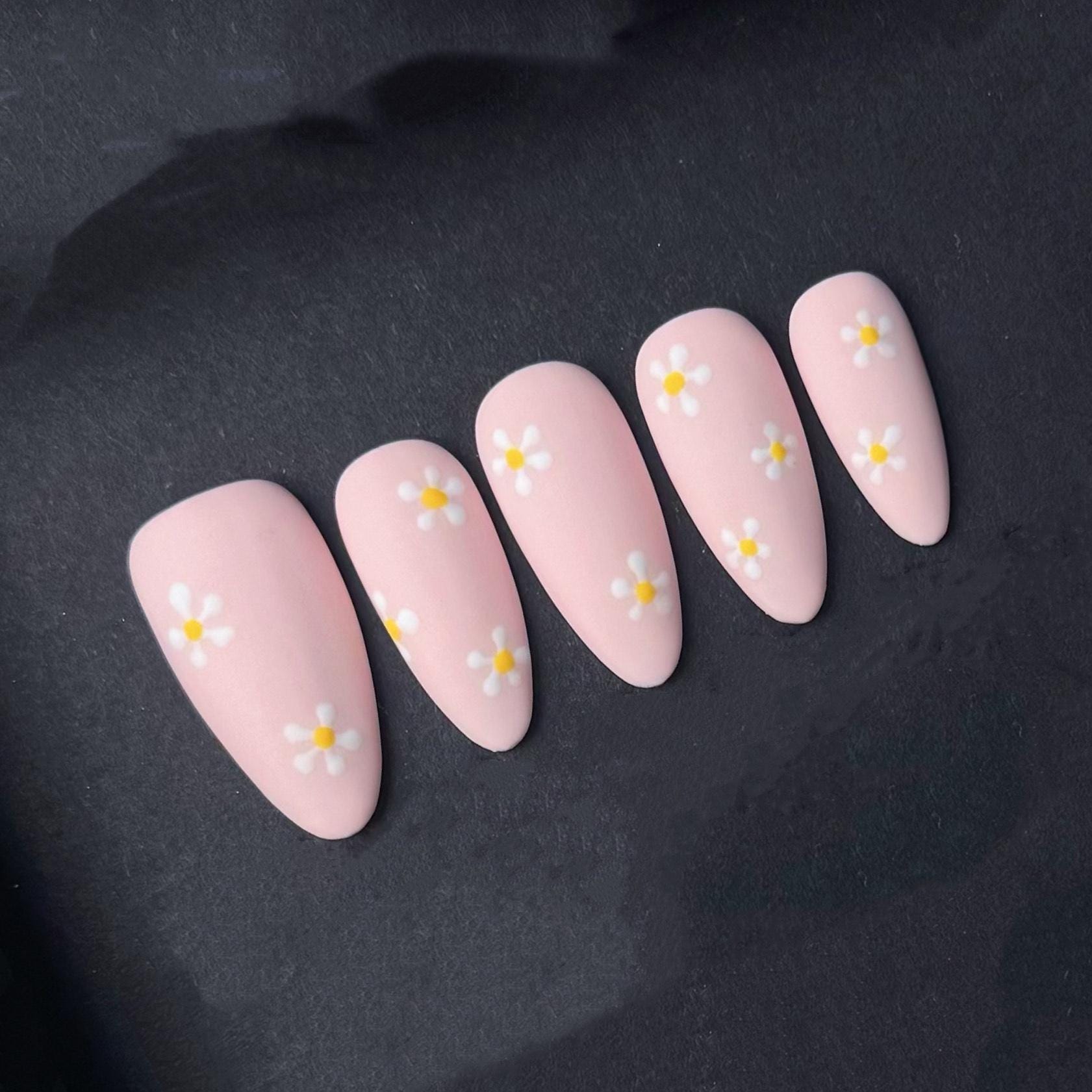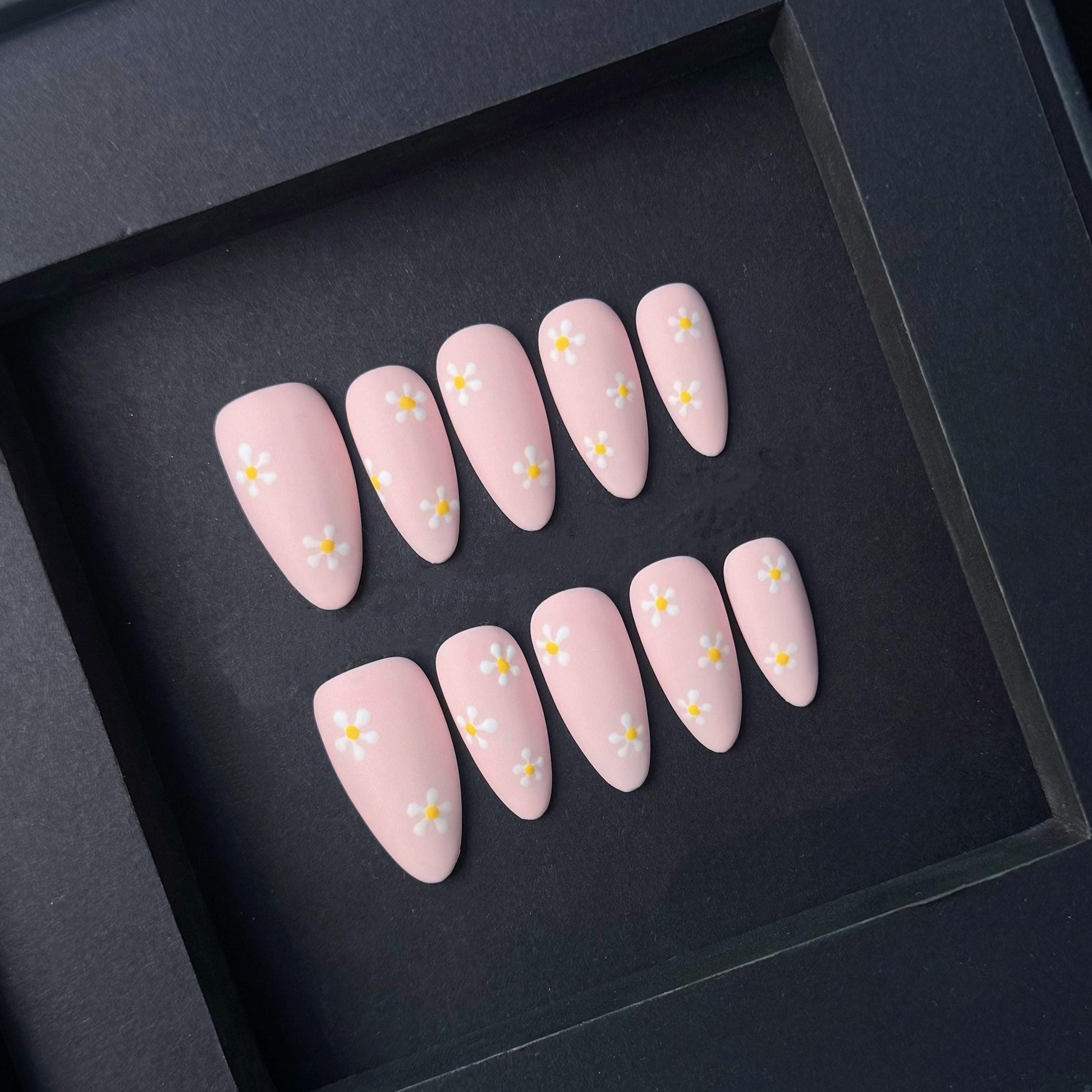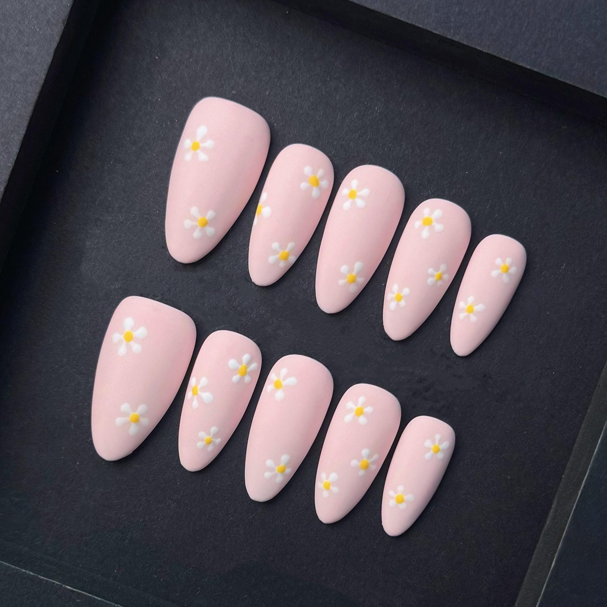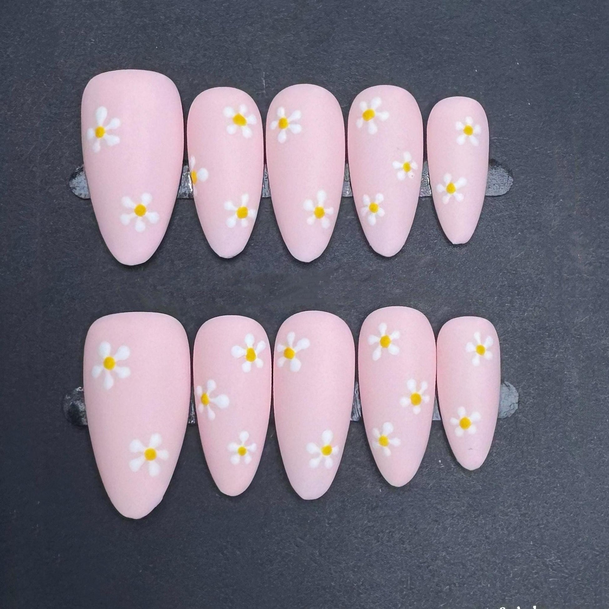 Soft Pink Daisy Press On Nails Matte Floral Pastel Spring Nail Set. Artificial reusable fake glue on faux manicure nails trendy art.
