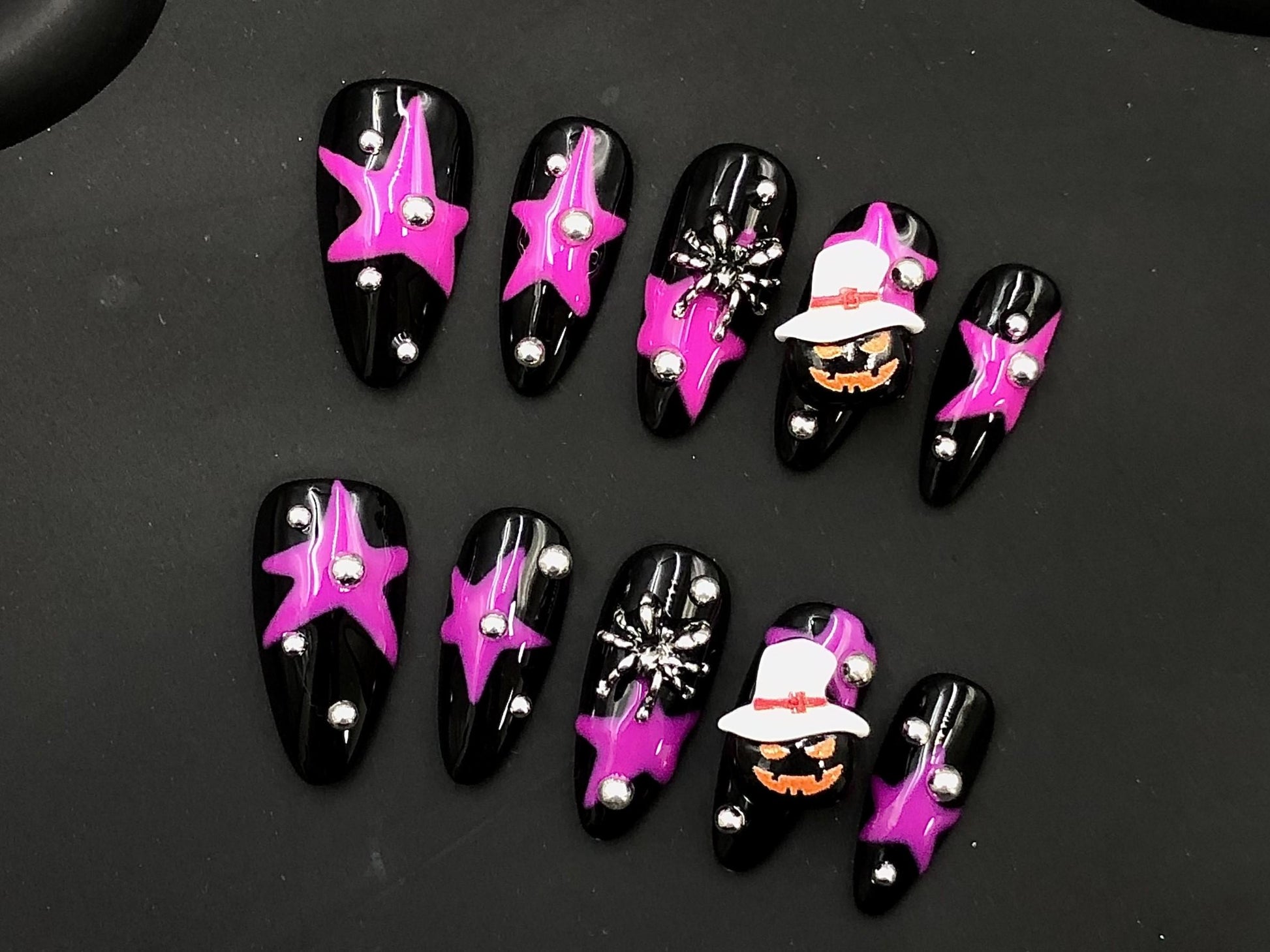 Spooky Star Halloween Press On Nails – Black & Purple Pumpkin Spider Set Artificial reusable fake glue on faux manicure nails trendy art