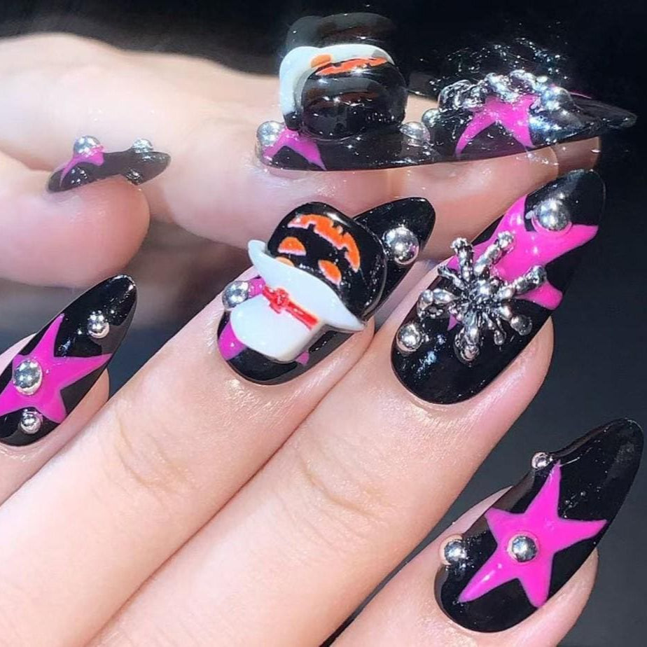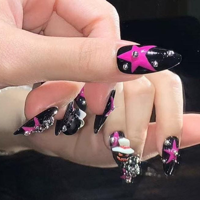 Get into the Halloween spirit with this spooky-cute press-on nail set featuring black and purple star designs, rhinestone accents, creepy crawly spider charms, and 3D pumpkin faces in stylish white hats. With a short almond shape and playful gothic vibes, these nails are perfect for trick-or-treating, costume parties, or witchy fashion days.
