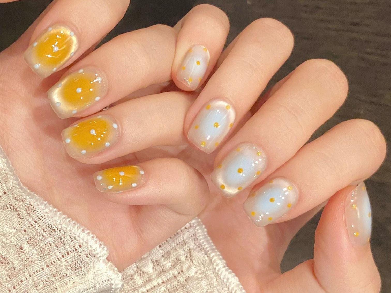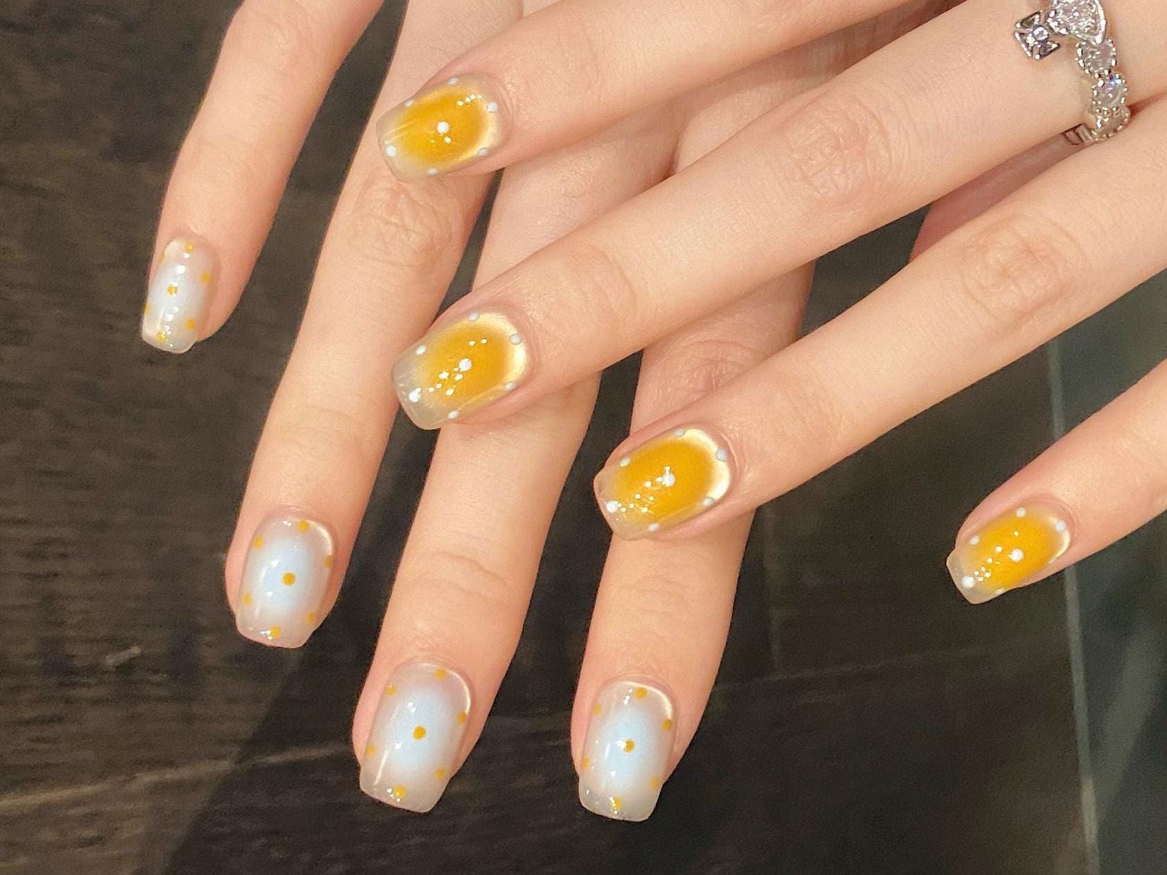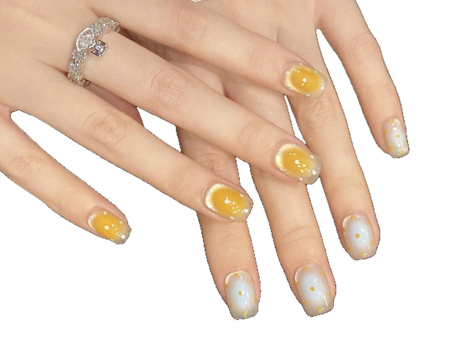 These charming short jelly nails feature a soft yellow and milky white gradient, sprinkled with playful white and gold dot accents. The translucent glow gives a dewy, sunshine-inspired finish that's perfect for spring and summer vibes.