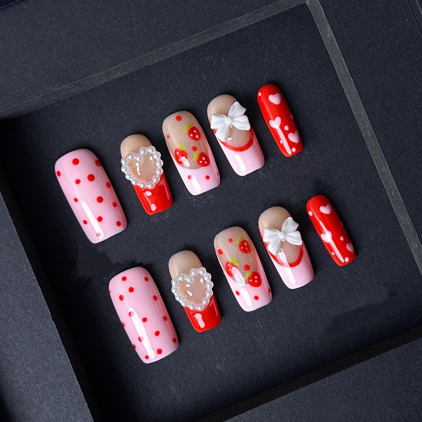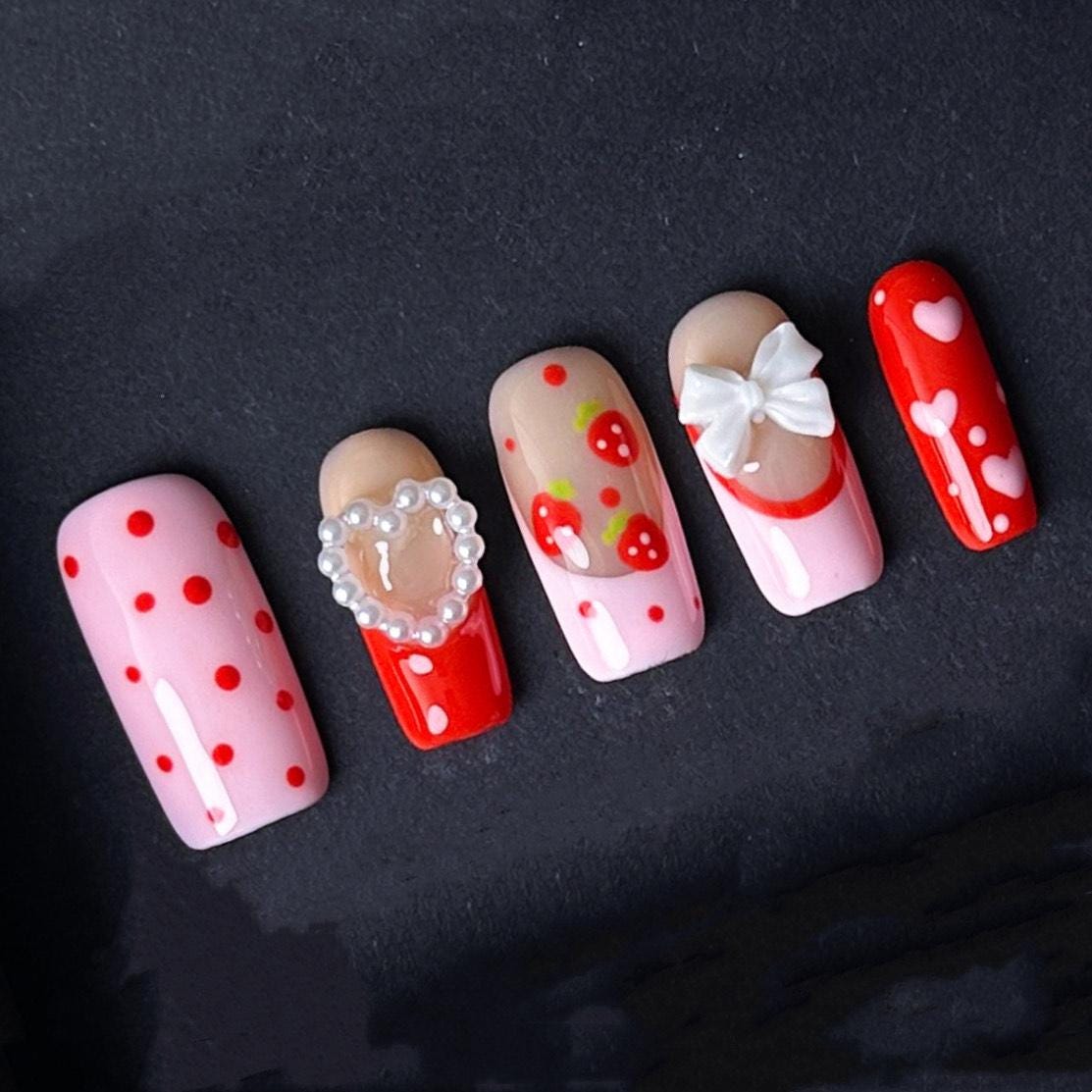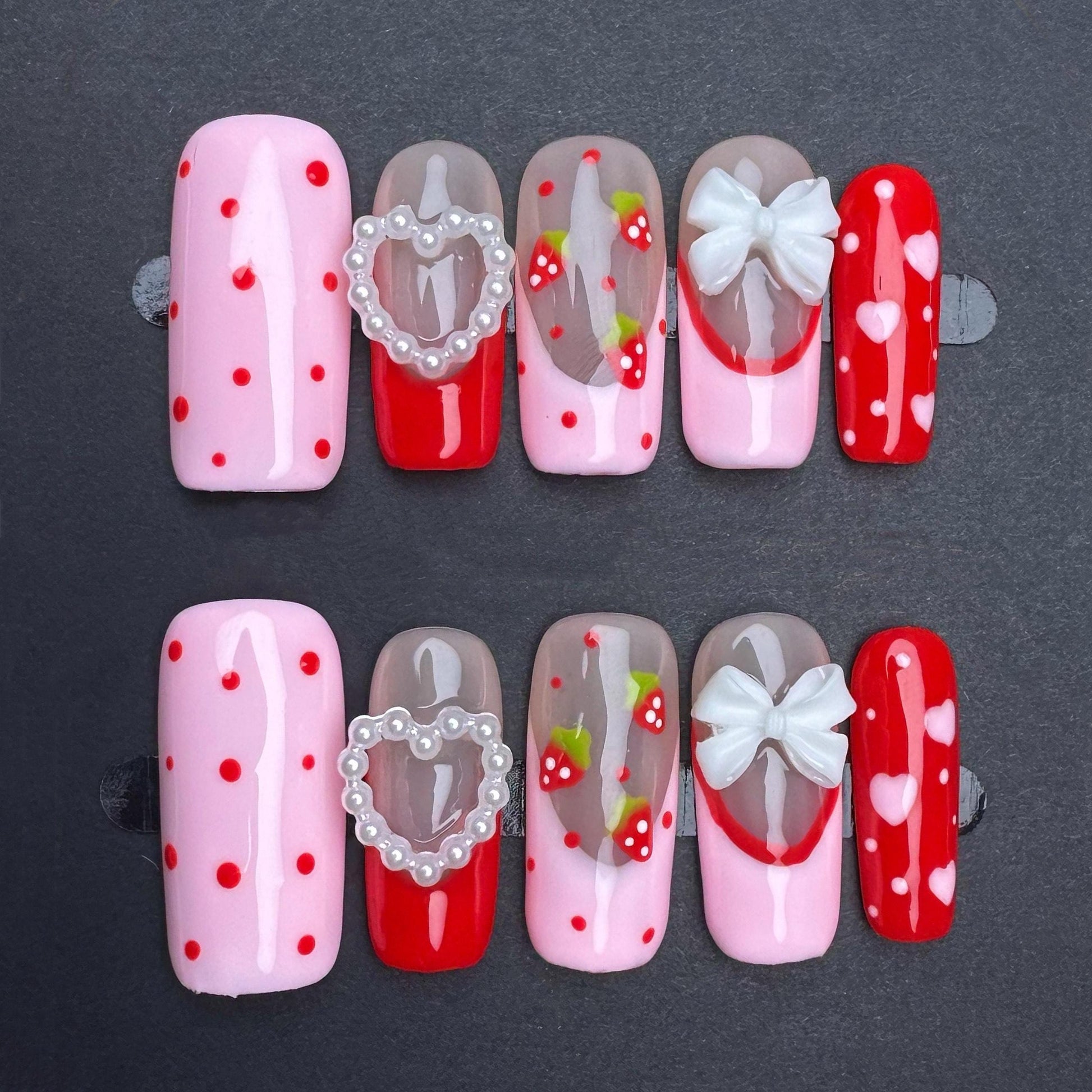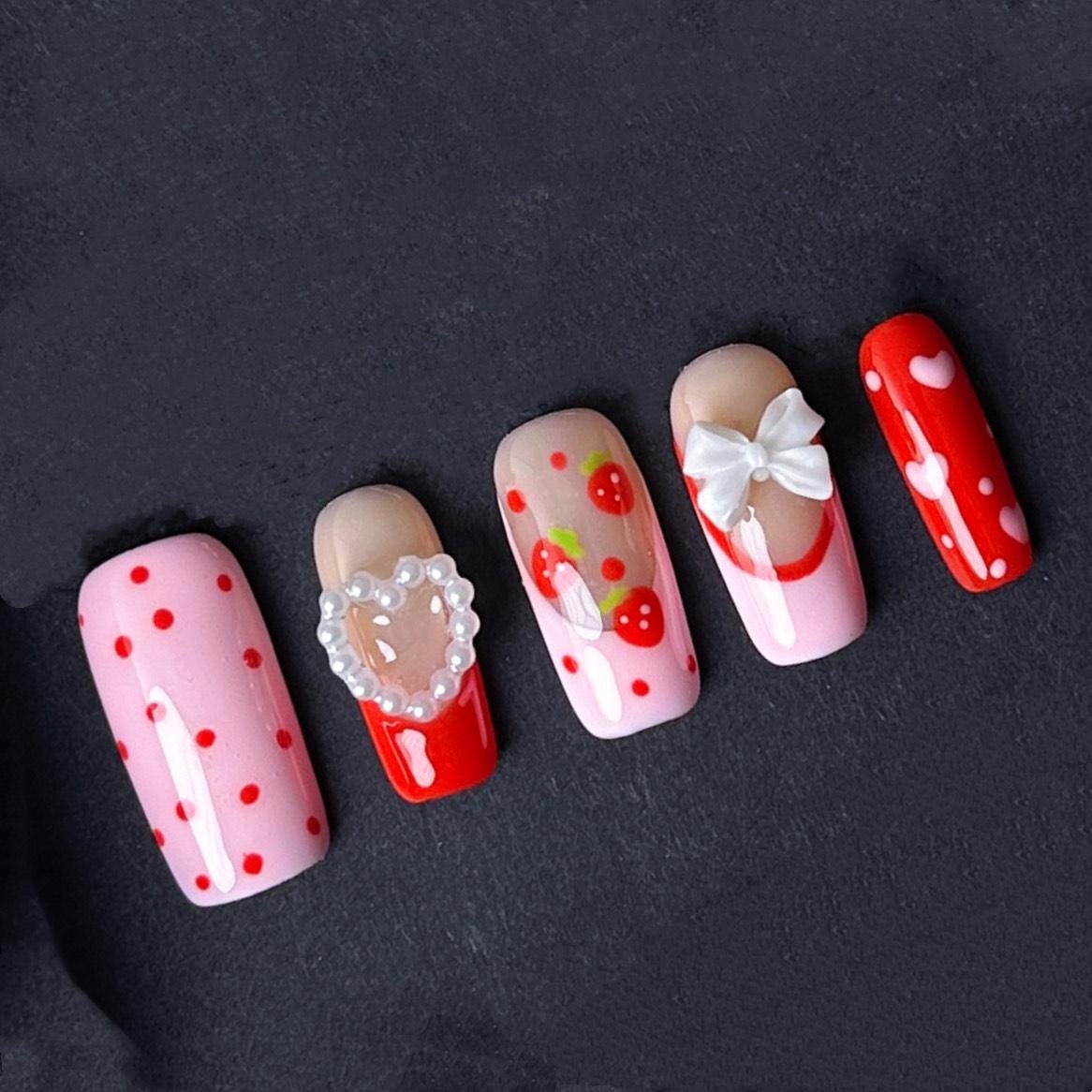 Celebrate love and sweetness with these adorable strawberry & heart press-on nails, featuring soft pink and bold red tones with playful dotted accents. This set is adorned with 3D pearl hearts, white bows, and juicy strawberries, making it perfect for Valentine's Day, romantic dates, or just adding charm to your everyday