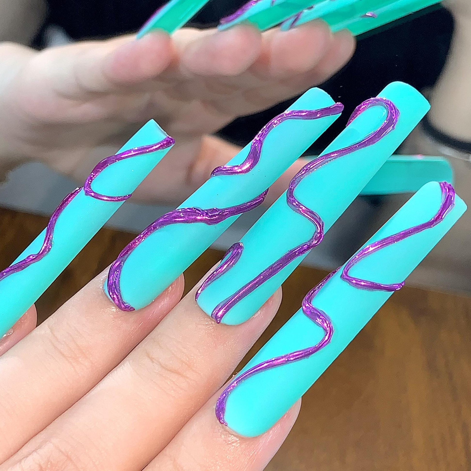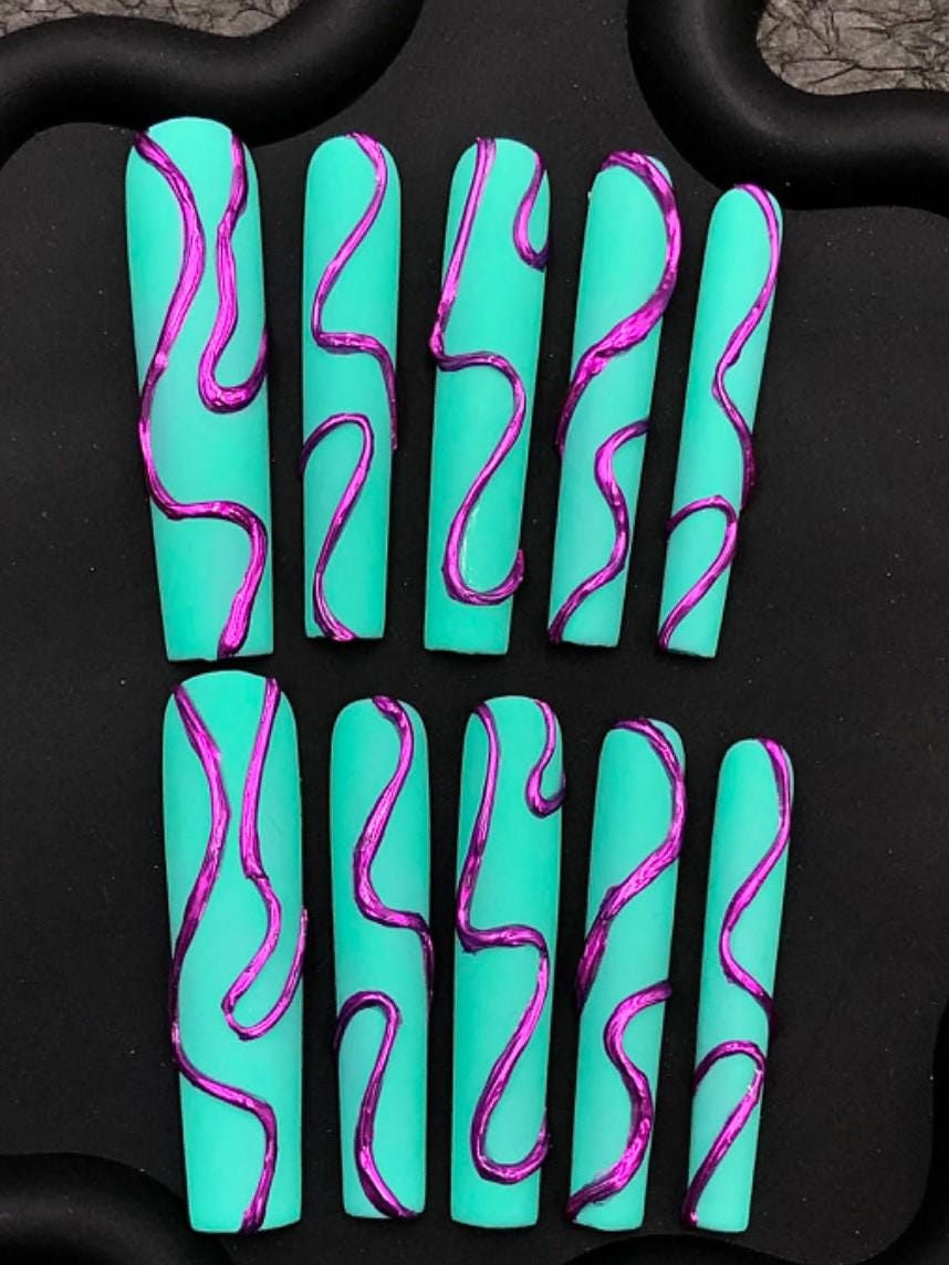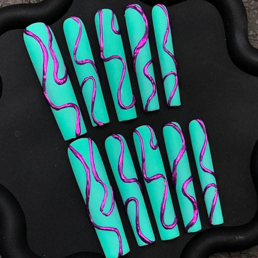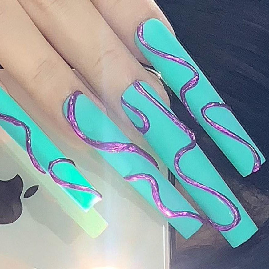 This striking press-on nail set features a bold matte teal base with glossy metallic purple abstract swirl accents. With a sleek and artistic vibe, this ultra-modern design is perfect for trendsetters, editorial styles, or anyone looking to add a futuristic flair to their nail game.