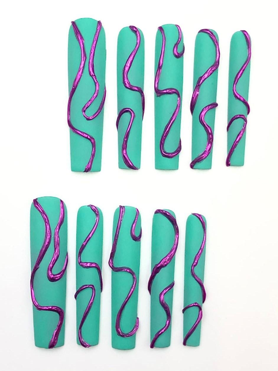 Teal Matte Press-On Nails with Metallic Purple Abstract Swirls Modern Minimalist Nail Set Artificial reusable fake glue on faux nails art