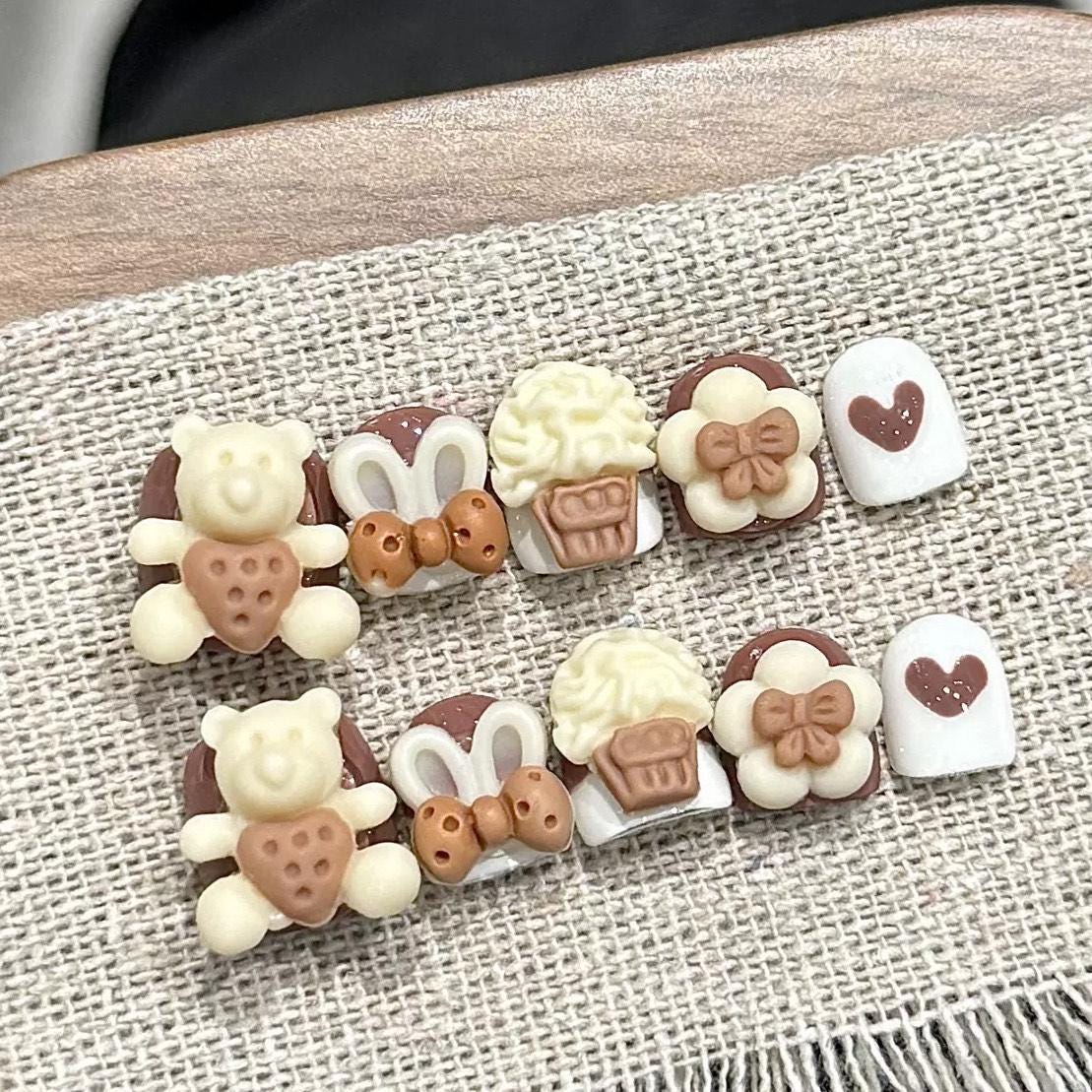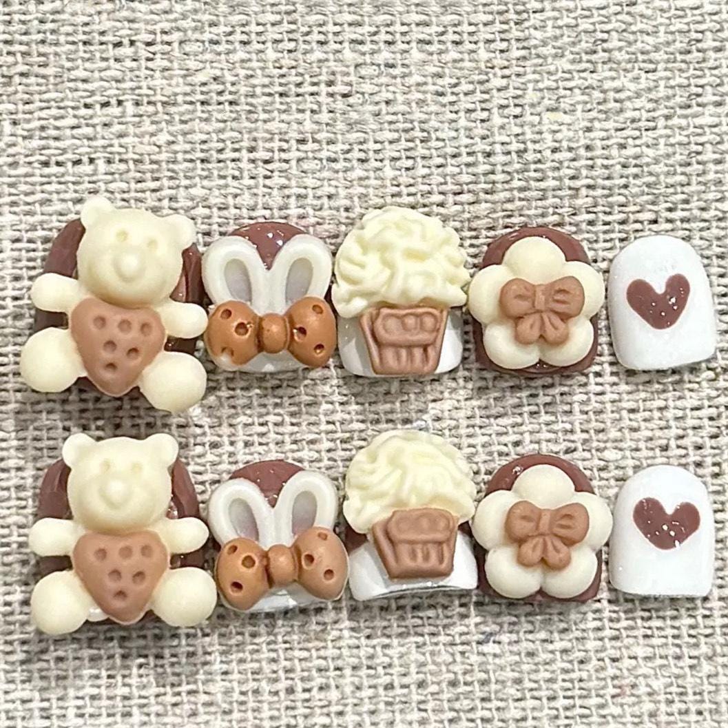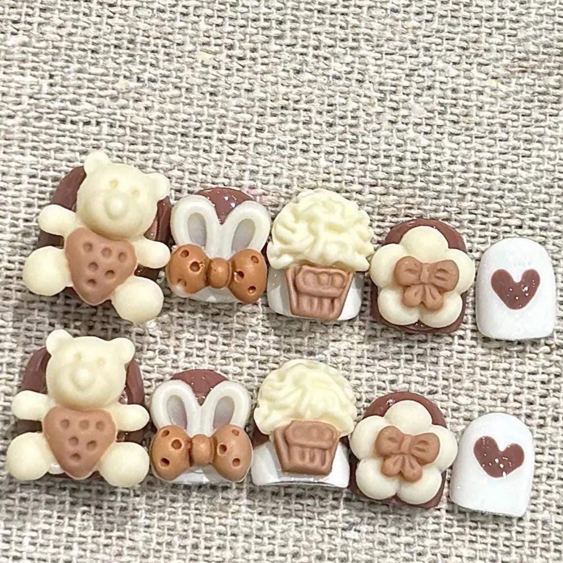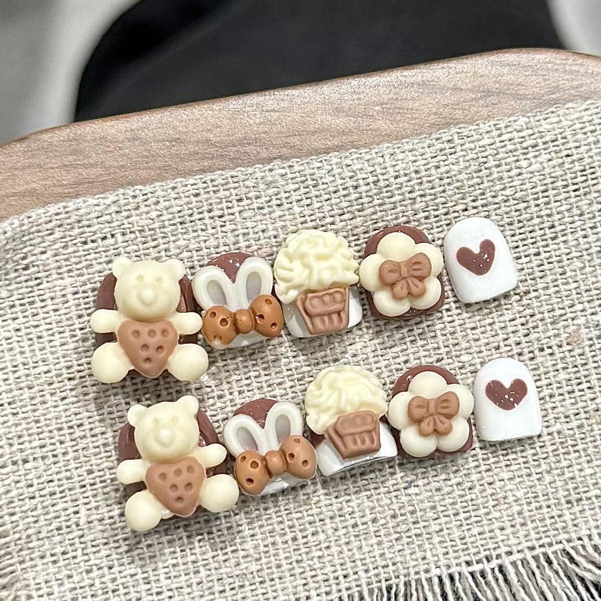 Teddy Bear Cupcake Bunny Kids Press On Nails–Sweet Bakery Brown 3D Nail Set. Artificial reusable fake glue on faux manicure nail trendy art.