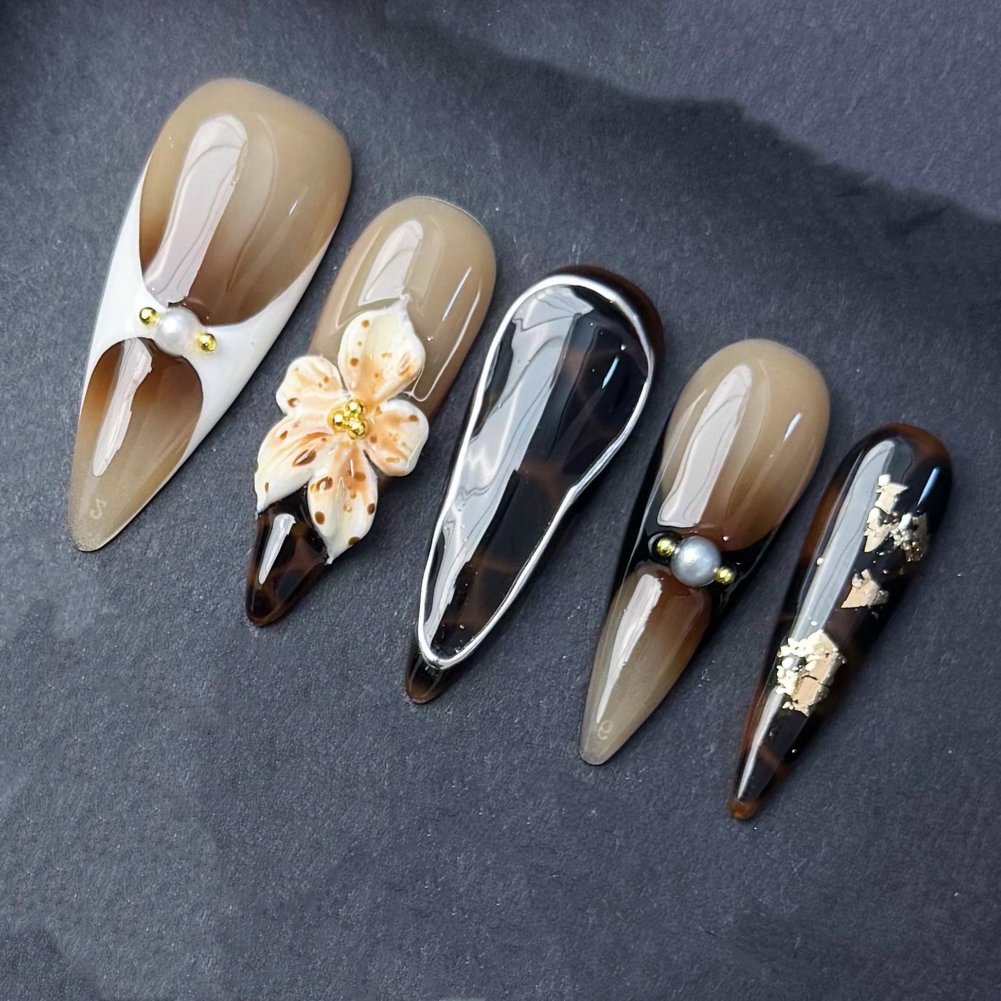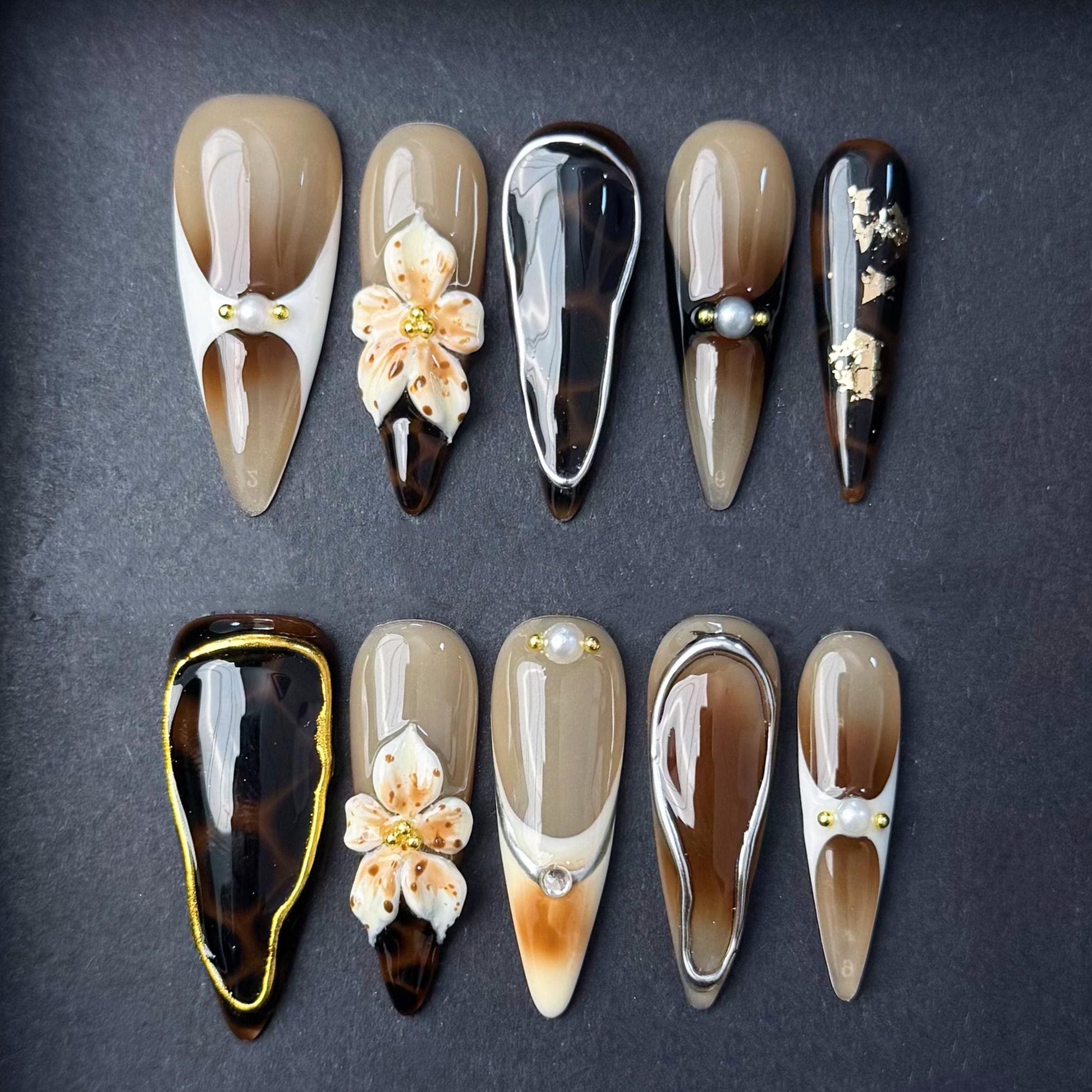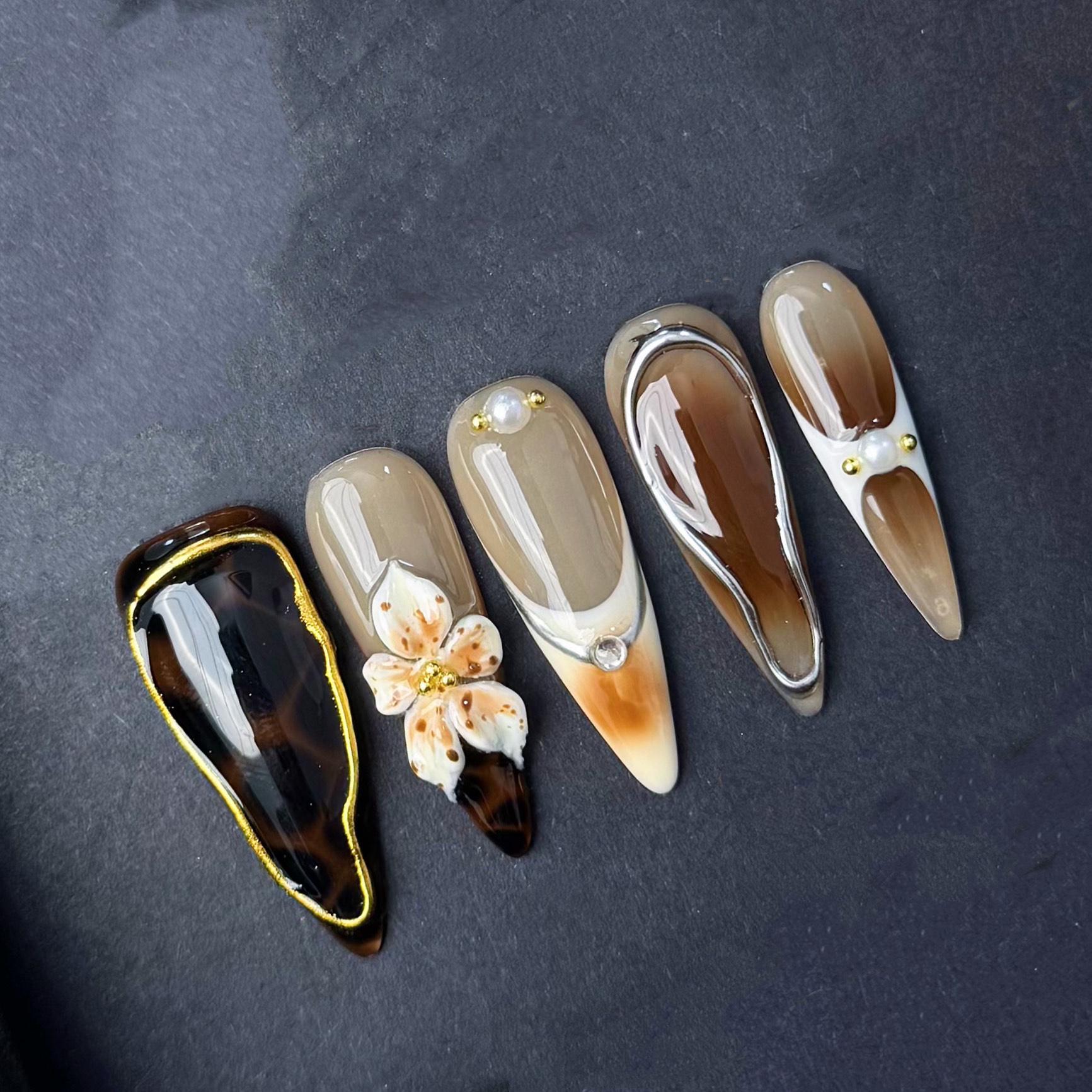 This elegant tortoise shell press on nail set blends earthy neutrals with high-gloss shine and luxe details. Featuring rich brown and beige tones with deep amber marbling each nail is accented with sculpted 3d orchid flowers pearls and metallic framing. The organic textures and refined color palette make this set perfect for autumn events sophisticated everyday wear or a nature inspired statement look. Handmade with premium gel and fully reusable.