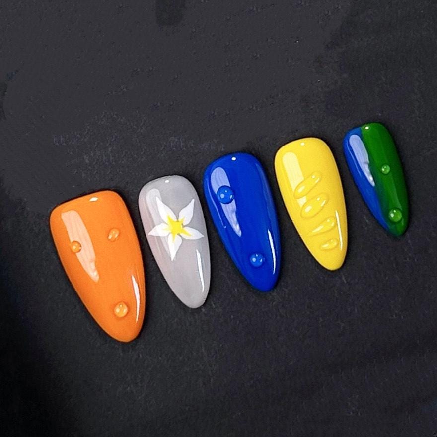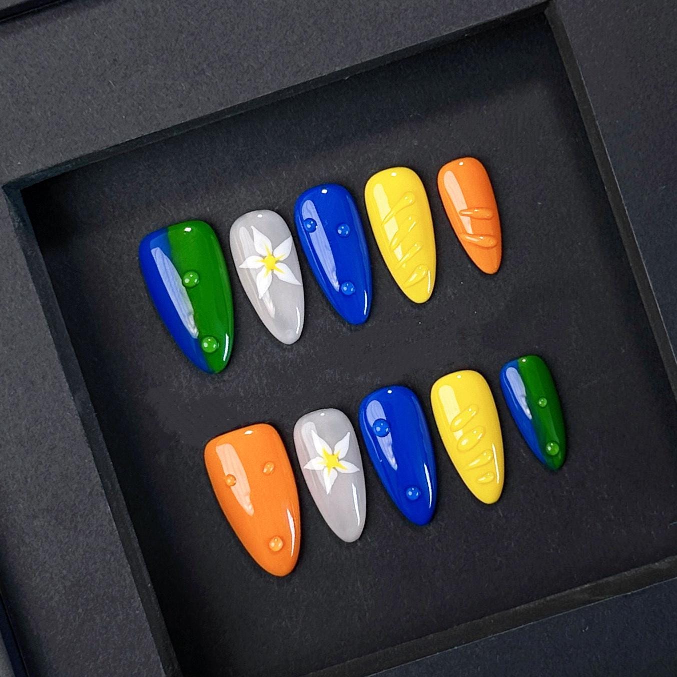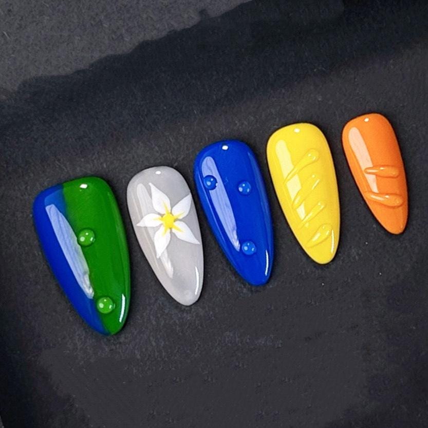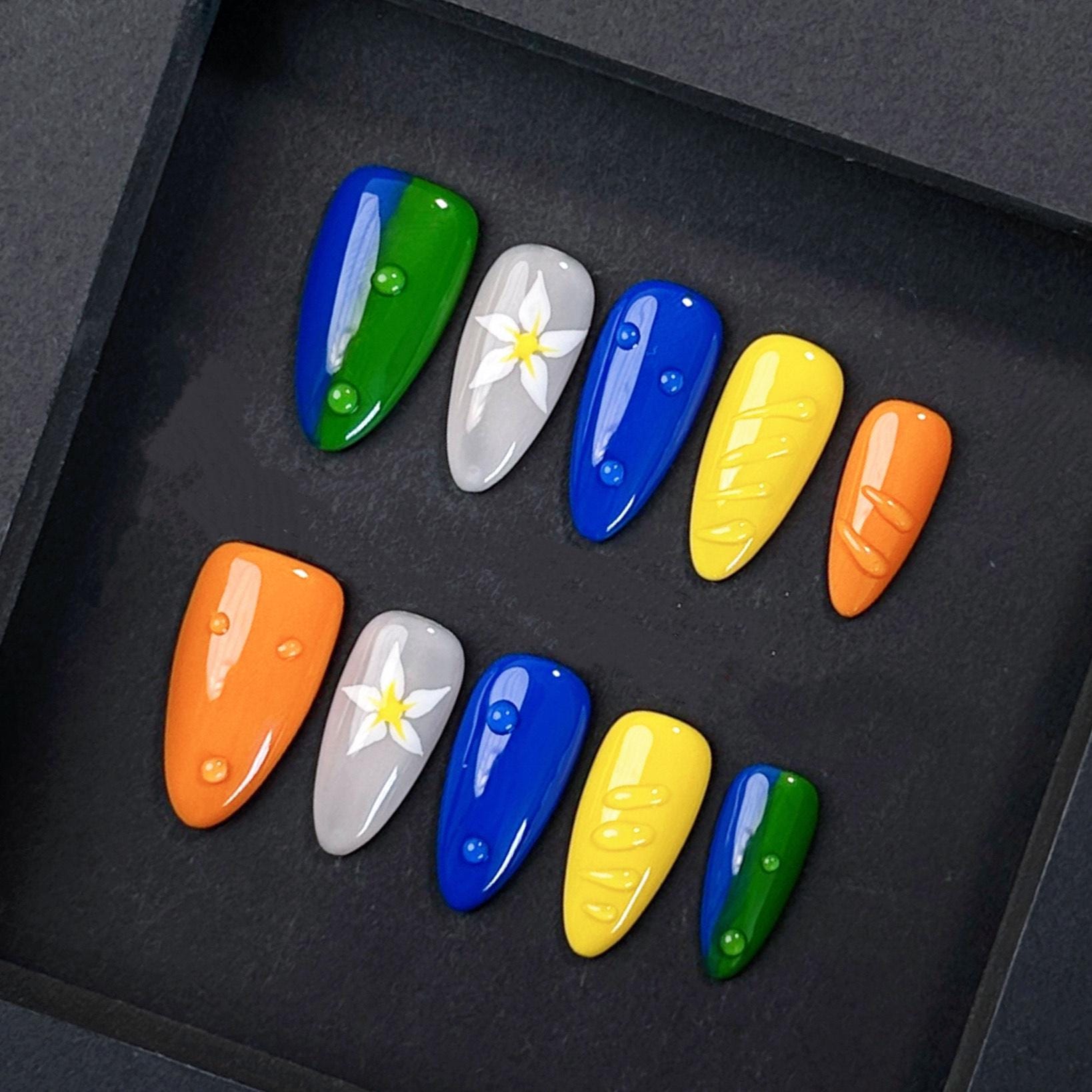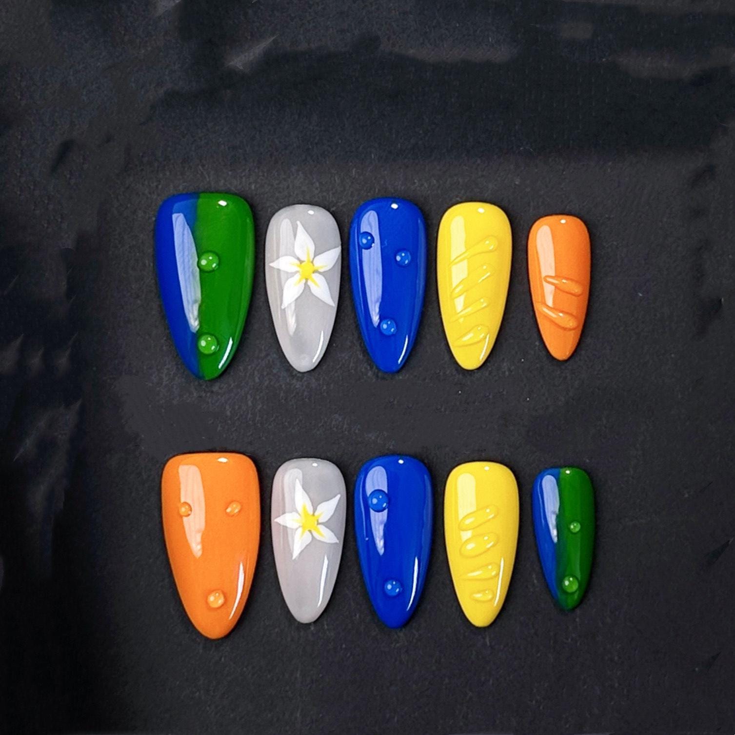 Make a vibrant statement with these tropical rainbow press-on nails! This cheerful set features a playful mix of bold colors—blue, green, orange, yellow, and gray—accented with 3D raindrop-style gloss and delicate hand-painted white florals. The almond shape gives a flattering silhouette while the glossy finish adds a sleek, eye-catching shine.