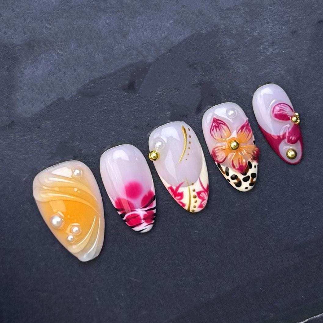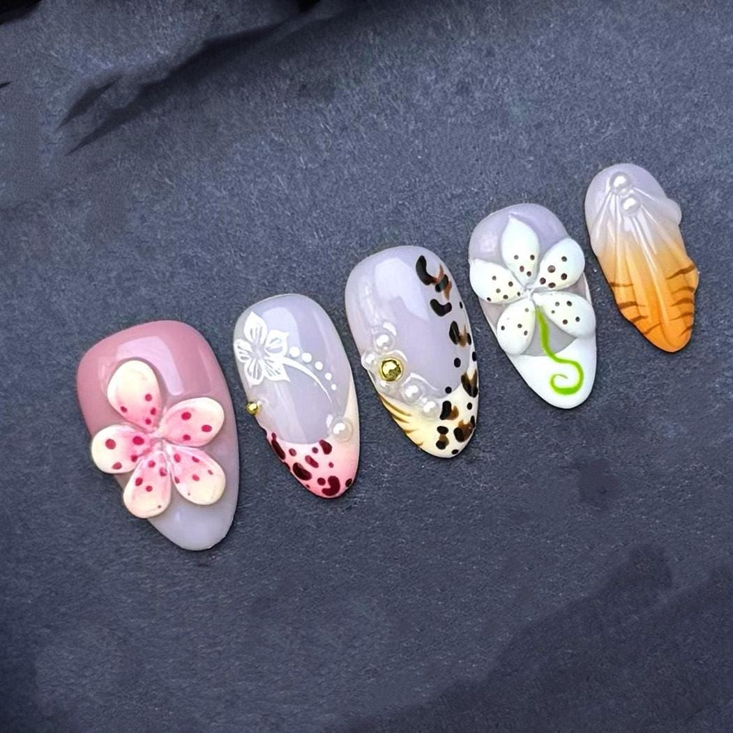 This vibrant press on nail set features a fun mix of safari and floral vibes, including leopard print accents, 3D blossoms, butterflies, pearls, and a cicada wing detail. With bold tropical colors like orange, pink, and gold, these nails are perfect for summer vacations, festivals, or wild glam looks.