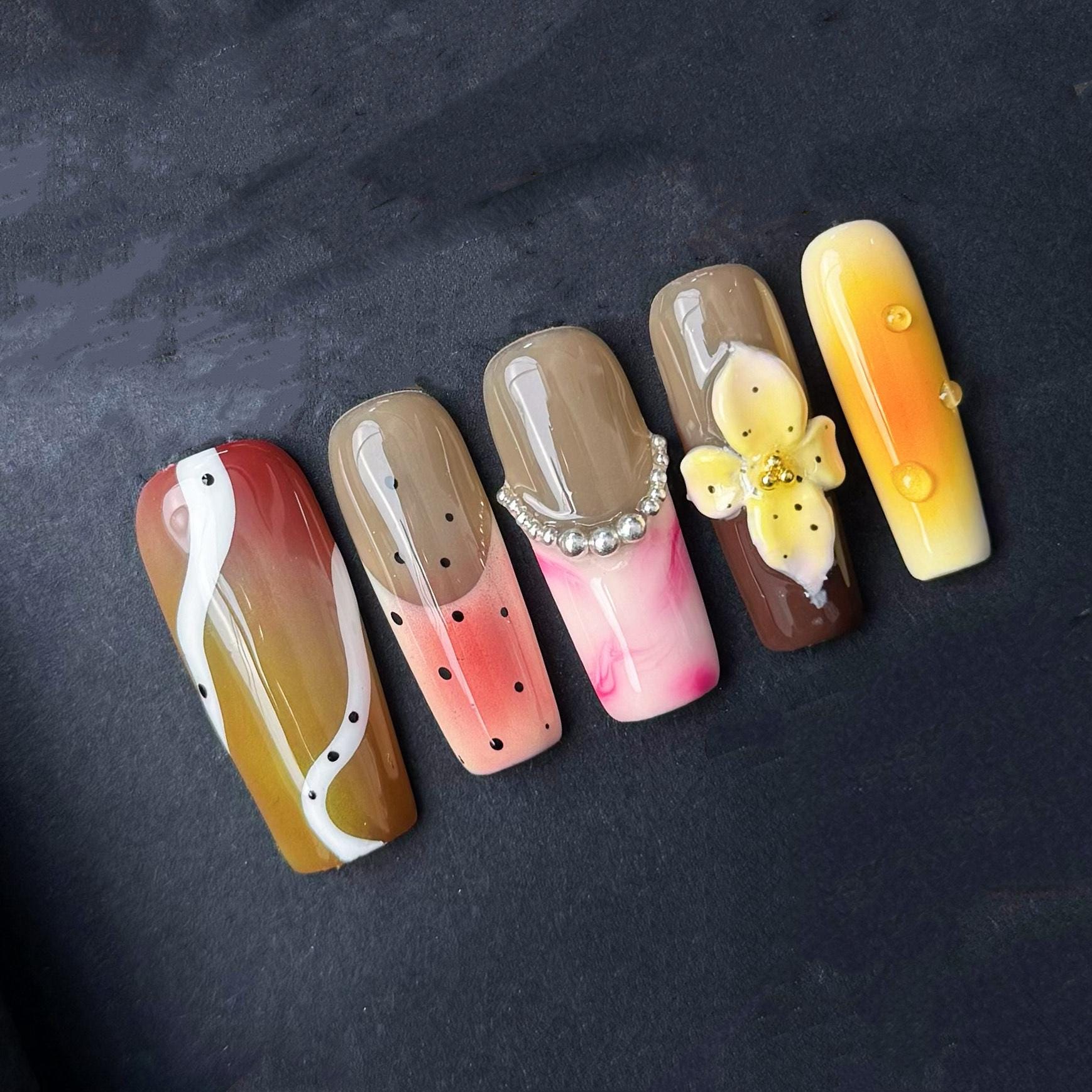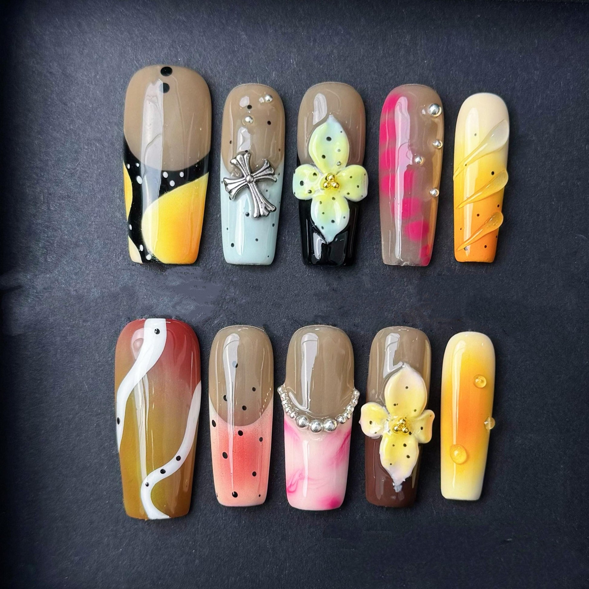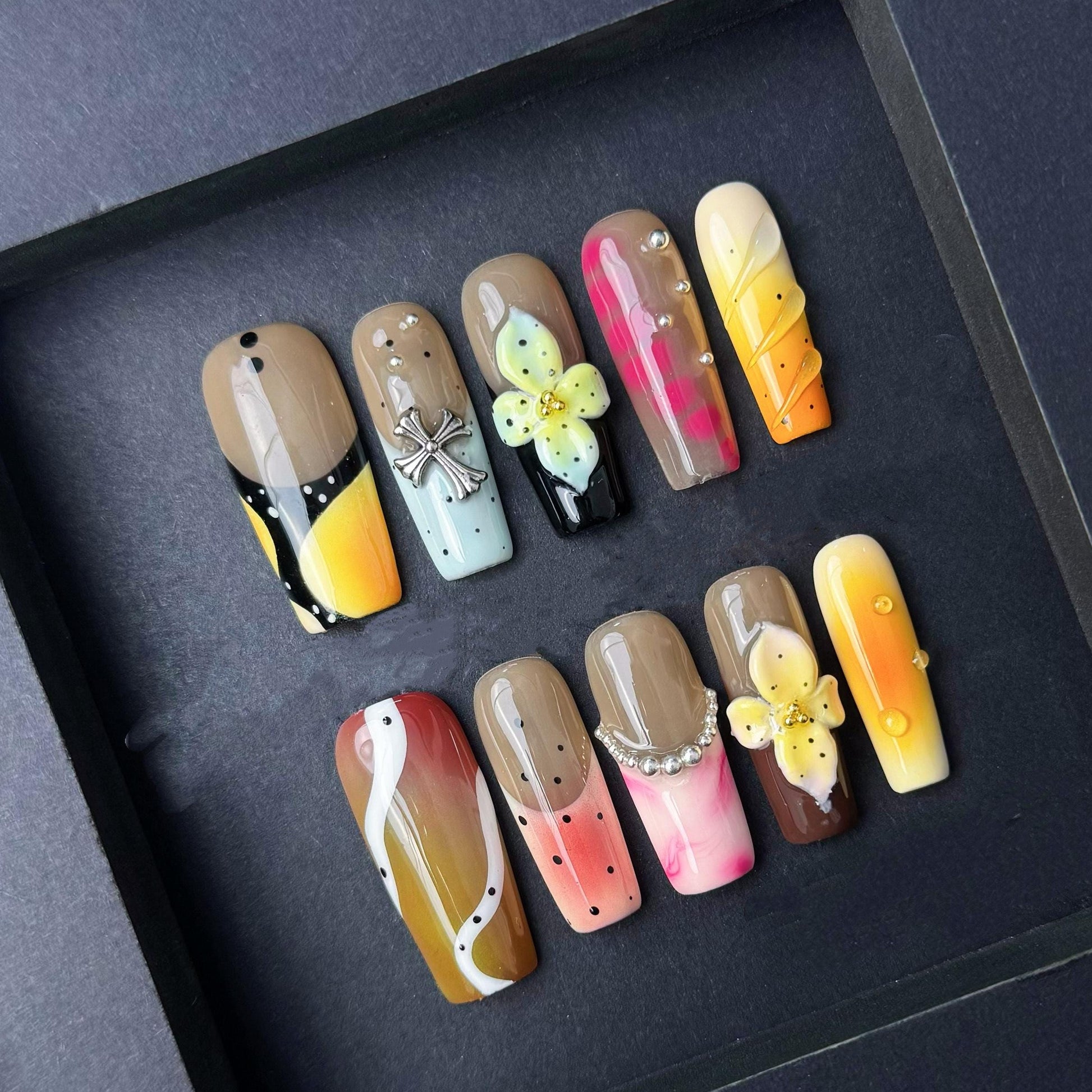 This bold and vibrant nail set features a tropical-inspired mix of designs including a sunset ombre gradient abstract black and yellow art a silver cross charm a 3D yellow flower and a fun hot pink checkered accent. Perfect for summer vacations festivals or anyone looking to make a bright stylish statement with their nails.