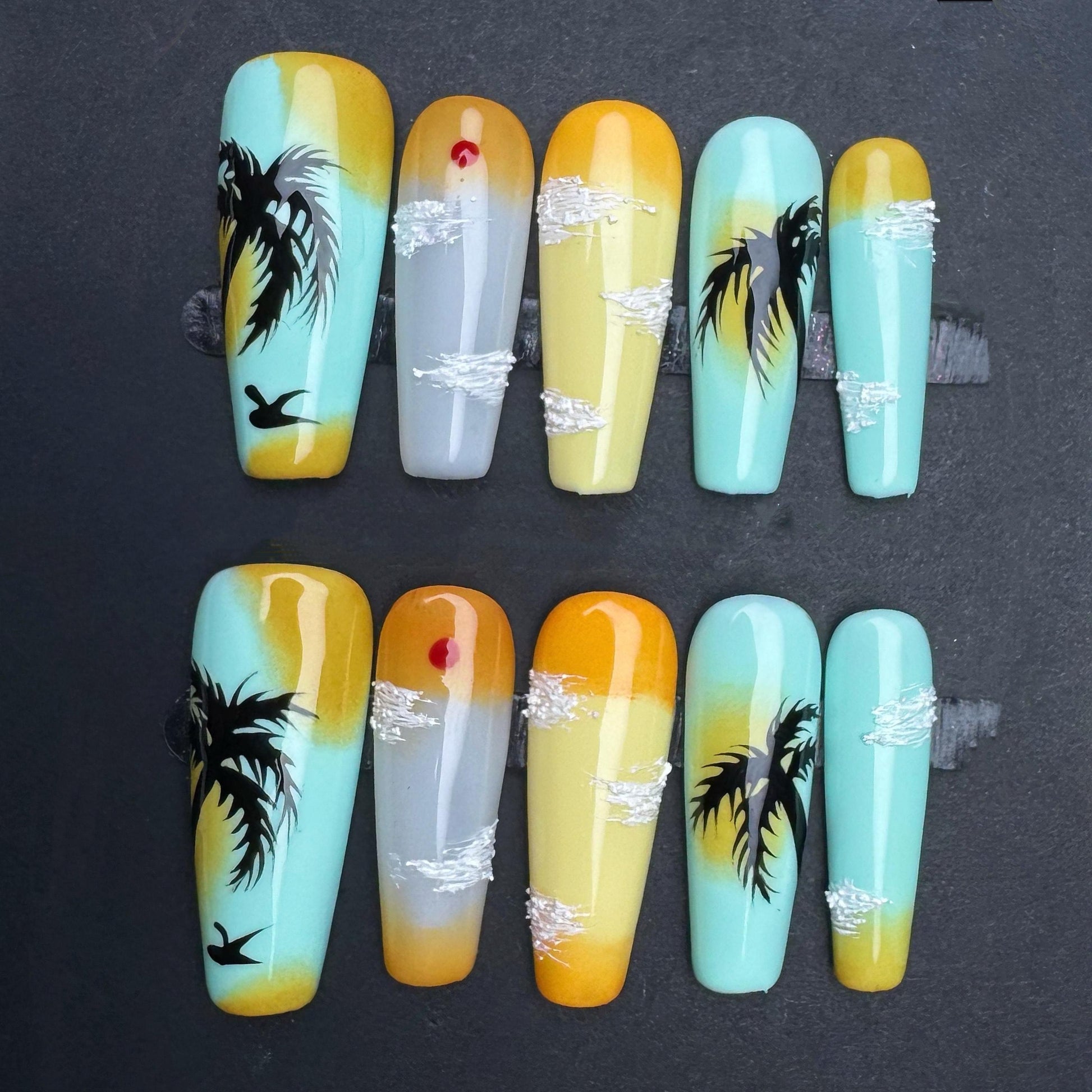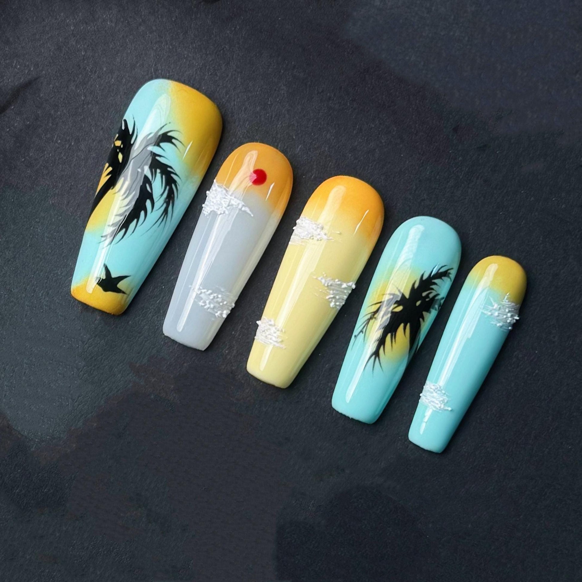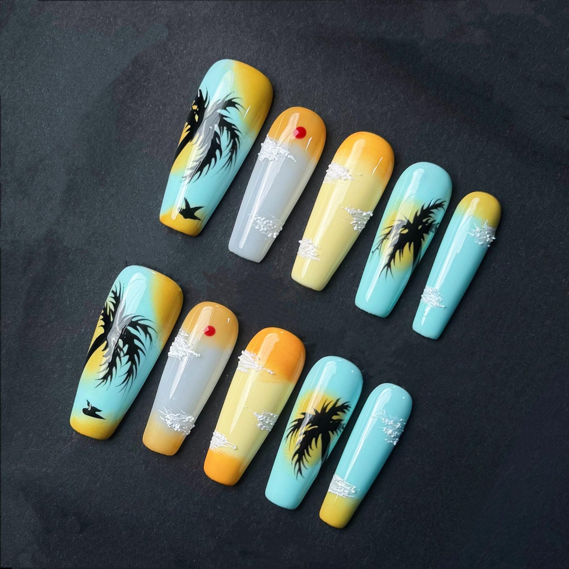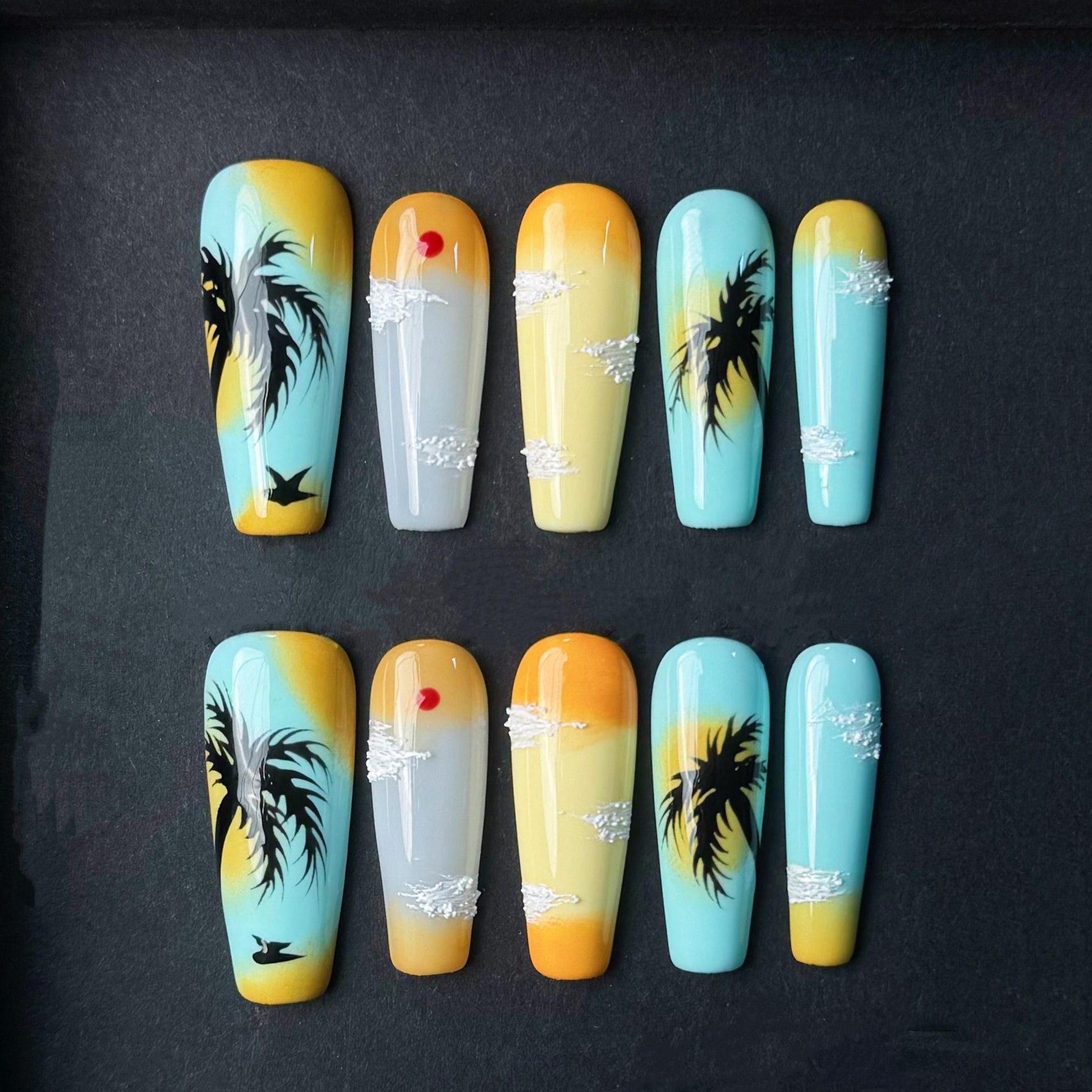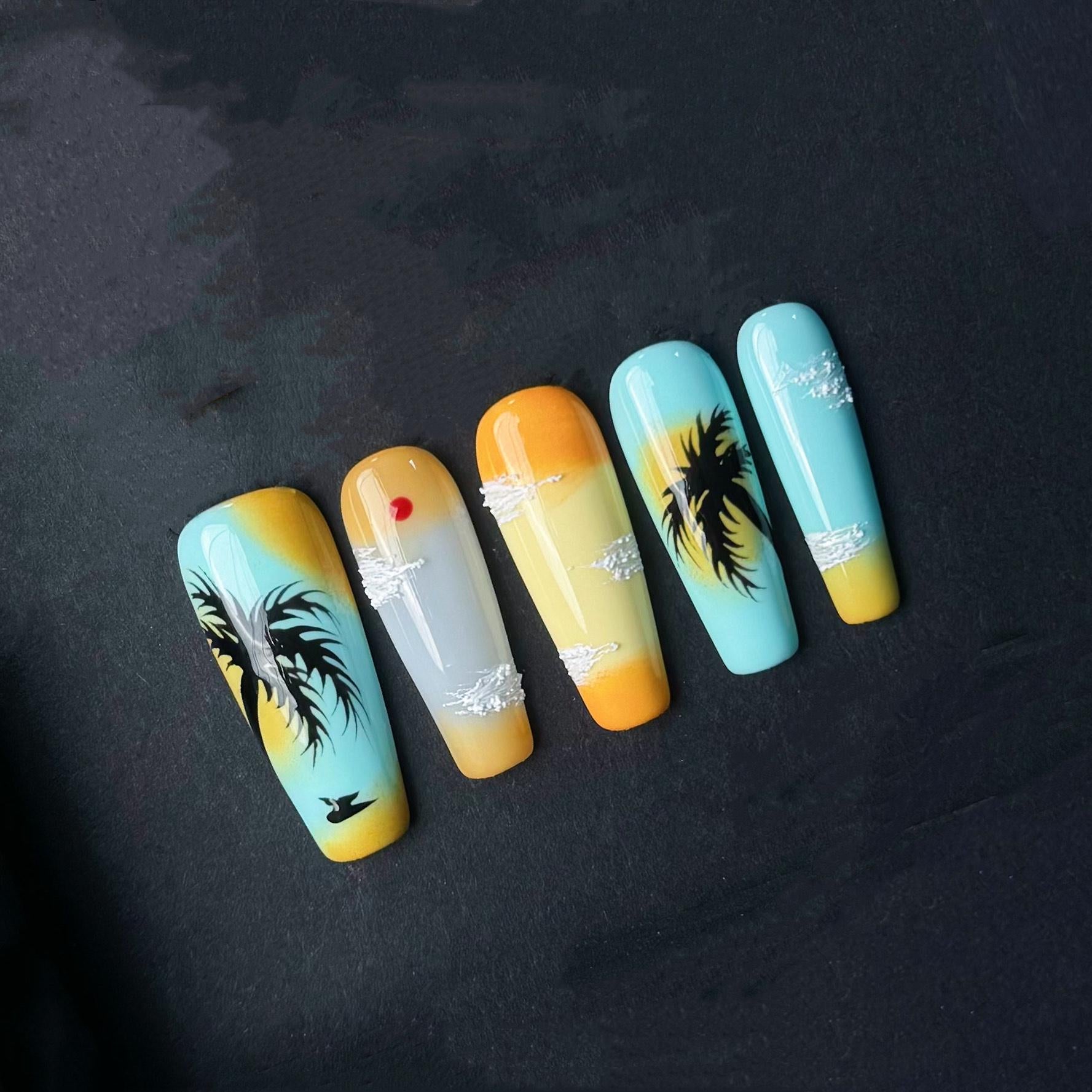 This stunning set of press on nails captures the serene beauty of a tropical sunset in hand-painted detail. Featuring a warm gradient from golden yellow to ocean blue, each nail showcases scenic elements like silhouetted palm trees, fluffy white clouds, flying birds, and a glowing red sun. The artistic sky-inspired design radiates calm, making these long stiletto-shaped nails perfect for beach lovers, summer vacations, or dreamy getaway vibes. Handmade with care, these nails bring a little piece of paradise to your fingertips.