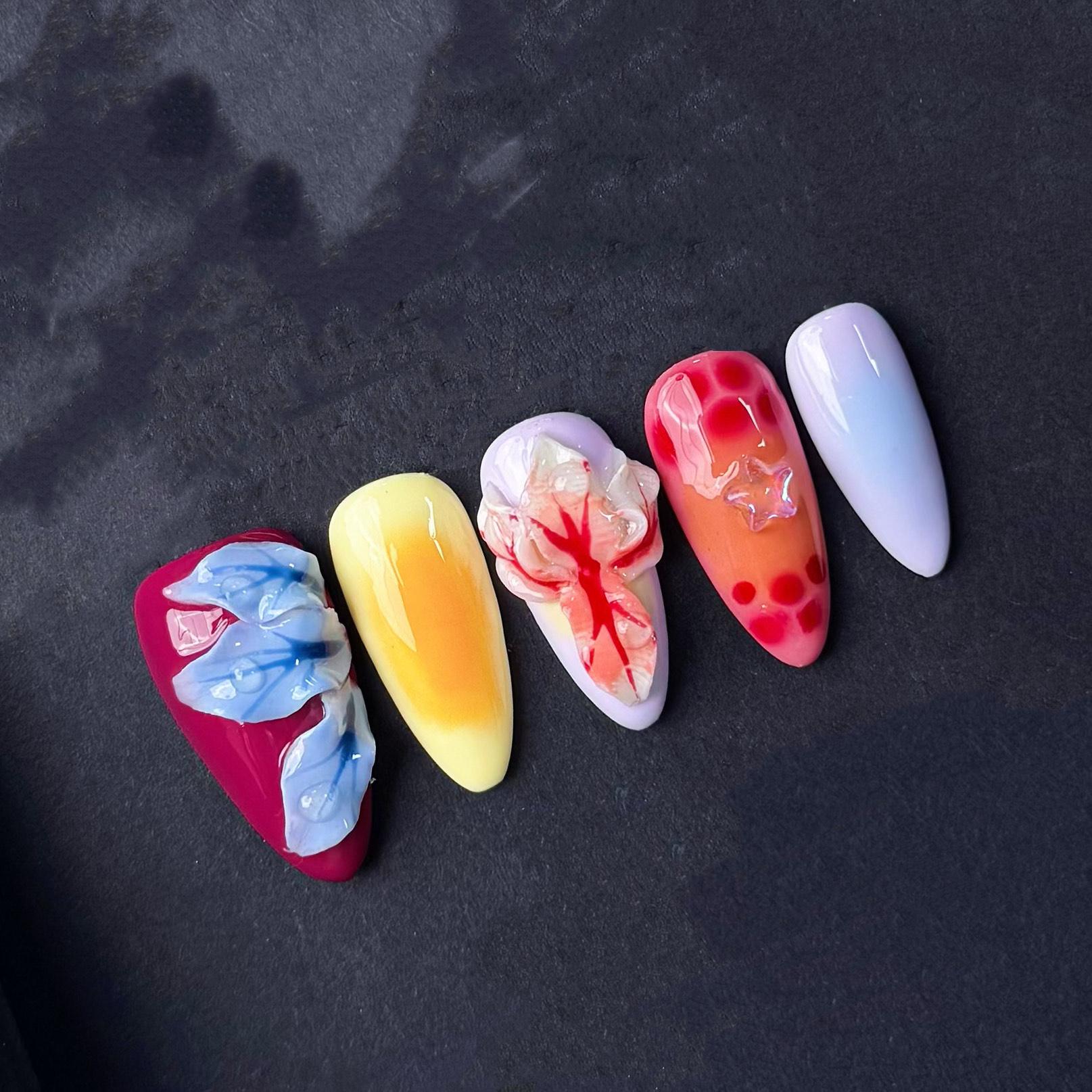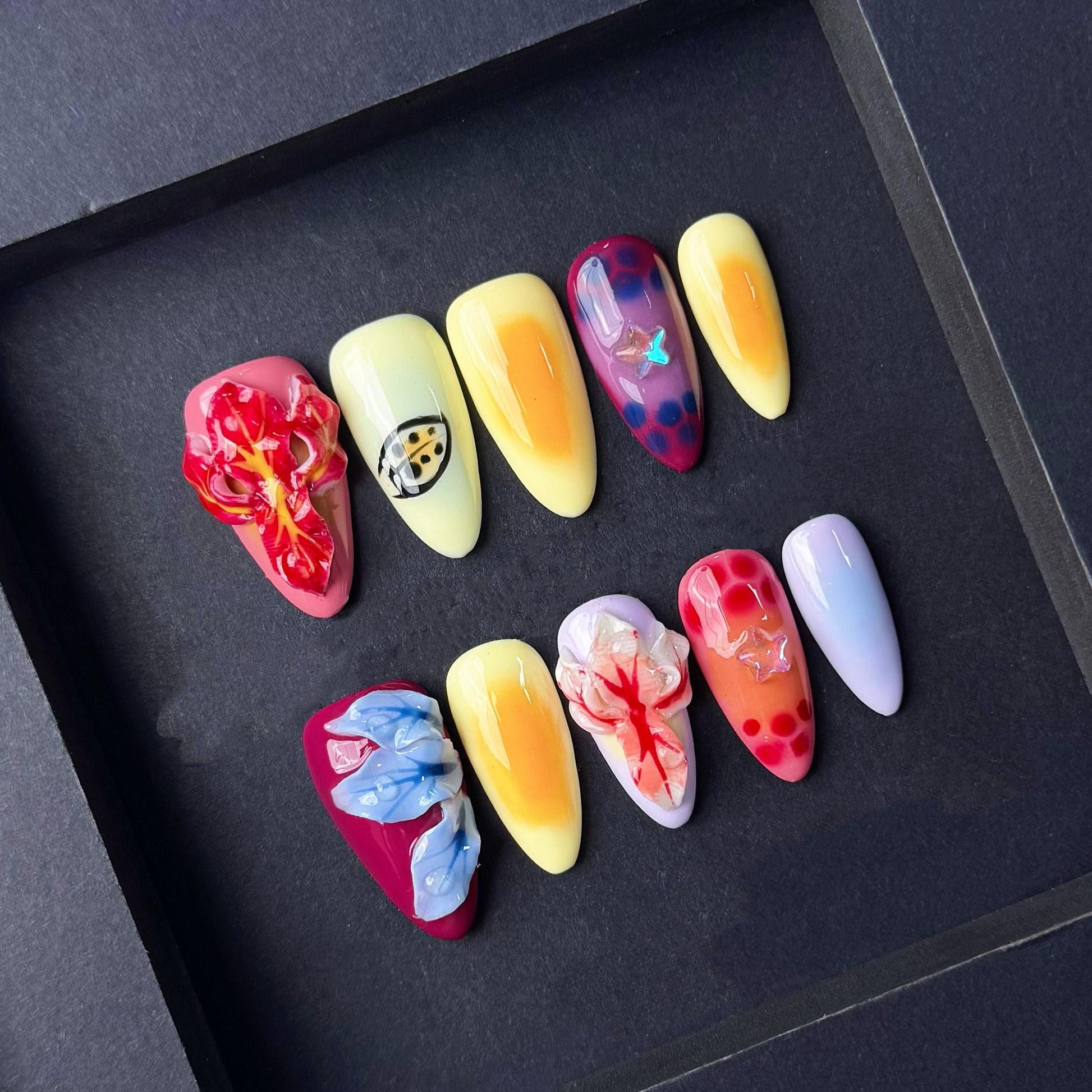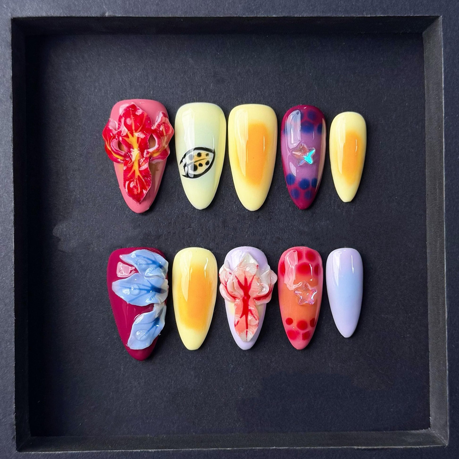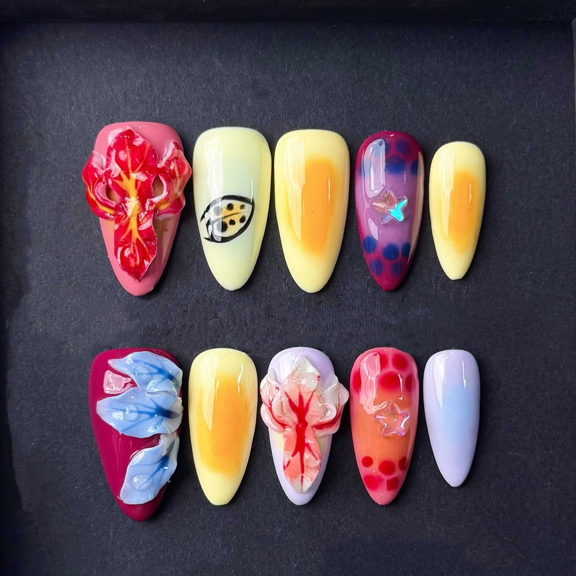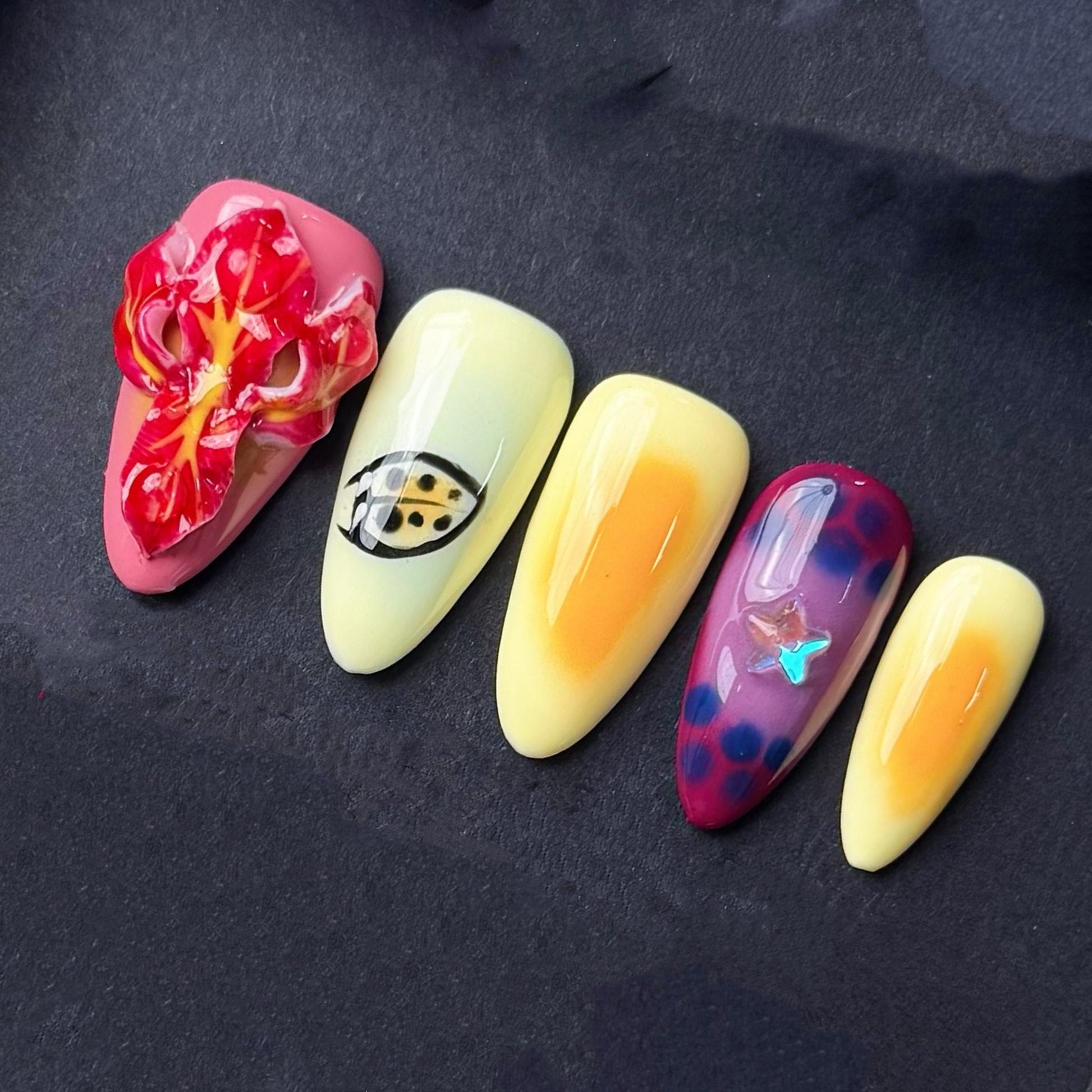 This vivid and playful set of press on nails bursts with tropical warmth and creativity. The set features ombré gradients in sunset hues of yellow, orange, and magenta, alongside bold 3D sculpted flowers in red, blue, and soft pink. Fun fruit-inspired designs mimic the textures of dragon fruit and grapes, complete with dotted accents and glossy finishes. One nail features a tiny ladybug for a whimsical touch, while others include iridescent stars for sparkle. Perfect for vacations, summer parties, or botanical lovers, this almond-shaped handmade set is a lively tropical fantasy for your fingertips.
