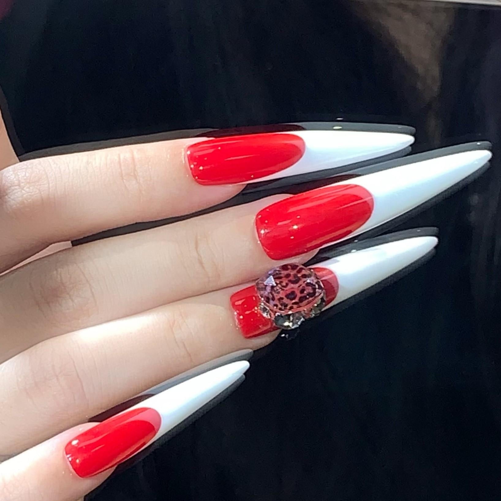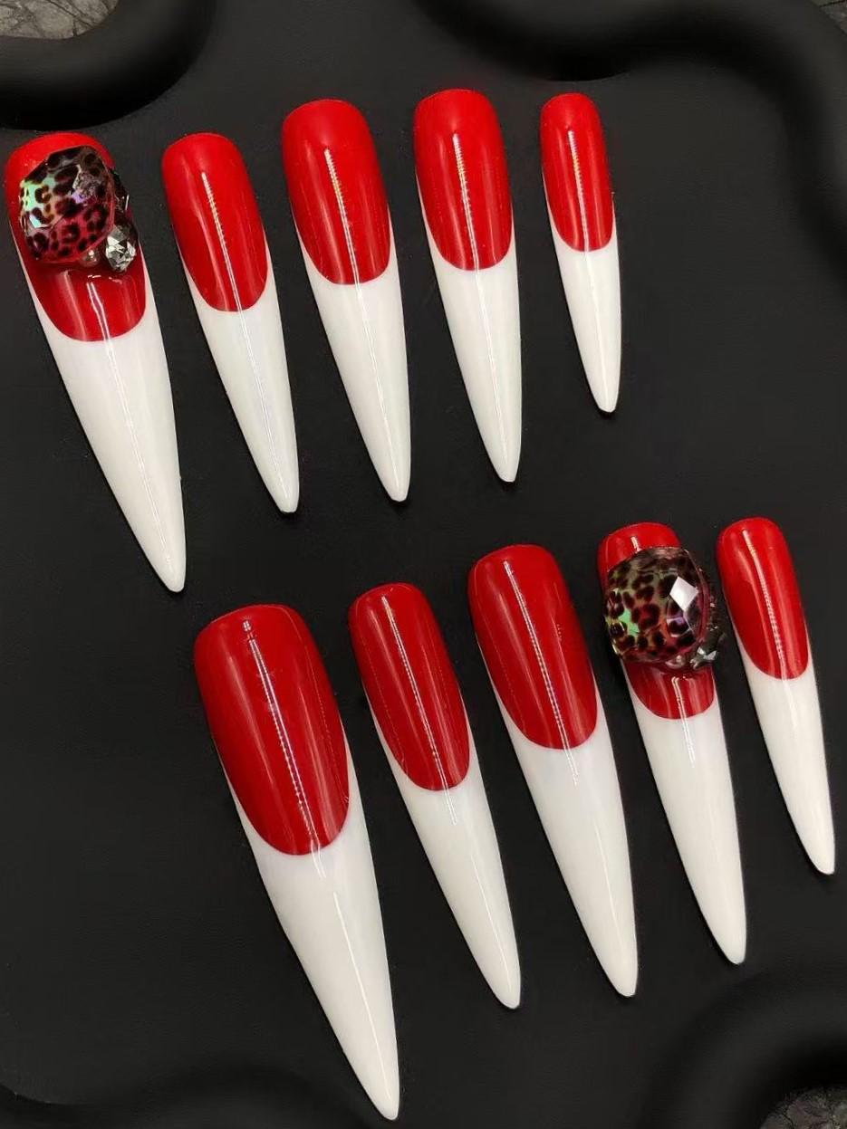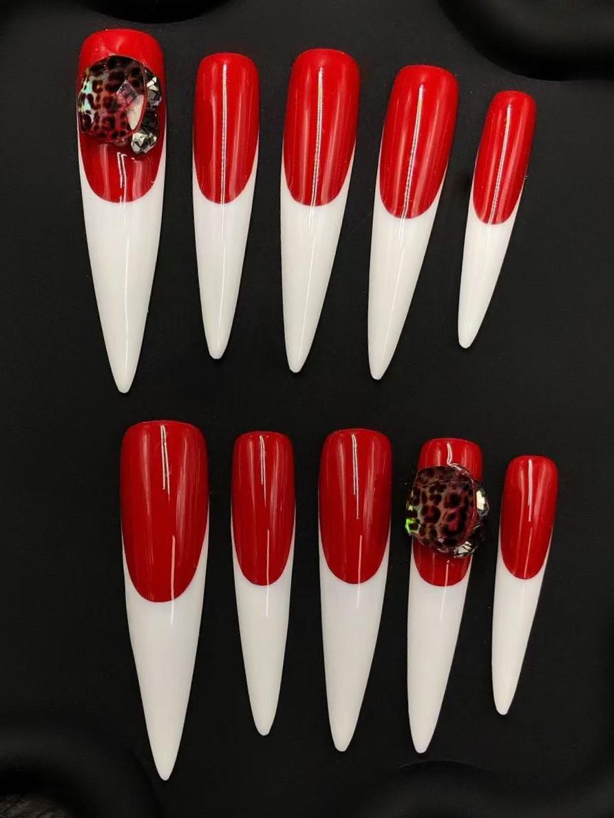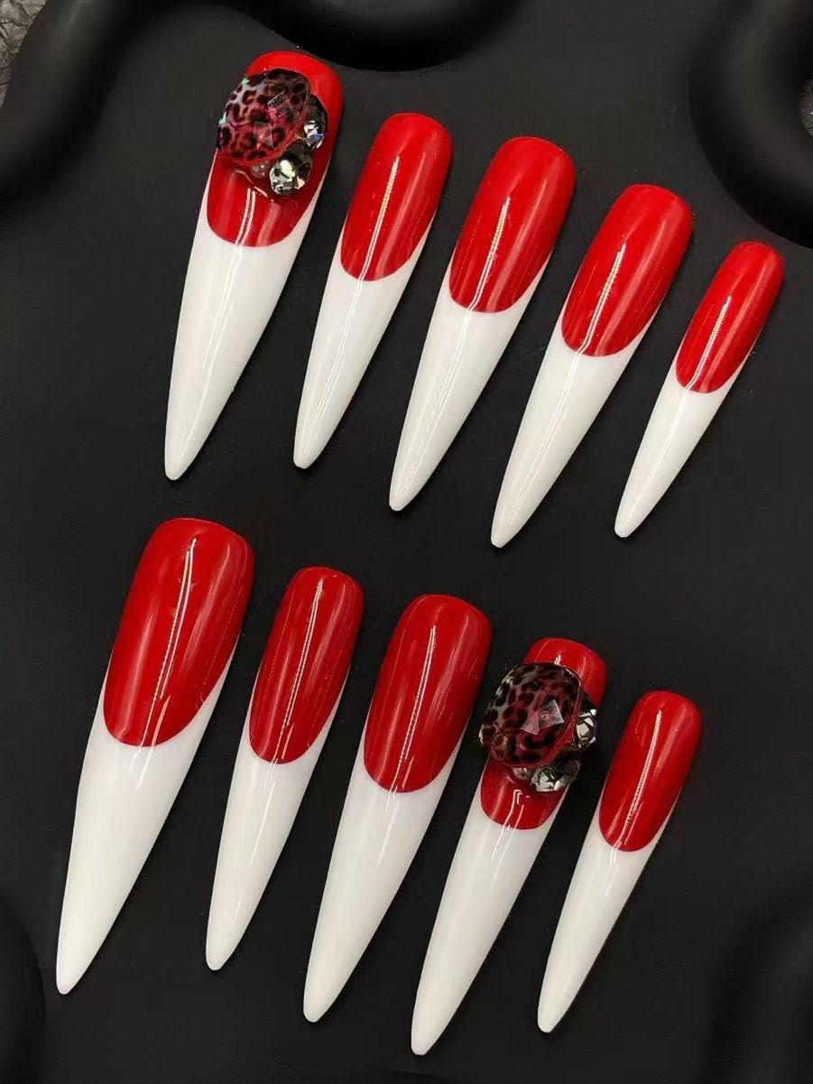 Vampire Fang French Press On Nails – Red & White Stiletto with Gothic Gem Accent Artificial reusable fake glue on faux manicure nails trendy