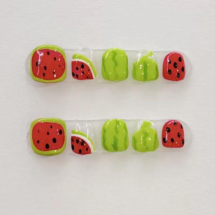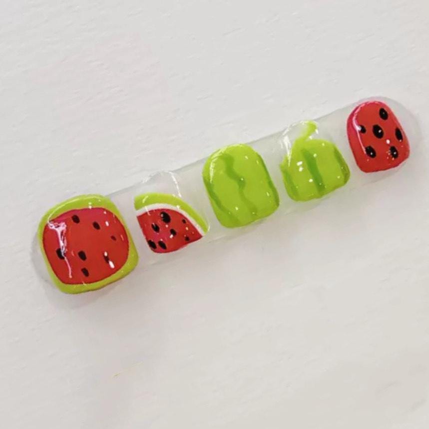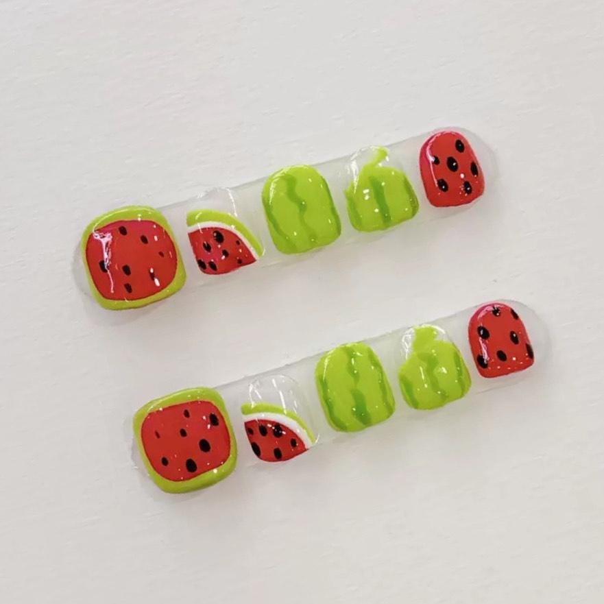 Watermelon Kids Press On Toenails Summer Fruit Nail Art for Girls. Artificial reusable fake glue on faux manicure nails trendy art.