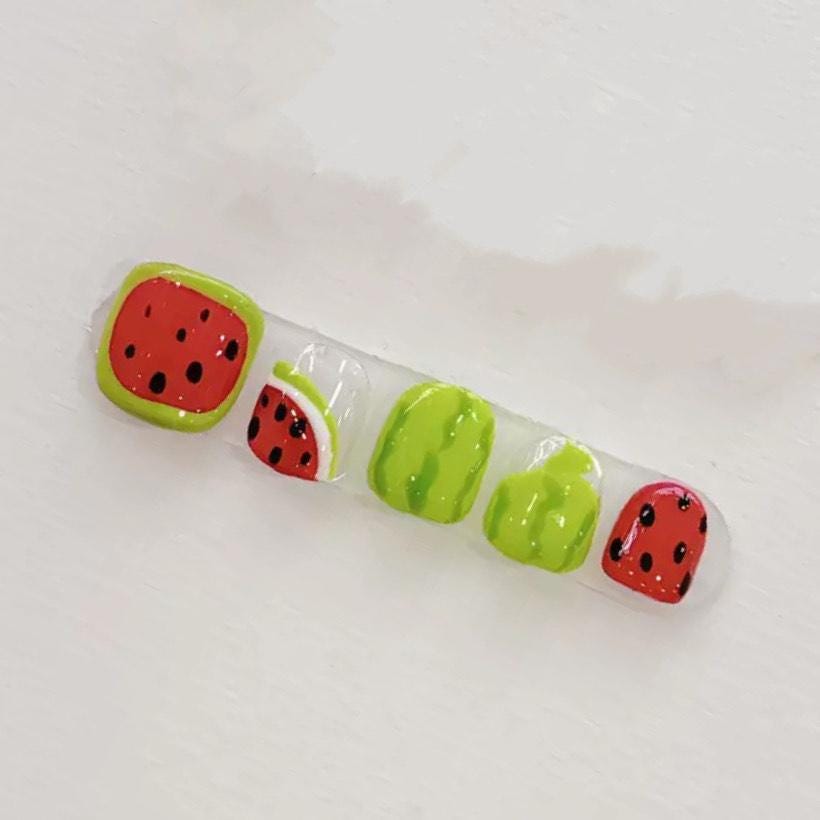 Bring the sweetness of summer to your child's tips with this adorable Watermelon Press-On nail Set for Kids! Featuring vibrant red slices with black seed accents and glossy green watermelon rinds, this fruity design is playful, colorful, and perfect for little ones who love fun nail art. These press-on nails are pre-shaped for tiny fingers and include a mix of square and rounded styles. The bright colors and shiny finish make them a hit for parties, playdates, photoshoots, or just some fruity fun at home.