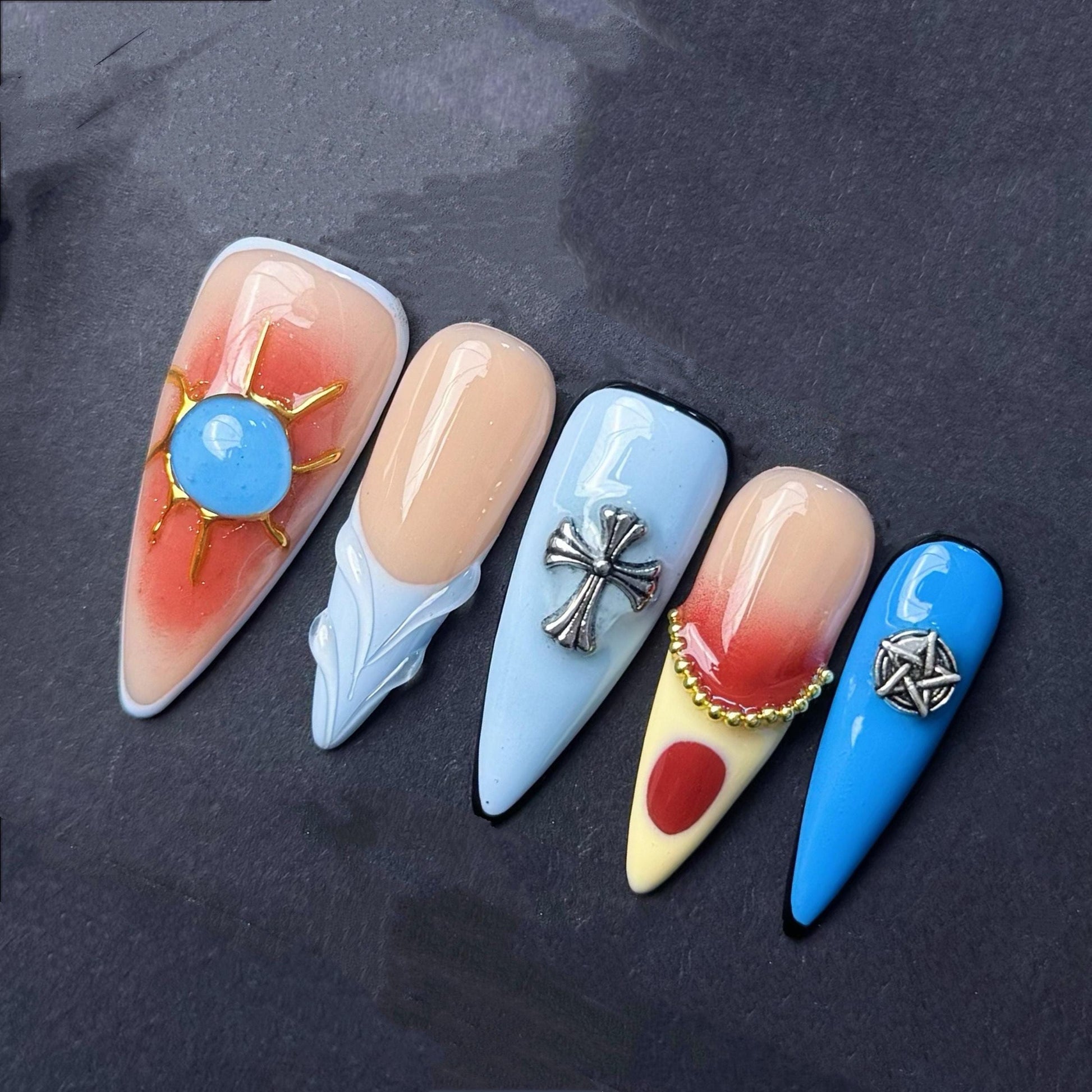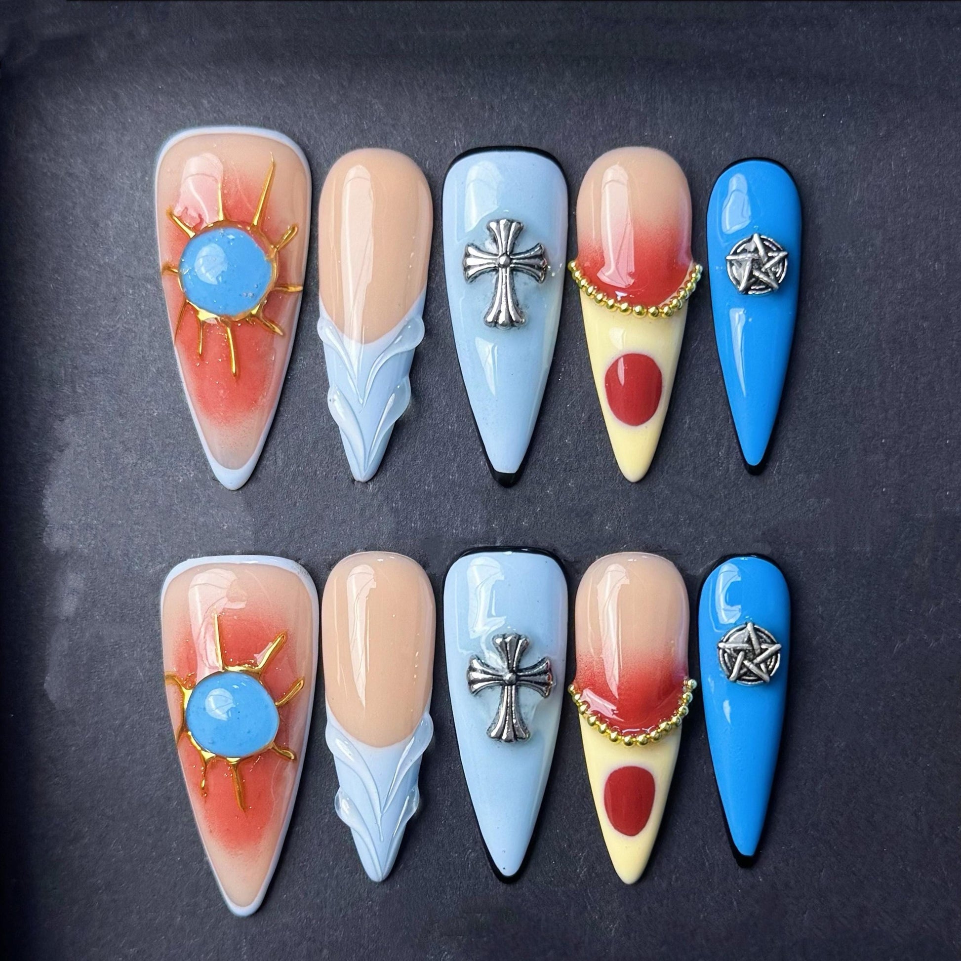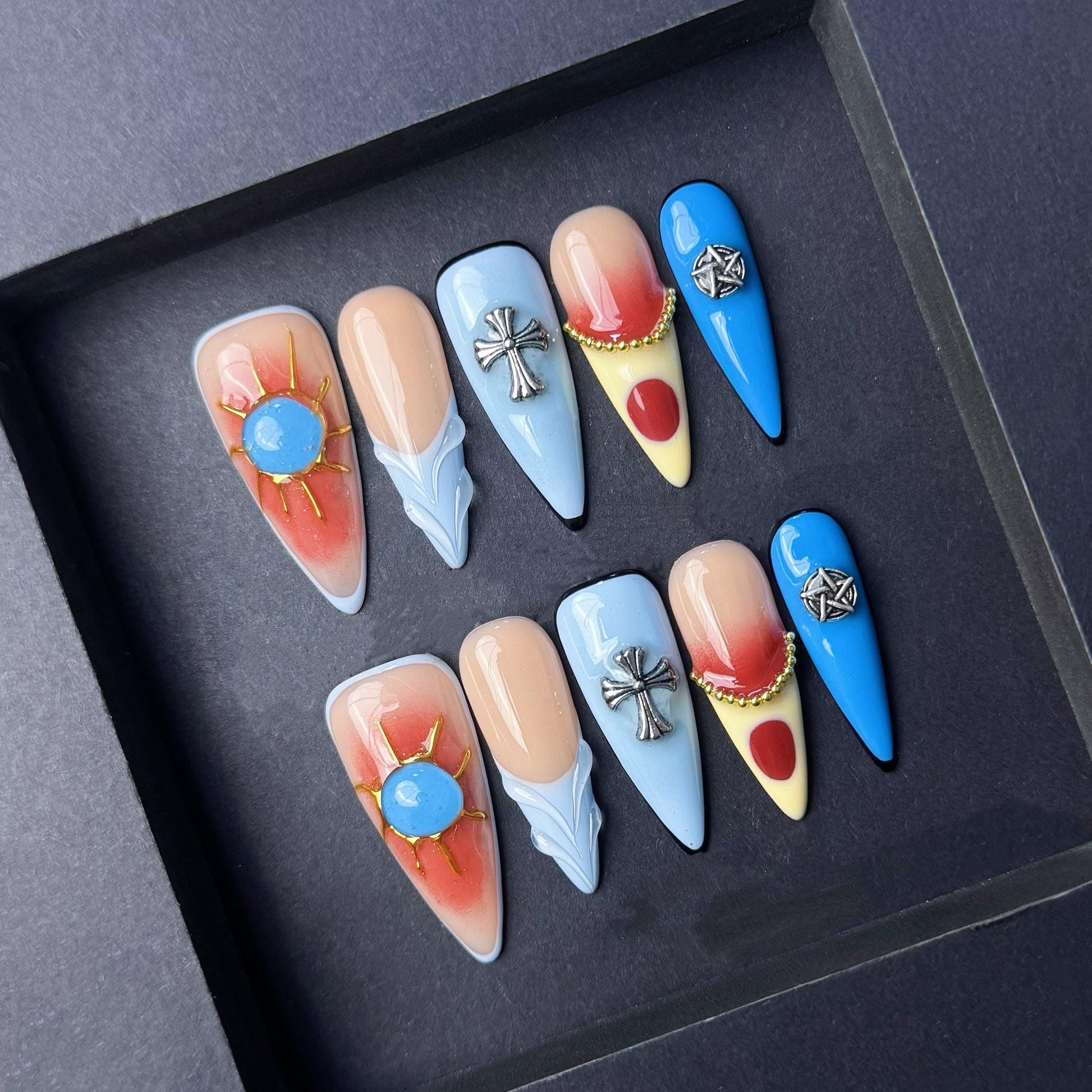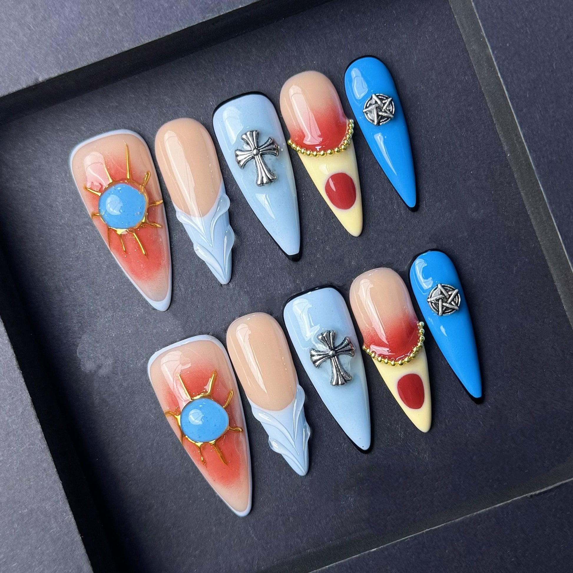 Channel a bold southwestern vibe with this vibrant cowboy-inspired press-on nail set. Each nail features distinct symbolic designs including a radiant sun with a blue center, metallic cross charms, and silver pentagram-style stars. The color palette mixes earthy red, sandy yellow, sky blue, and nude tones with clean lines and detailed charm embellishments. This eclectic mix combines spiritual symbolism with a rugged western aesthetic, perfect for rodeo season, country music fans, or anyone looking to bring edgy desert vibes to their manicure. Stand out with these statement nails that tell a story.
