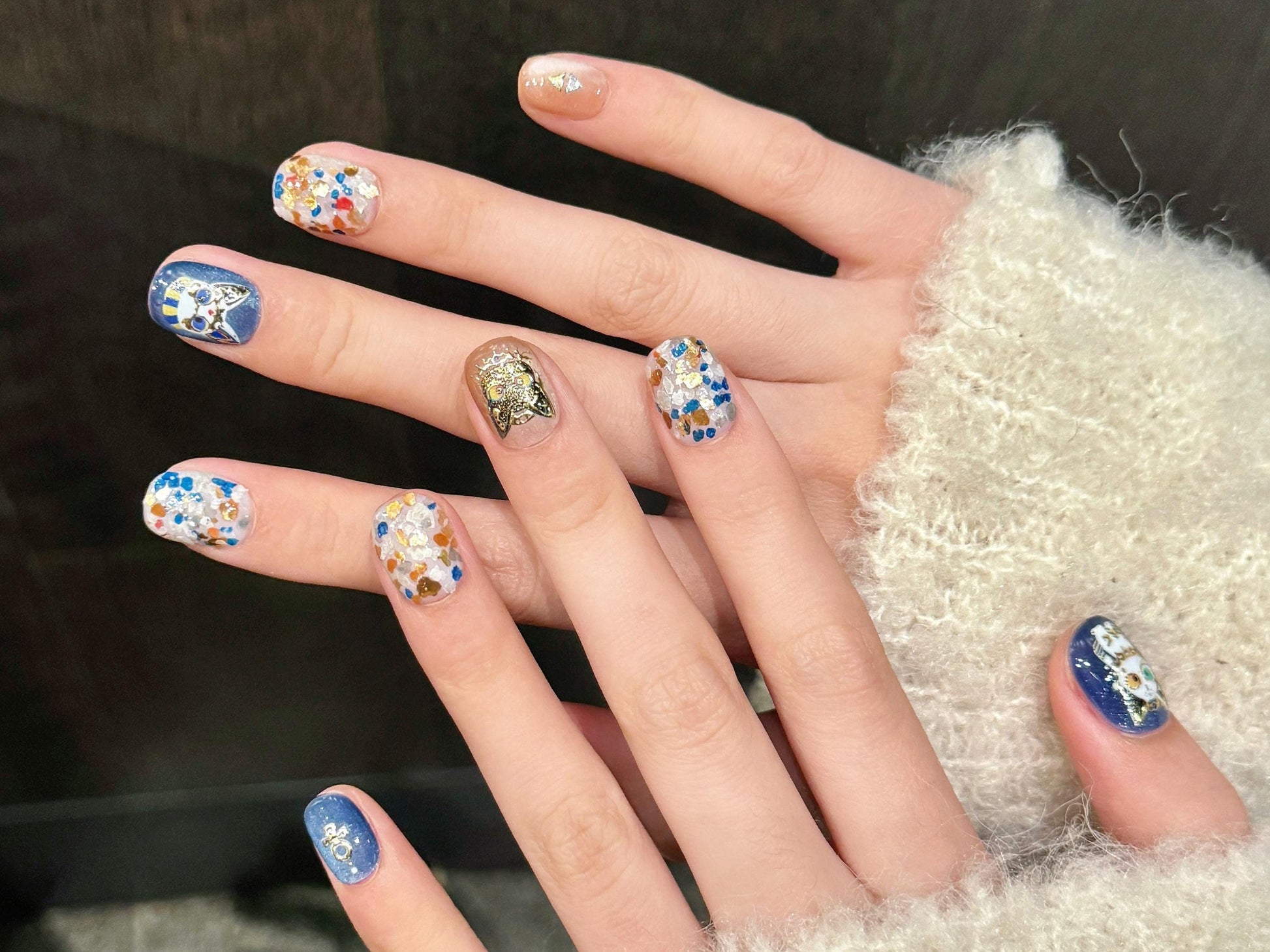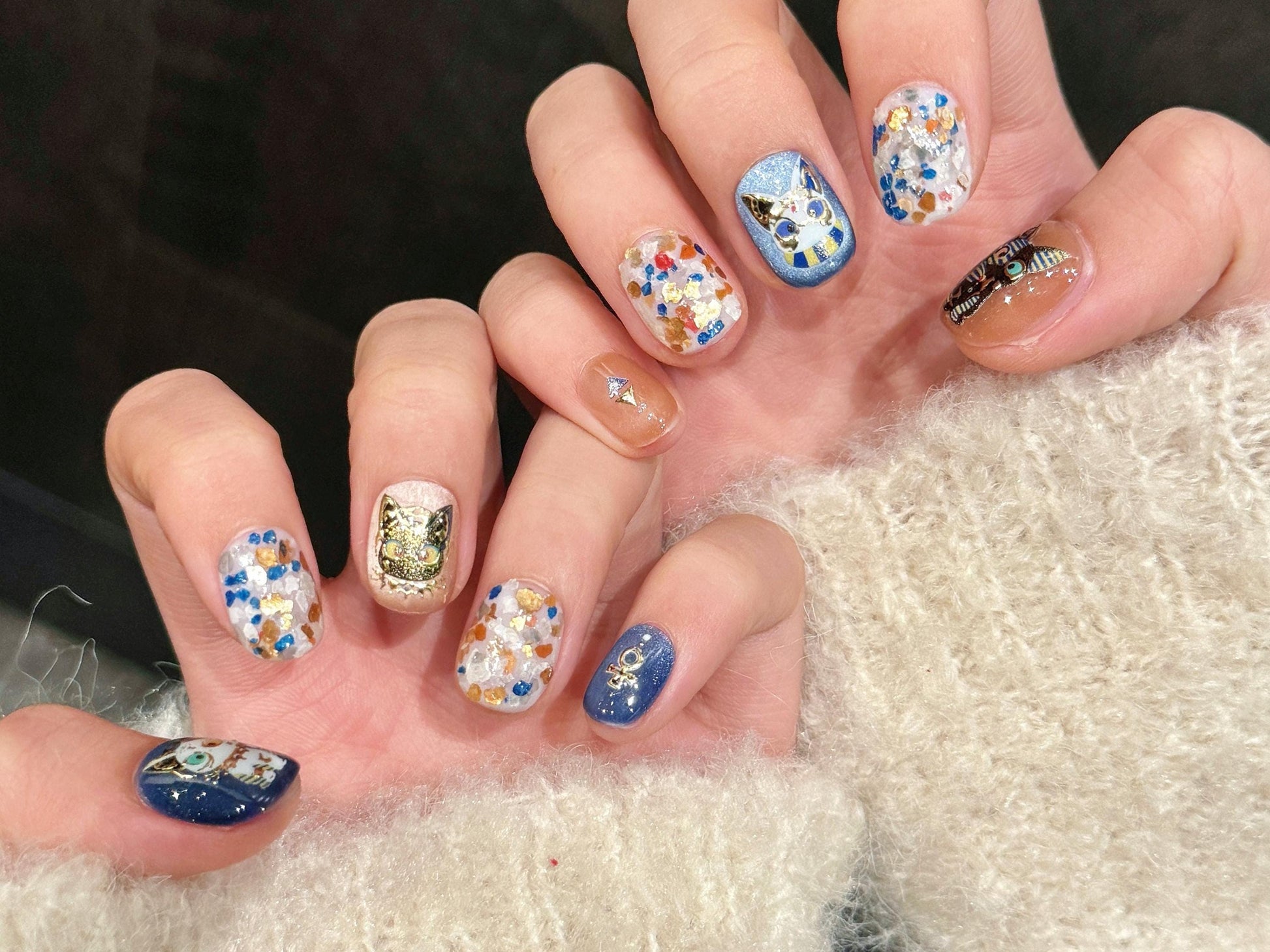 Show off your fun and creative side with these whimsical cat print press-on nails, featuring playful feline illustrations and sparkling blue, gold, and glitter accents. A perfect blend of charm and style for any occasion.