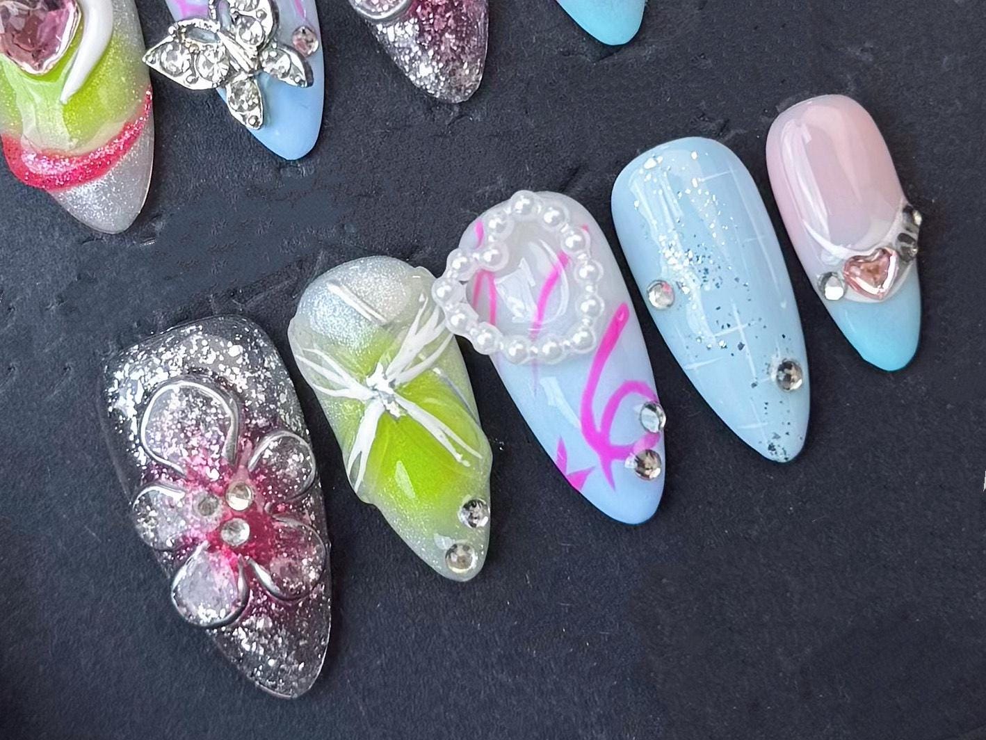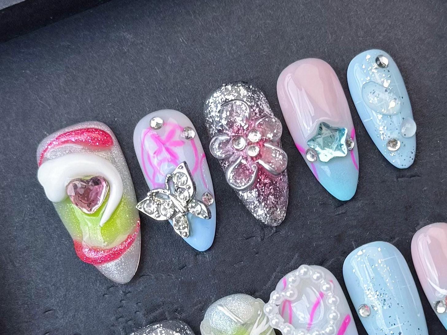 Step into a fantasy with this eclectic press-on nail set featuring shimmering glitter, pastel tones, pearl accents, and 3D floral, heart, and star charms. Designed for dreamy days and magical nights, this set combines silver sparkle, neon swirls, and soft blues and pinks for a bold, whimsical look. Perfect for parties, cosplay, or everyday glam with a touch of fairytale.