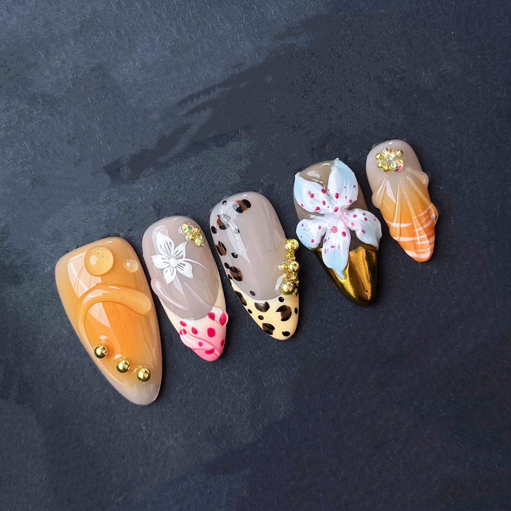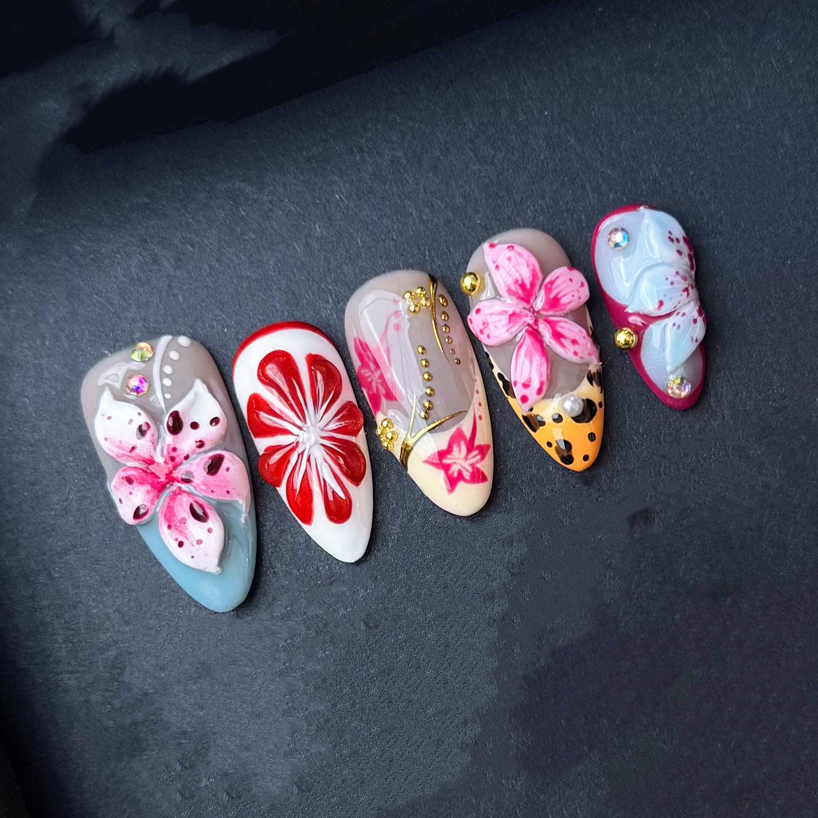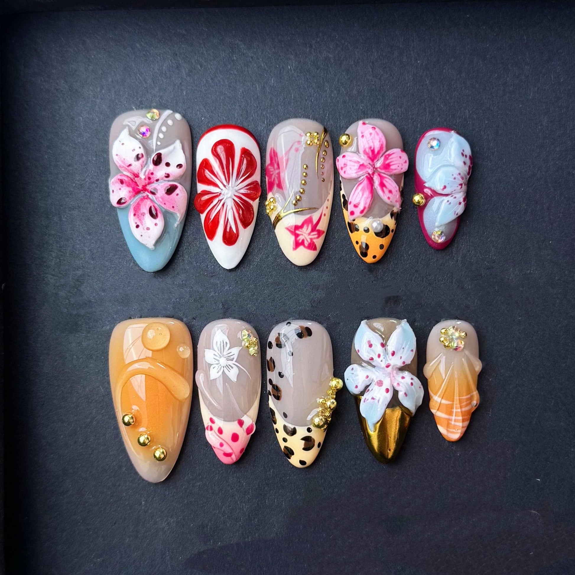 This fierce and colorful press on nail set features wild safari vibes with bold leopard prints playful polka dots rich florals and 3d blossoms in red pink and white. Accented with glossy finishes and gold details this set is perfect for tropical adventures or making a bold fashion statement.