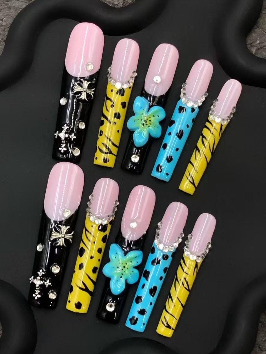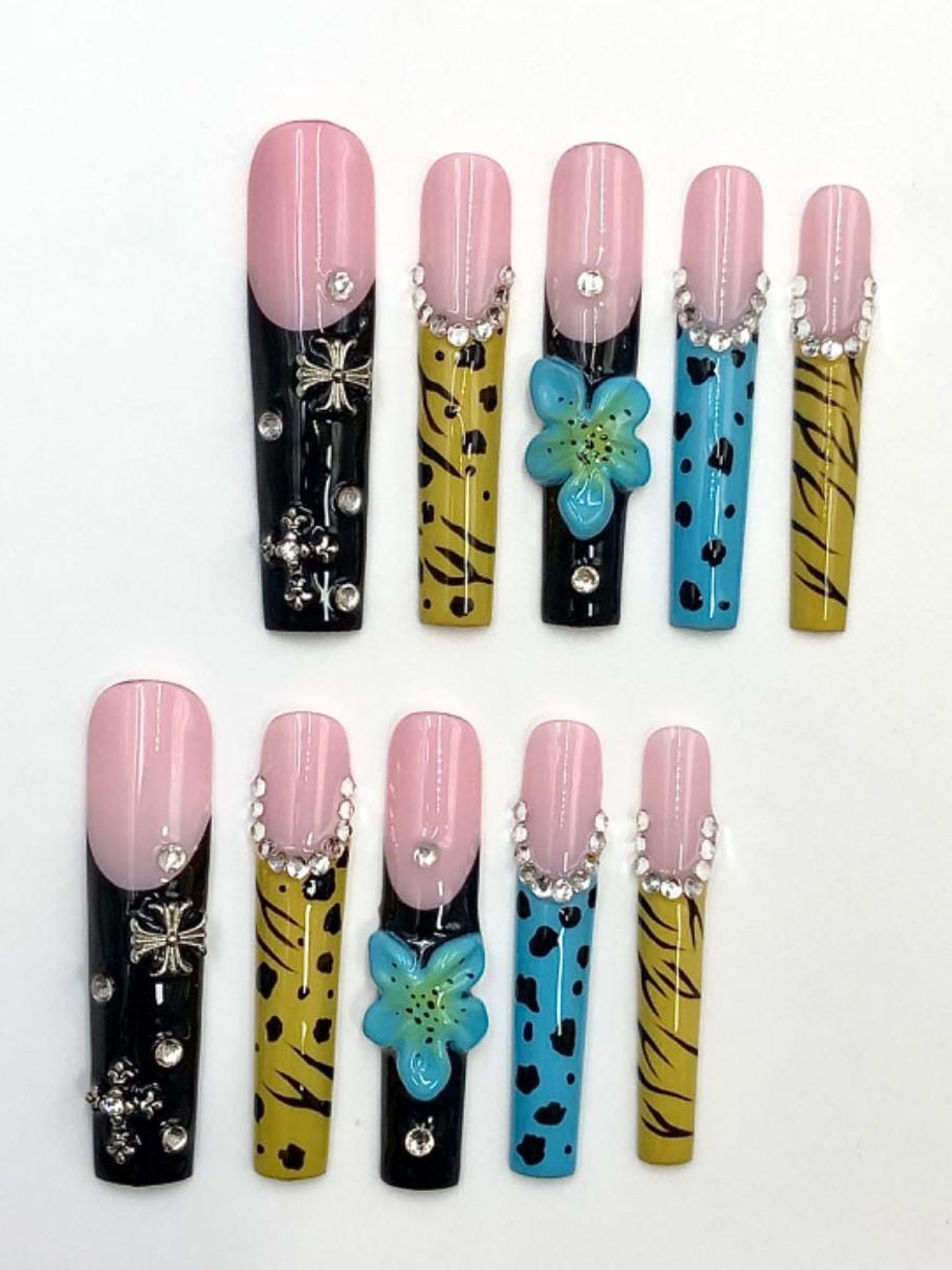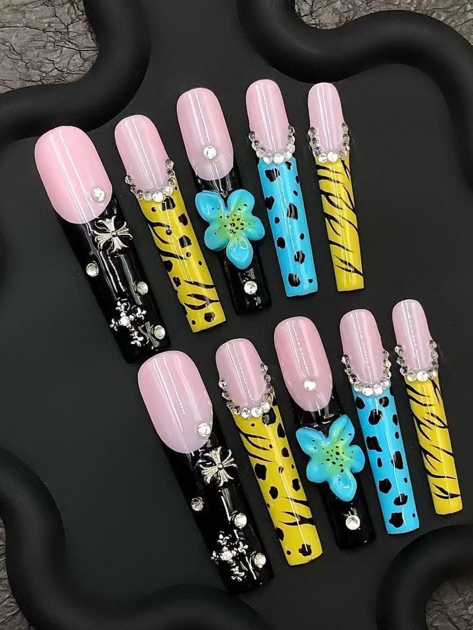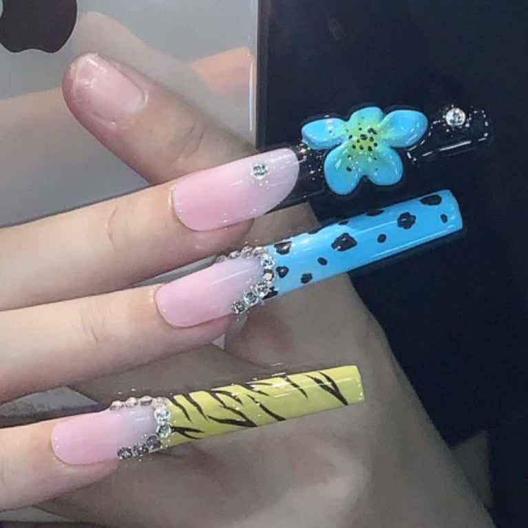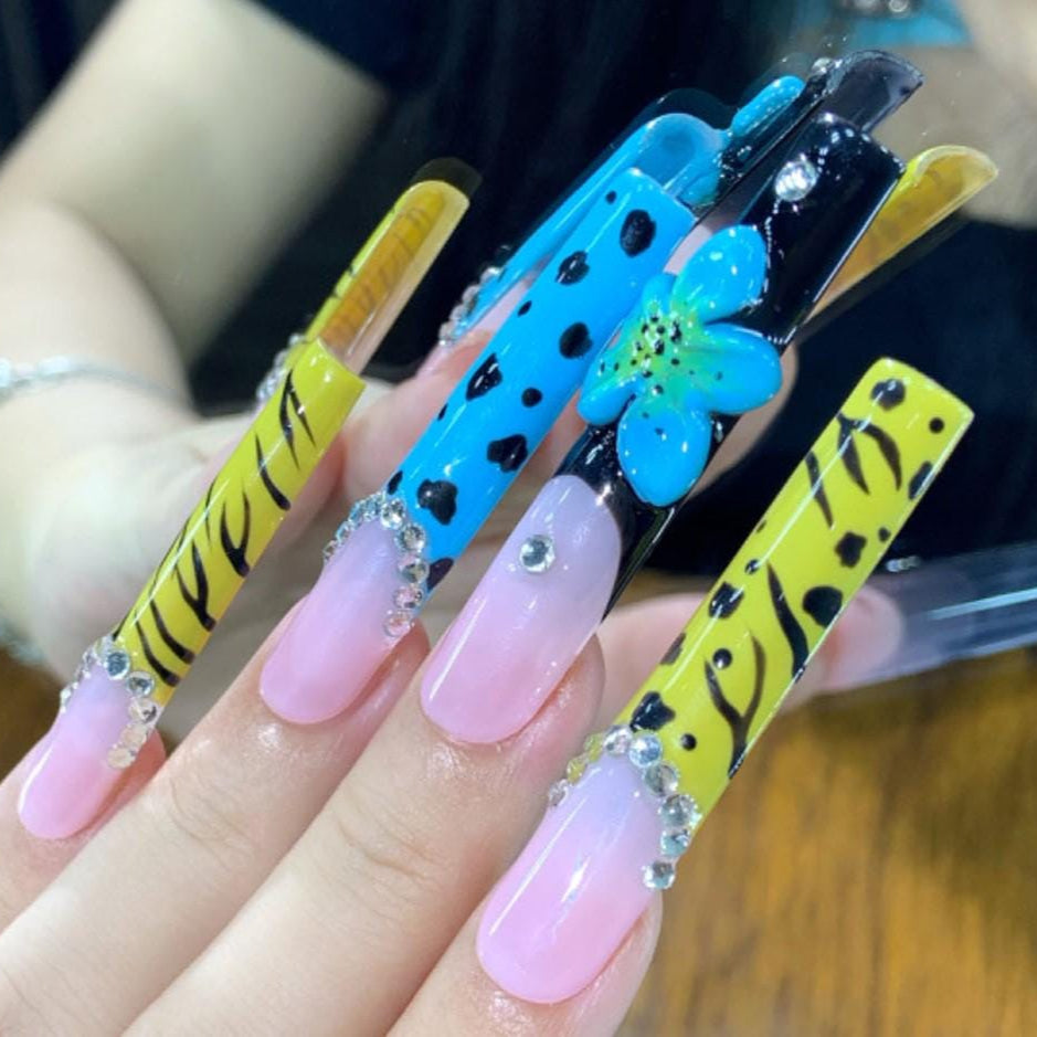 Unleash your inner wild side with this fierce press-on nail set featuring a bold mix of animal prints, pink French tips, rhinestone chains, and striking 3D blue flowers. With accents of black, yellow, and turquoise, this eclectic design brings Y2K glam and jungle energy together for a look that’s perfect for festivals, fashion statements, or standing out in style.