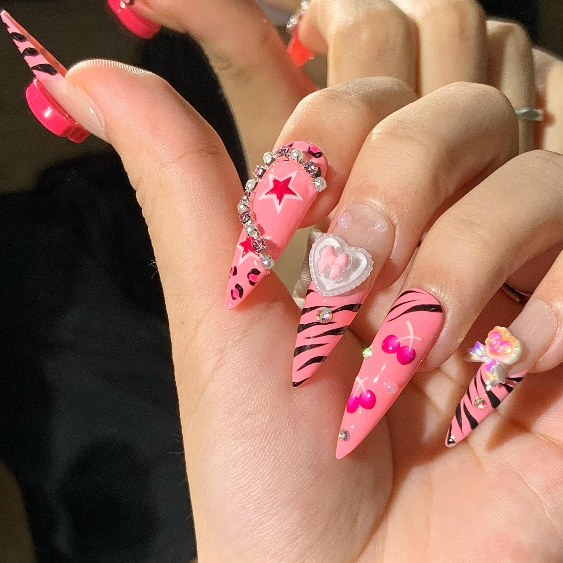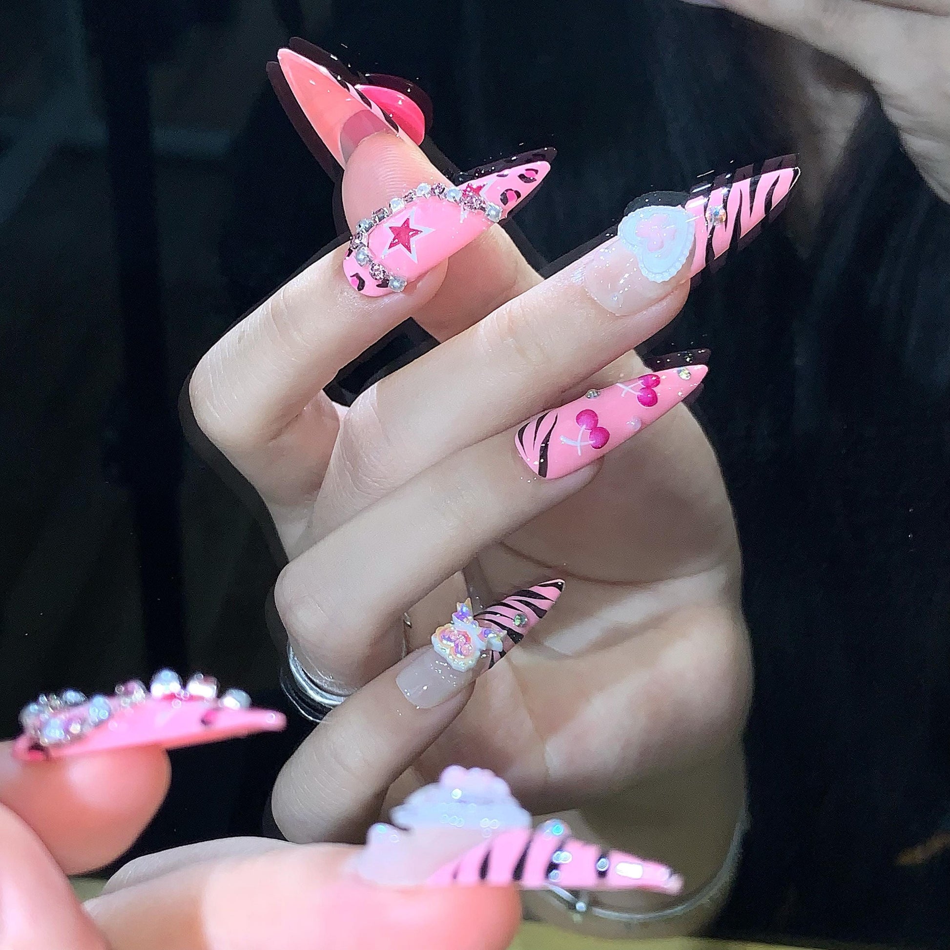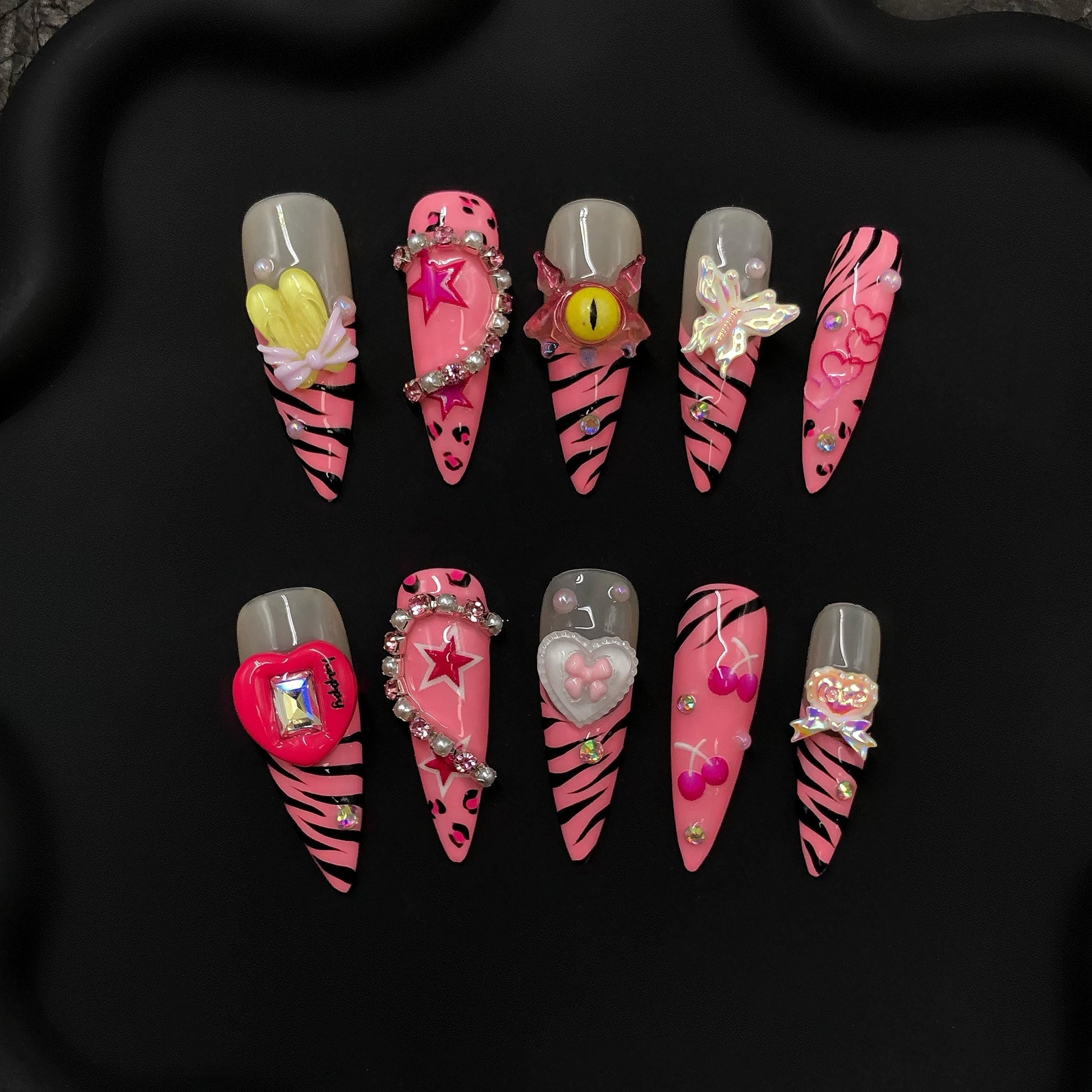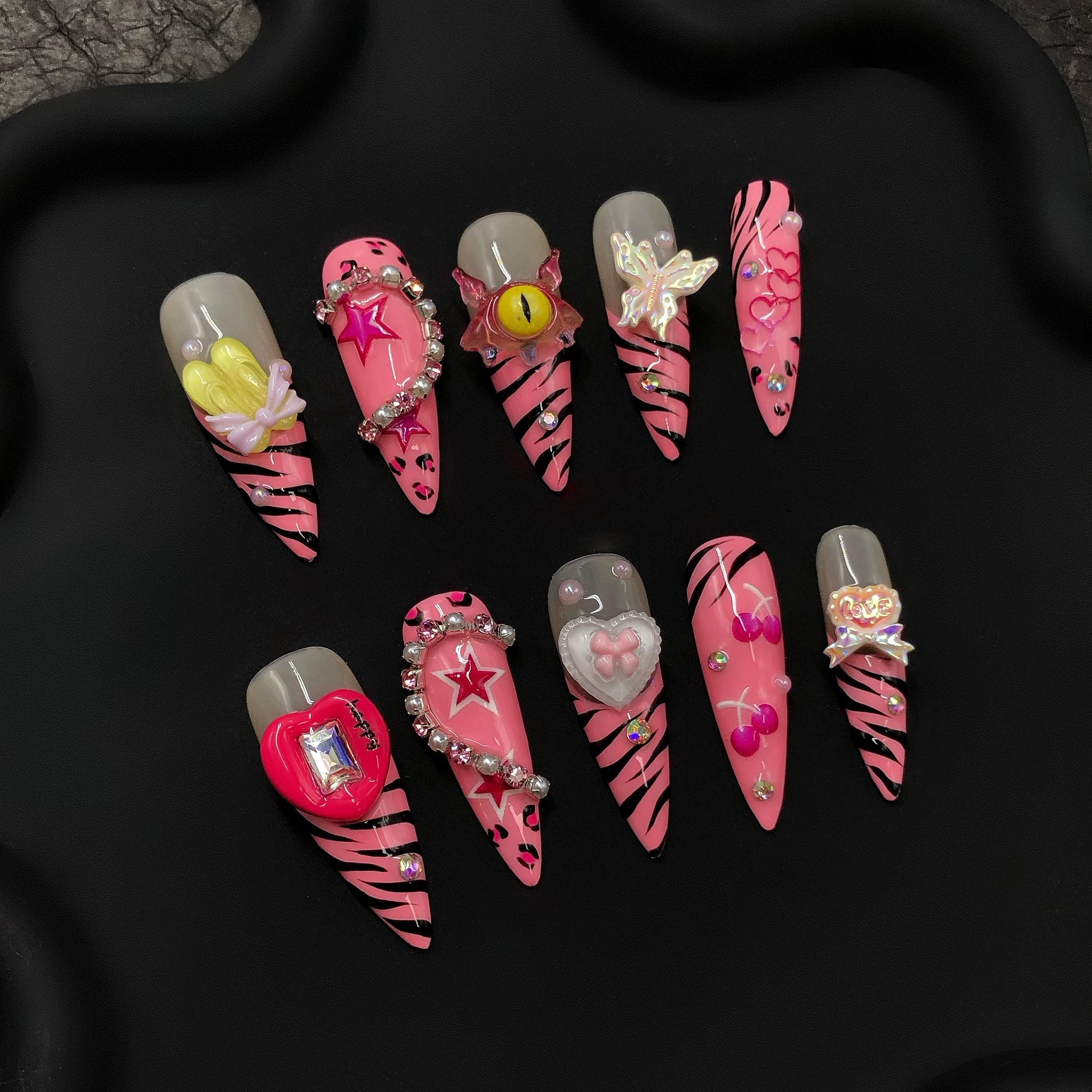 This eye-catching set of long stiletto press-on nails features a vibrant pink and black zebra print paired with glossy nude tips. Each nail is uniquely decorated with playful and eclectic 3D embellishments including stars, hearts, cherries, butterflies, rhinestones, and whimsical charms like an eye, a bow, and cartoon-style elements. The design channels a fun, edgy Y2K aesthetic with a strong dose of cuteness and attitude—perfect for those who love bold, statement-making, and highly detailed nail art.