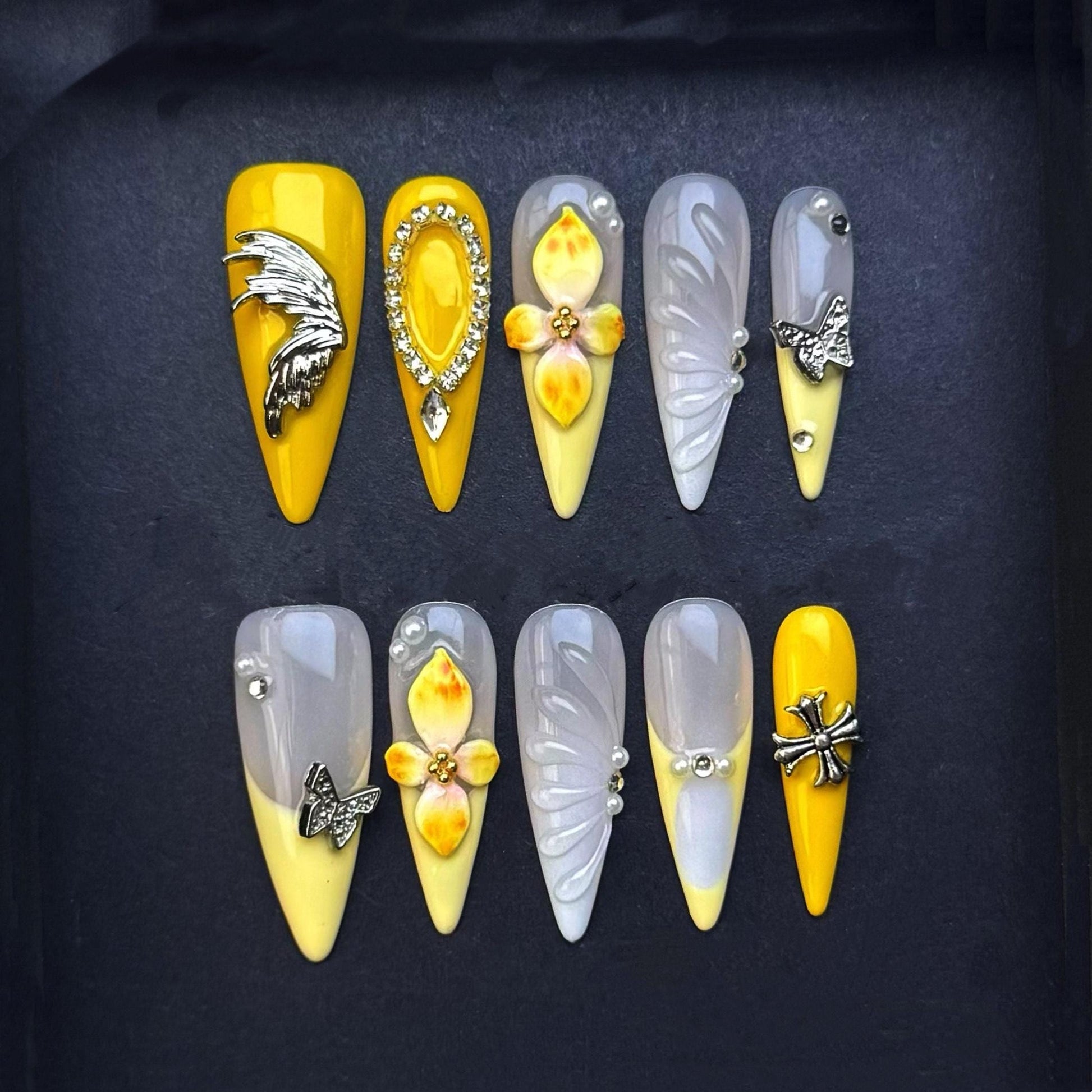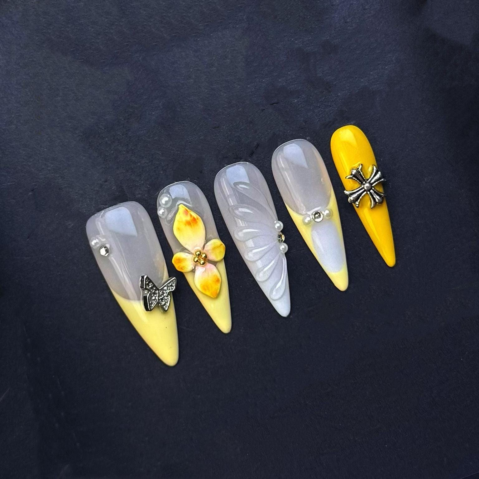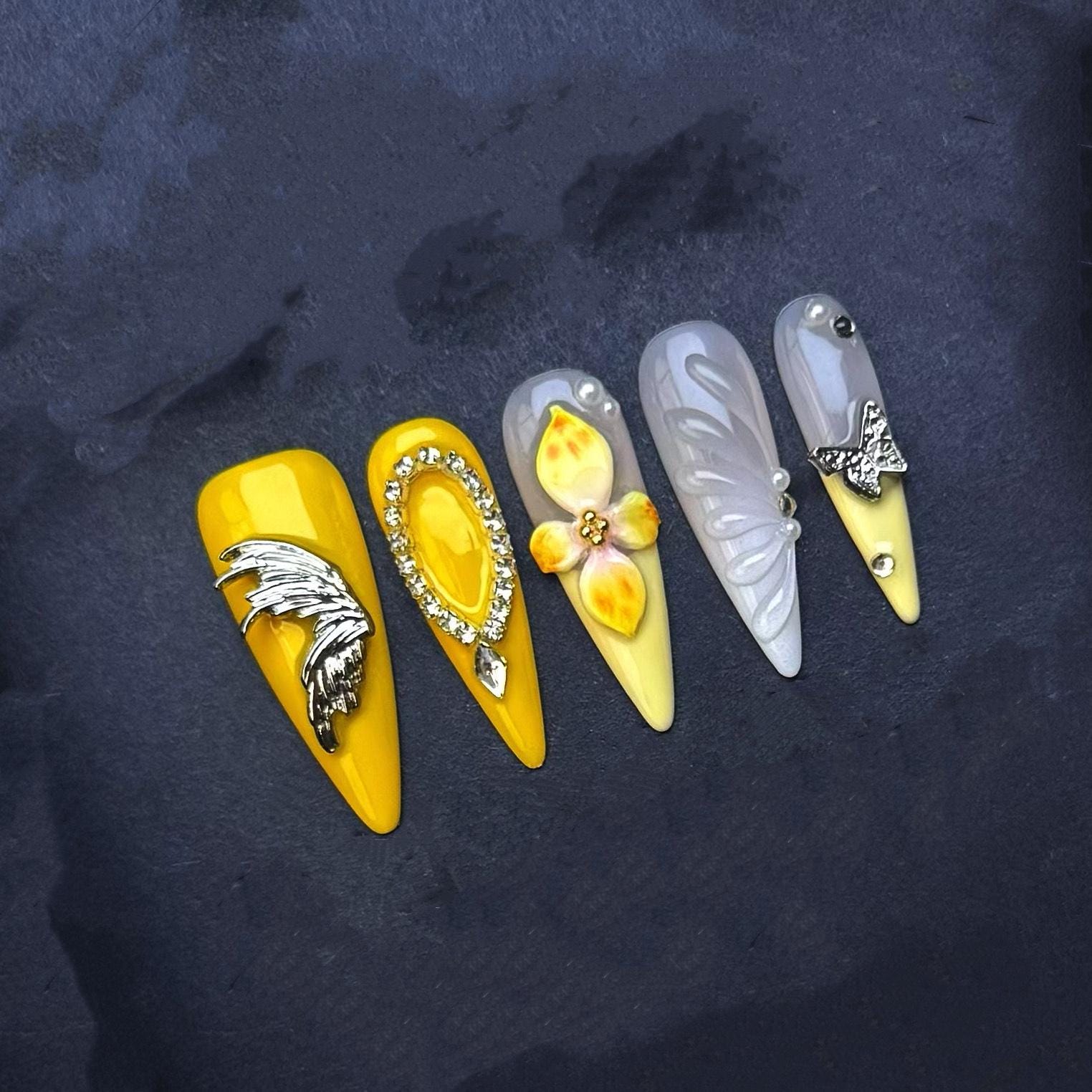 This stunning press on nail set features a radiant mix of yellow and grey tones with elegant 3D flowers delicate crystal embellishments and metallic charms Each nail is handcrafted with sculpted accents and shimmering details perfect for a bold and elegant look that stands out